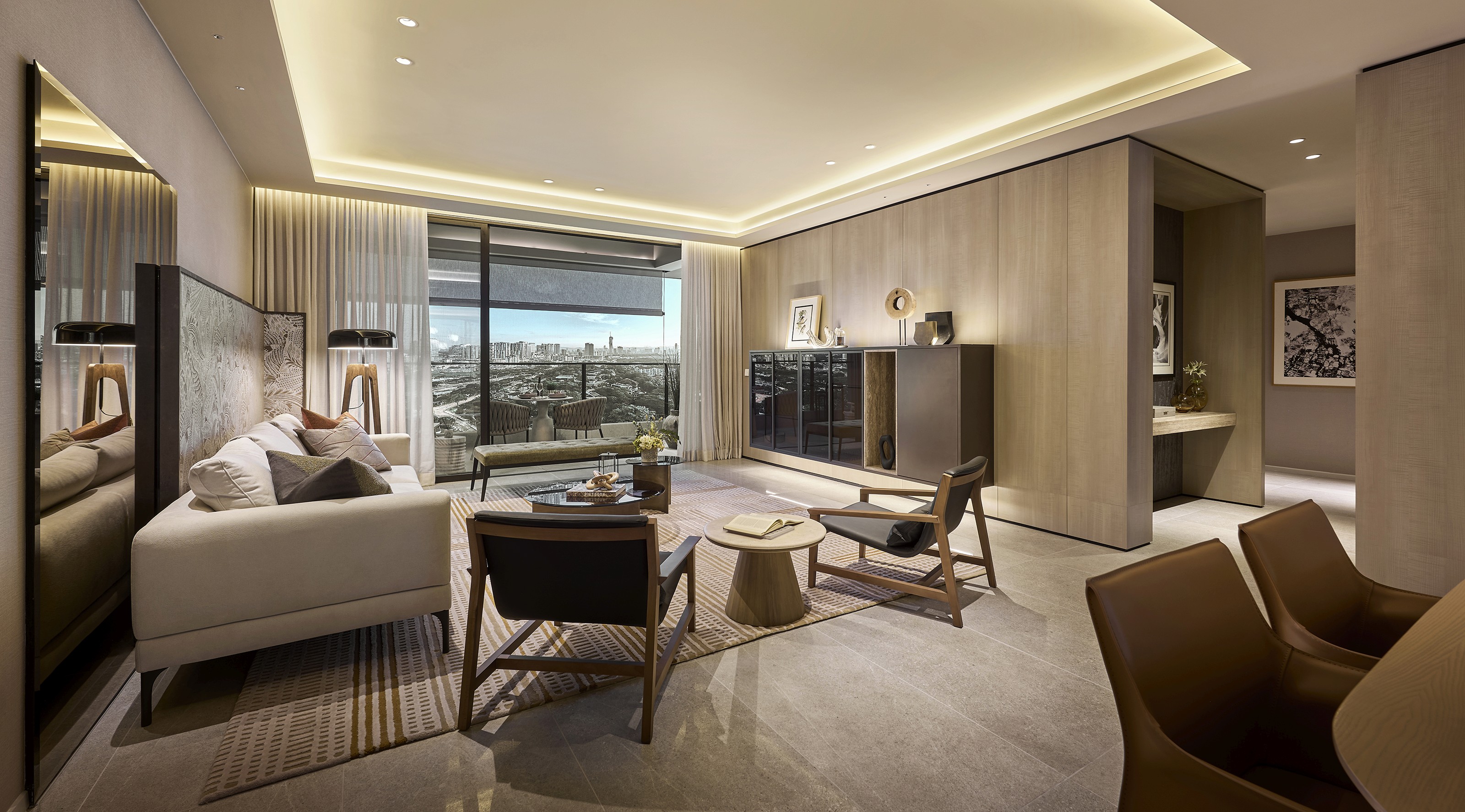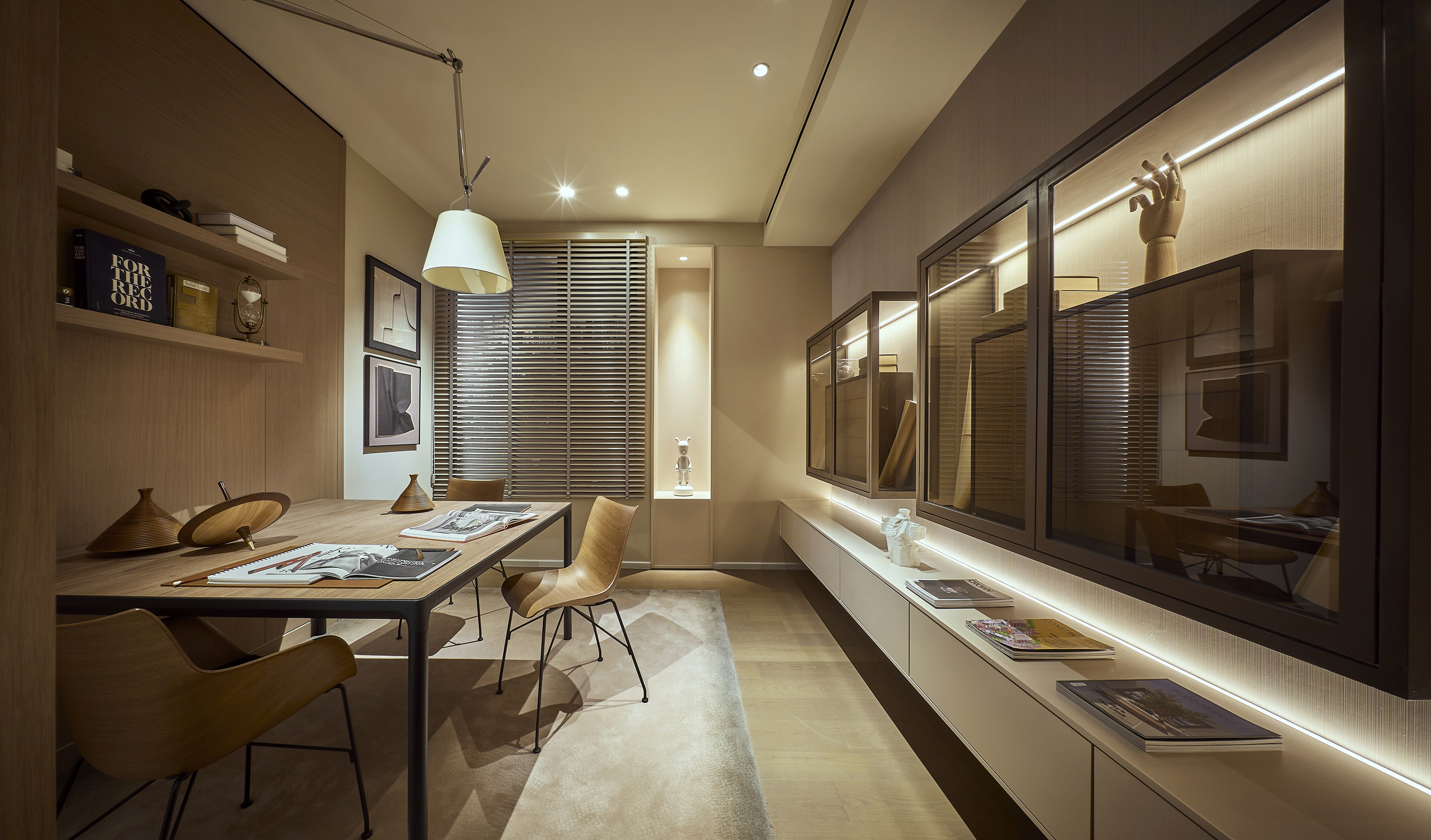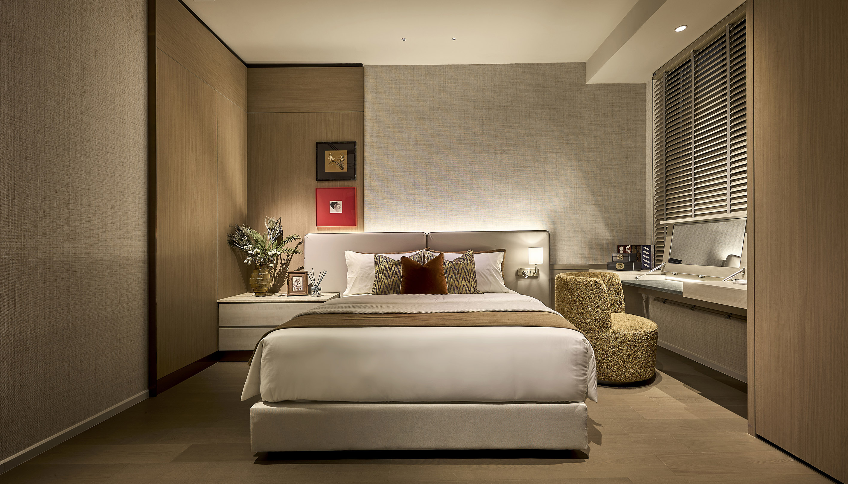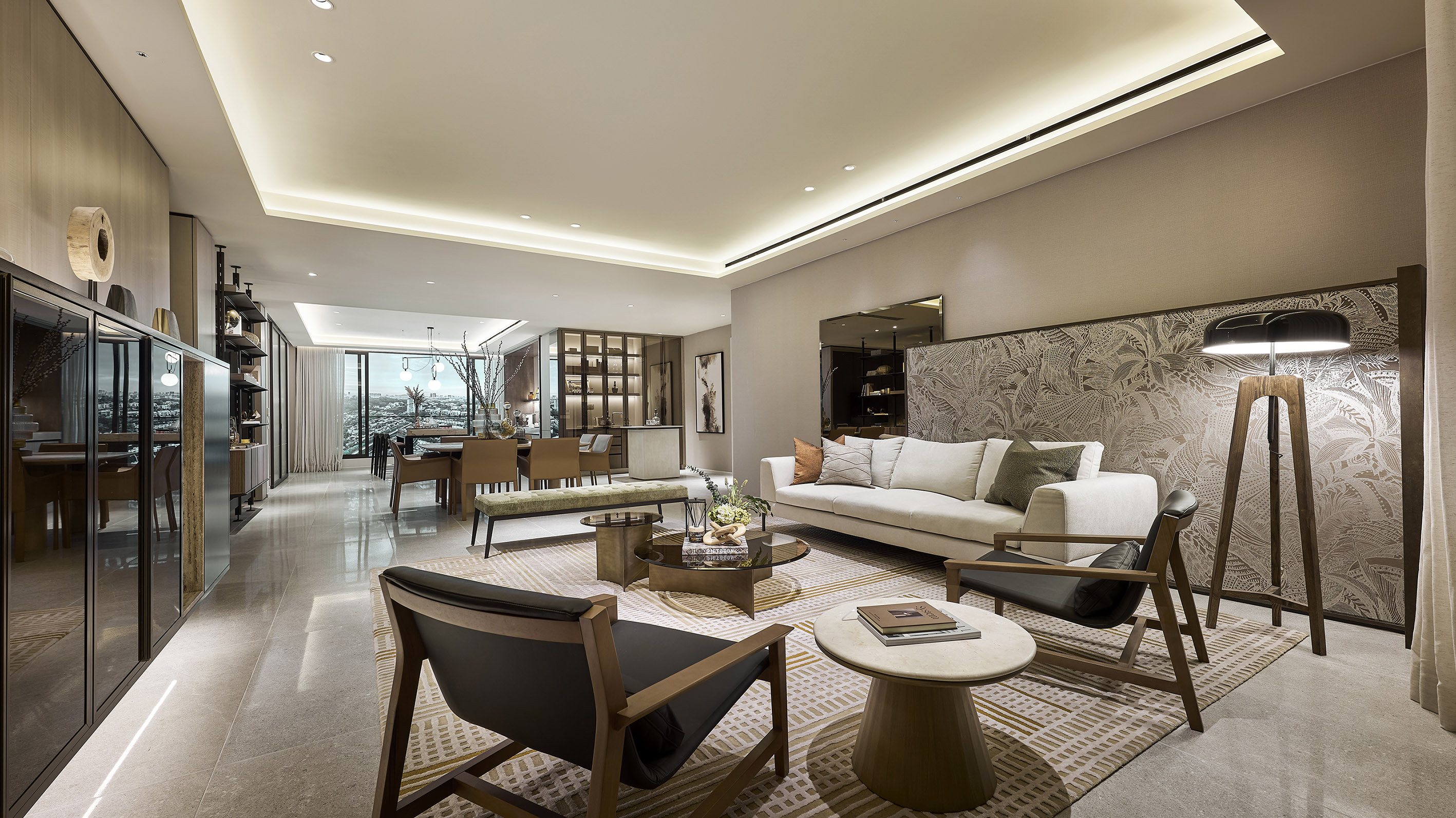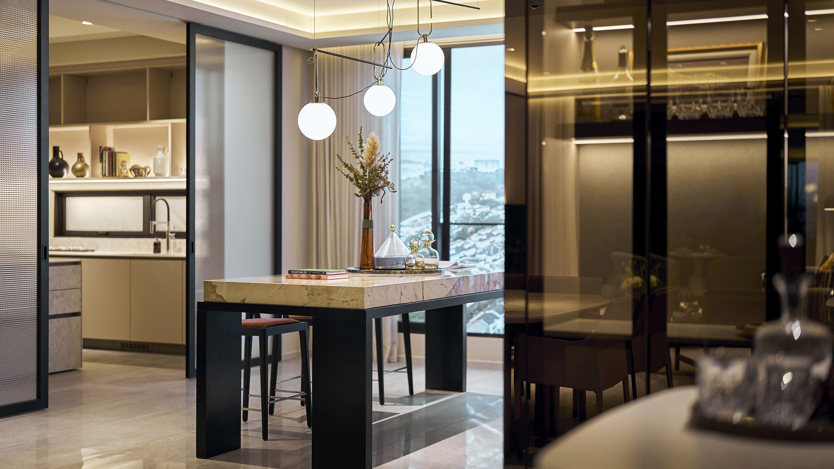 The Aetas Seputeh Show Unit in the quaint Seputeh neighbourhood epitomises a refined blend of modern innovation and natural tranquility. From the private lift lobby, guests are greeted by an elegant eight-seated timber dining table, set against a backdrop of understated luxury. This dining area seamlessly transitions into a cosy entertainment room with a black-textured backdrop and a large TV panel, perfect for unwinding. The dry kitchen’s dark tropical ambiance features a striking sintered stone island, leading to a practical wet kitchen. Bedrooms, each a sanctuary of calm with muted palettes and luxurious finishes, culminate in a master suite with bold, elegant design touches. Equal parts functionality and elegance, refined living is achieved through harmonious blend of design and materials, accessible and desired among urban folks. Modern materials, soothing colour schemes, and refined detailing allows the design to transcend beyond aesthetics – but with a human touch.