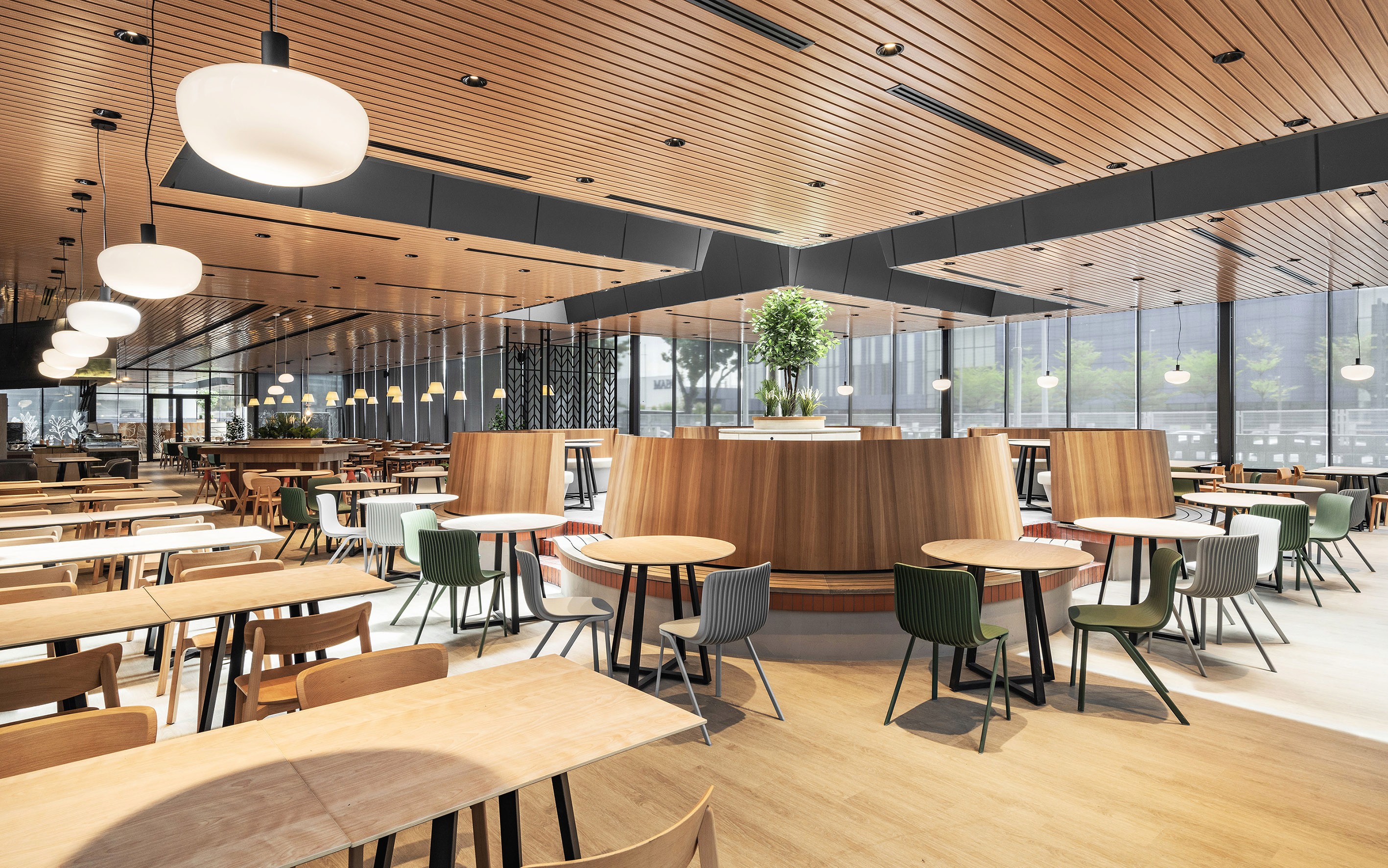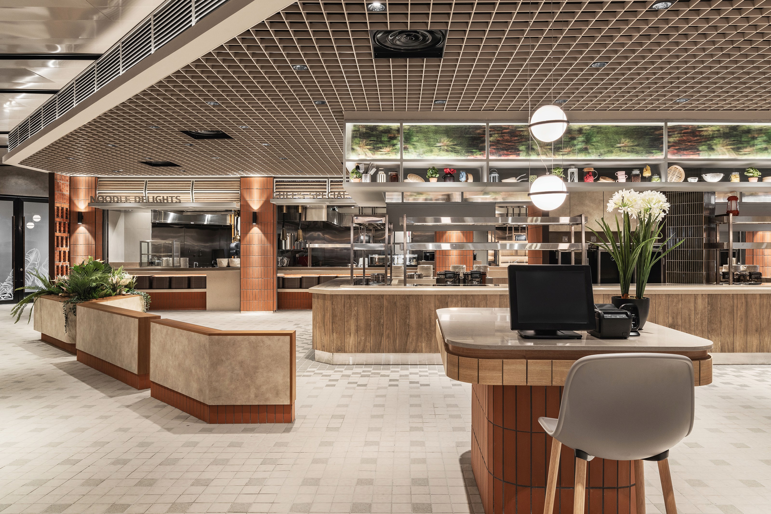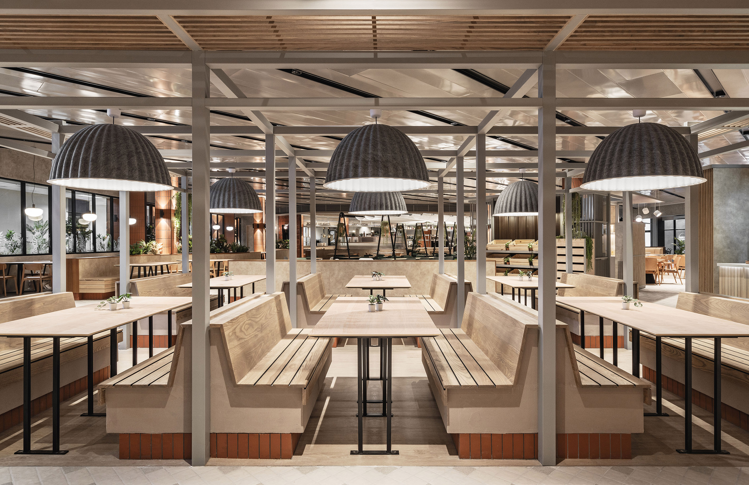 Seamless and strategic, the newly refurbished and extended cafeteria checks the bill for being empathetic, integrative, and emotional to its main users — the workforce of the office building. The organic space blurs the line between manmade and nature, reeling in a sense of space and a reenergising sensibility through simple lines and natural expressions. The entrance offers an overview of the space in entirety while the open kitchens provide the right amount of vim and vigour to the cafeteria. At the main market hall, there is an emphasis in its design narrative with an interplay of natural materials, textures and earth-tone materials to bring forth a soothing atmosphere. The concept of ‘dining in the park’ stands out with an indoor urban dining park that’s homed in a minimalist architectural silhouette — encouraging users to find reset while reconnecting with nature. Fluidity is name of the game as it creates a dynamic atmosphere within the newly extended complex. Through different modular components such as the two-sided seatings and the multiple islands, these fluid elements stand out as the centre of attention.