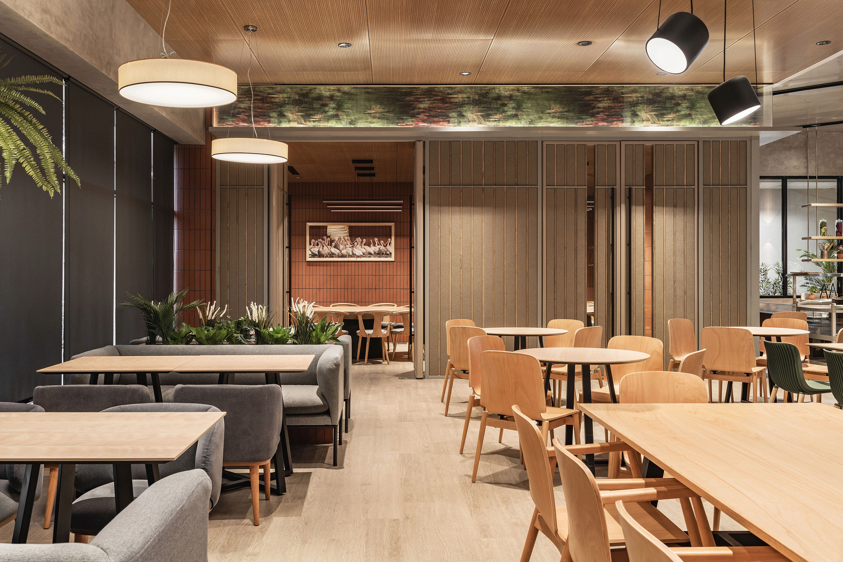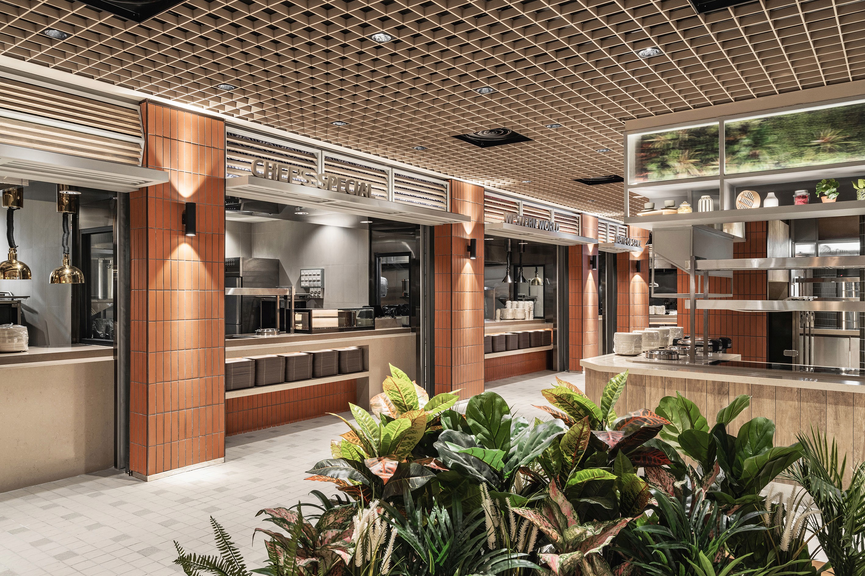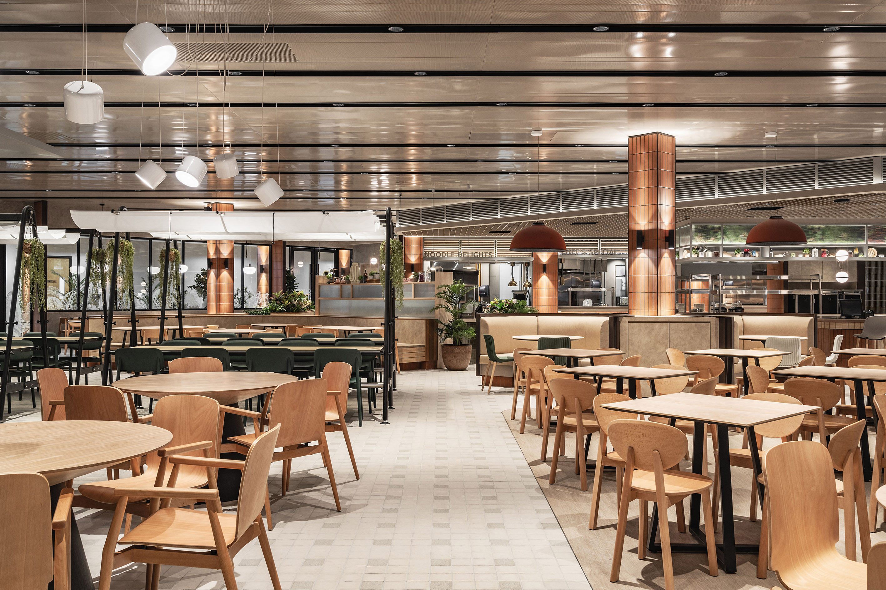 Seamless and strategic, the newly refurbished and extended cafeteria checks the bill for being empathetic, integrative, and emotional to its main users — the workforce of the office building. The organic space blurs the line between manmade and nature, reeling in a sense of space and a reenergising sensibility through simple lines and natural expressions. The entrance offers an overview of the space in entirety while the open kitchens provide the right amount of vim and vigour to the cafeteria. At the main market hall, there is an emphasis in its design narrative with an interplay of natural materials, textures and earth-tone materials to bring forth a soothing atmosphere. The concept of ‘dining in the park’ stands out with an indoor urban dining park that’s homed in a minimalist architectural silhouette — encouraging users to find reset while reconnecting with nature. Fluidity is name of the game as it creates a dynamic atmosphere within the newly extended complex. Through different modular components such as the two-sided seatings and the multiple islands, these fluid elements stand out as the centre of attention.