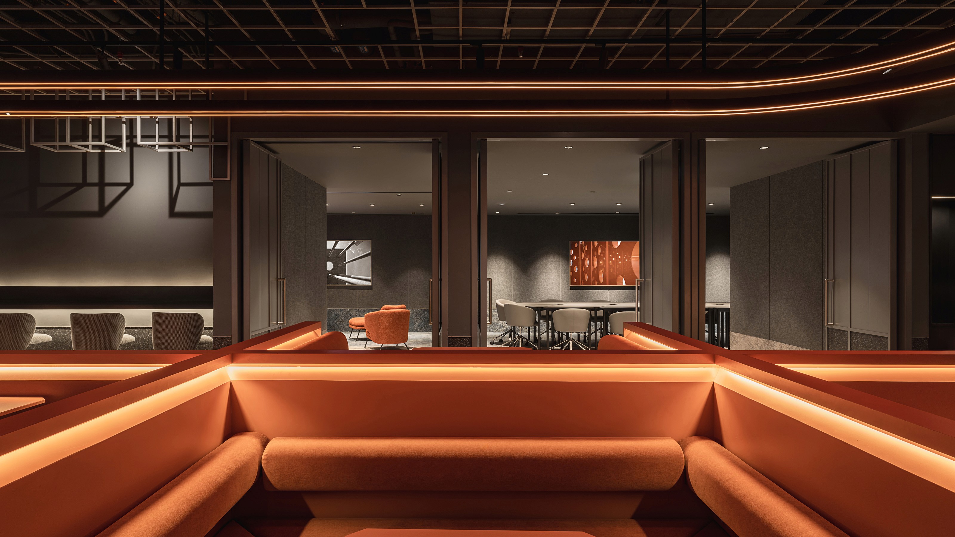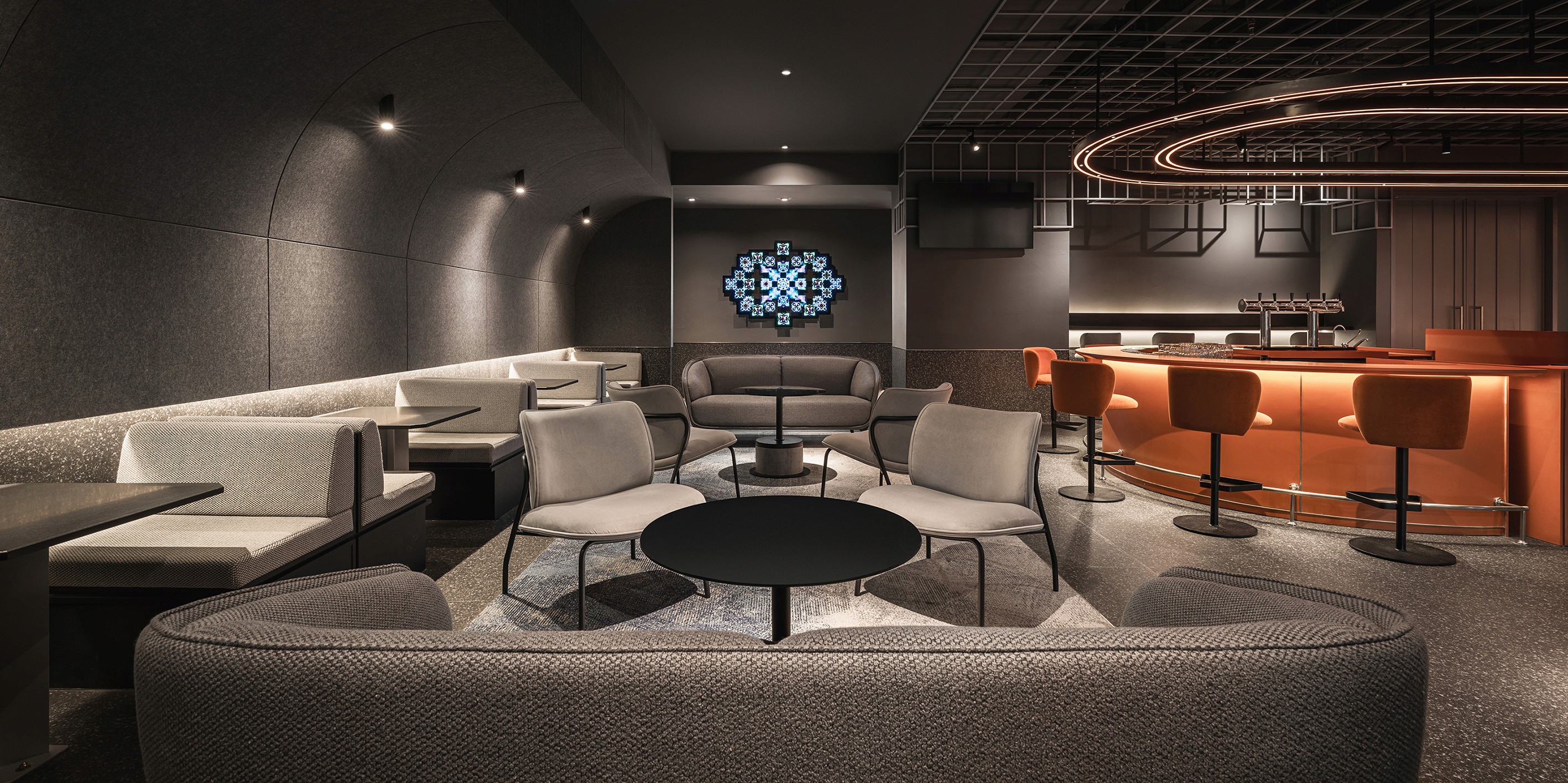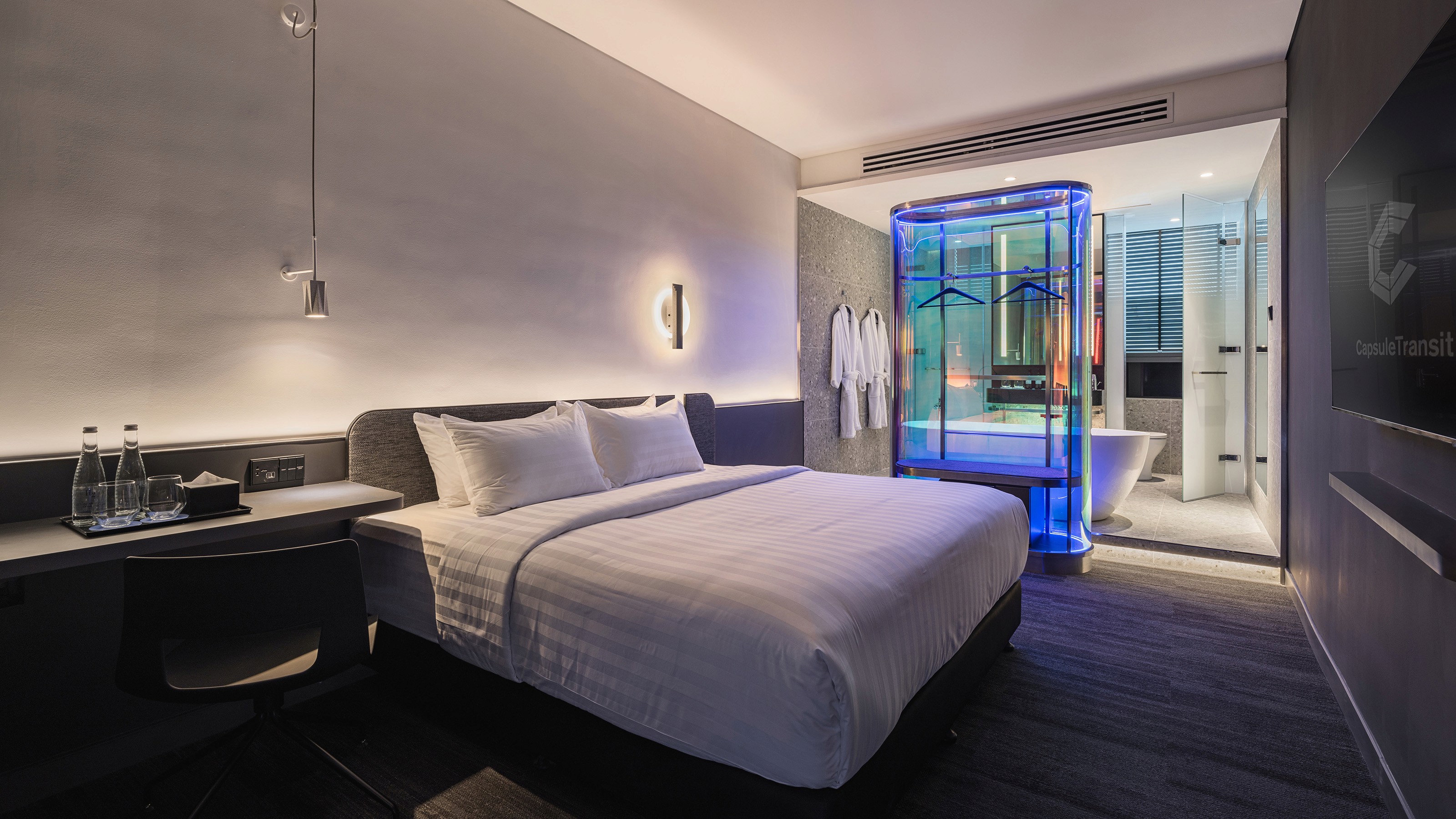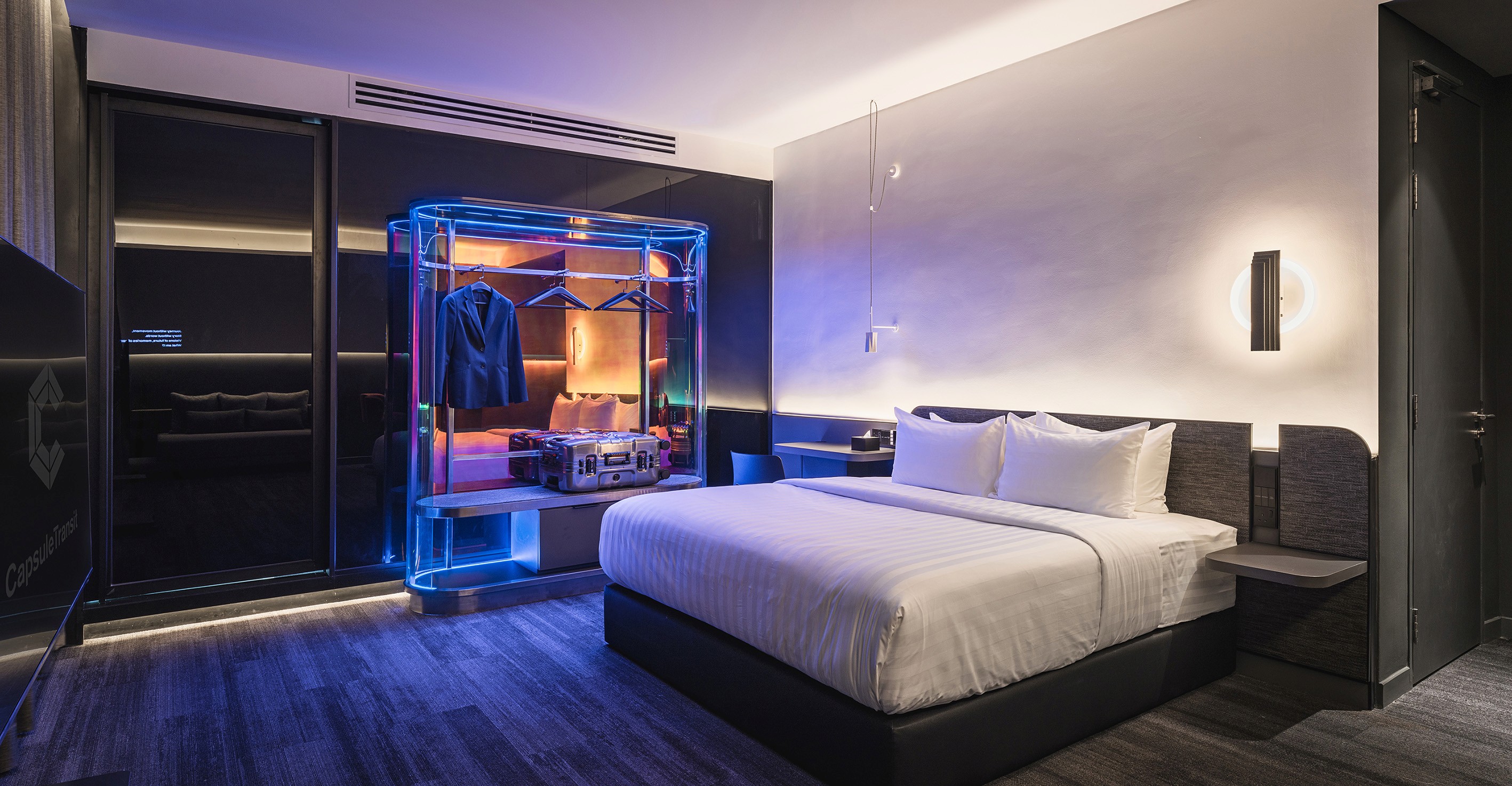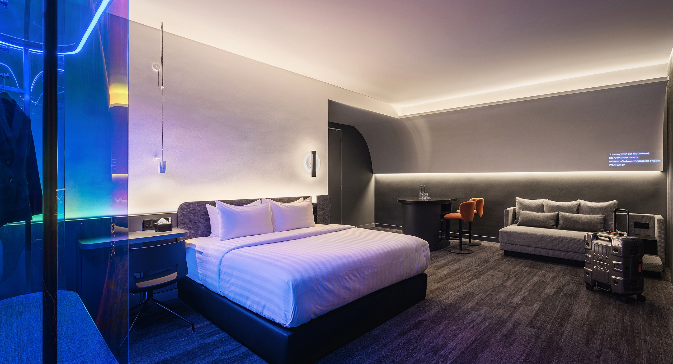 The design team has redefined the airport experience with Capsule Transit MAX at KLIA2, blending futuristic accents and chic elements of comfort. Inspired by the versatile nature of tin and Kuala Lumpur’s tin mining history, the space transitions from raw, angular forms to polished, curved elements, creating a sophisticated and welcoming environment. Upon entry, travellers encounter a striking façade of architectural fins, leading to a public area where clean lines and structured forms mix with earthy tones for a modern yet comforting atmosphere. The guestrooms feature chic, futuristic designs with cool blue lighting emanating from a central iridescent ‘lantern,’ which doubles a clothes rack and a spatial divider – creating a calming ambiance amid the travel bustle. The corridors offer an immersive journey through Malaysia’s landscapes, from lush rainforests to vibrant seascapes, enriched with local food illustrations and witty lingos. Capsule Transit MAX transforms transit into a memorable experience, merging aesthetics with functionality in a celebration of Malaysian culture.