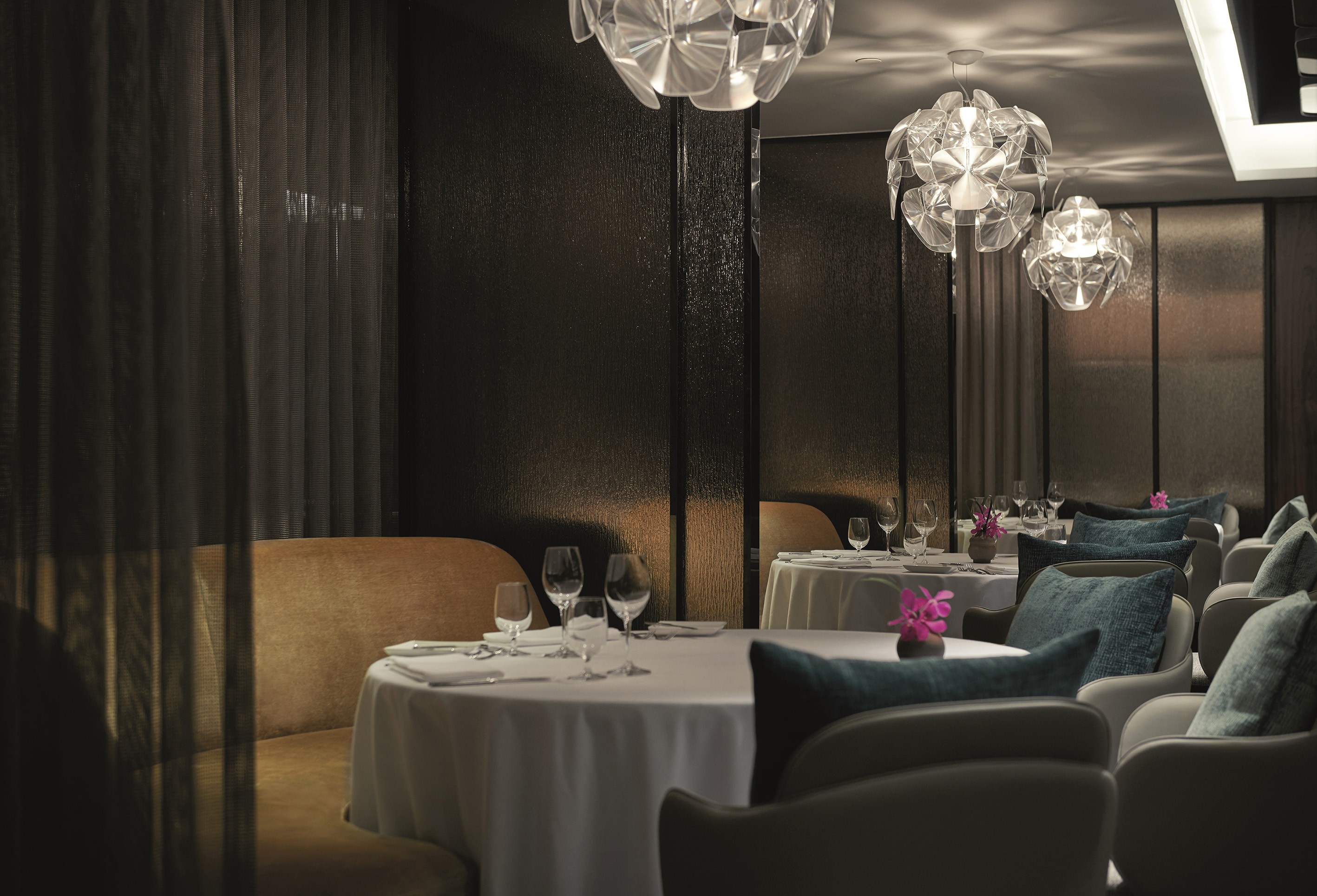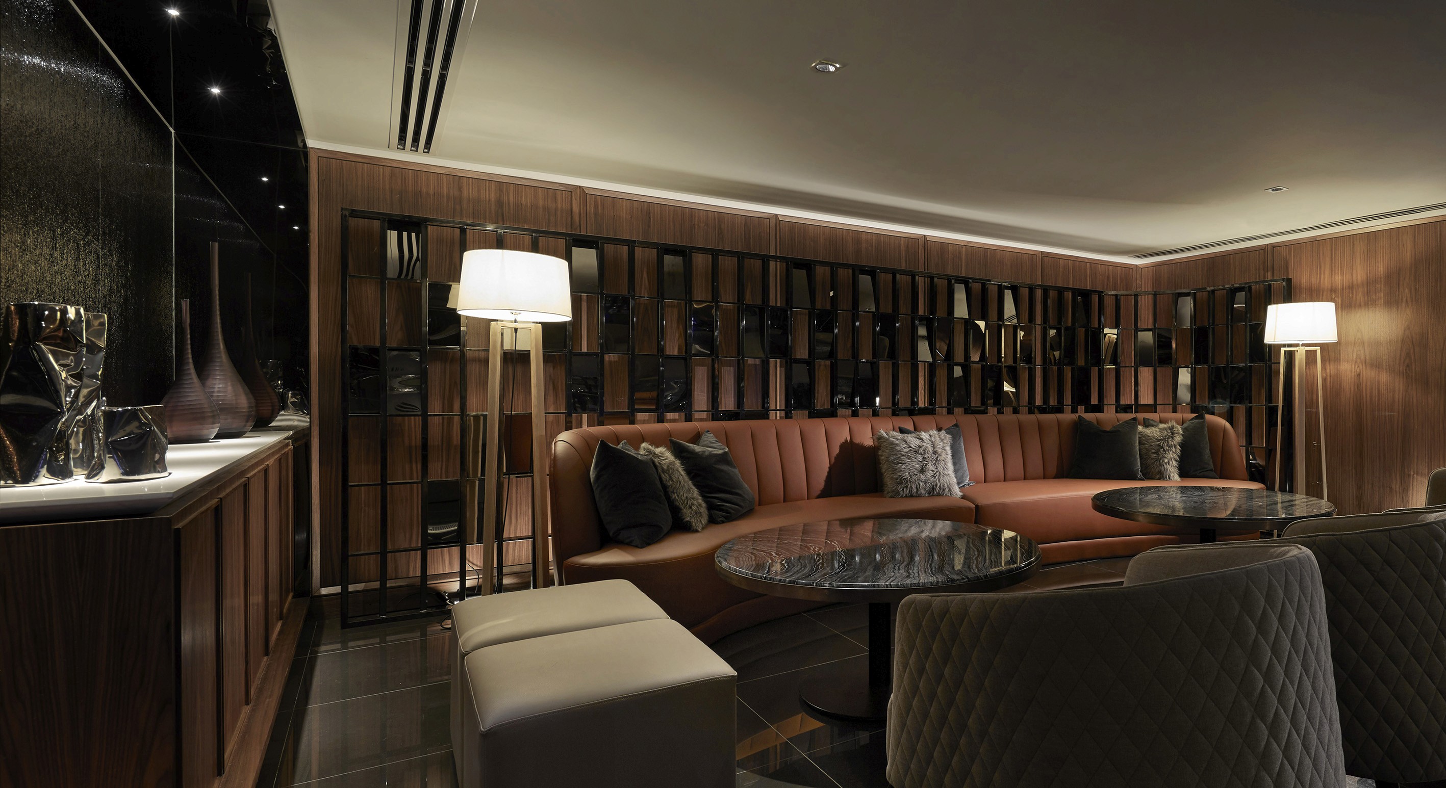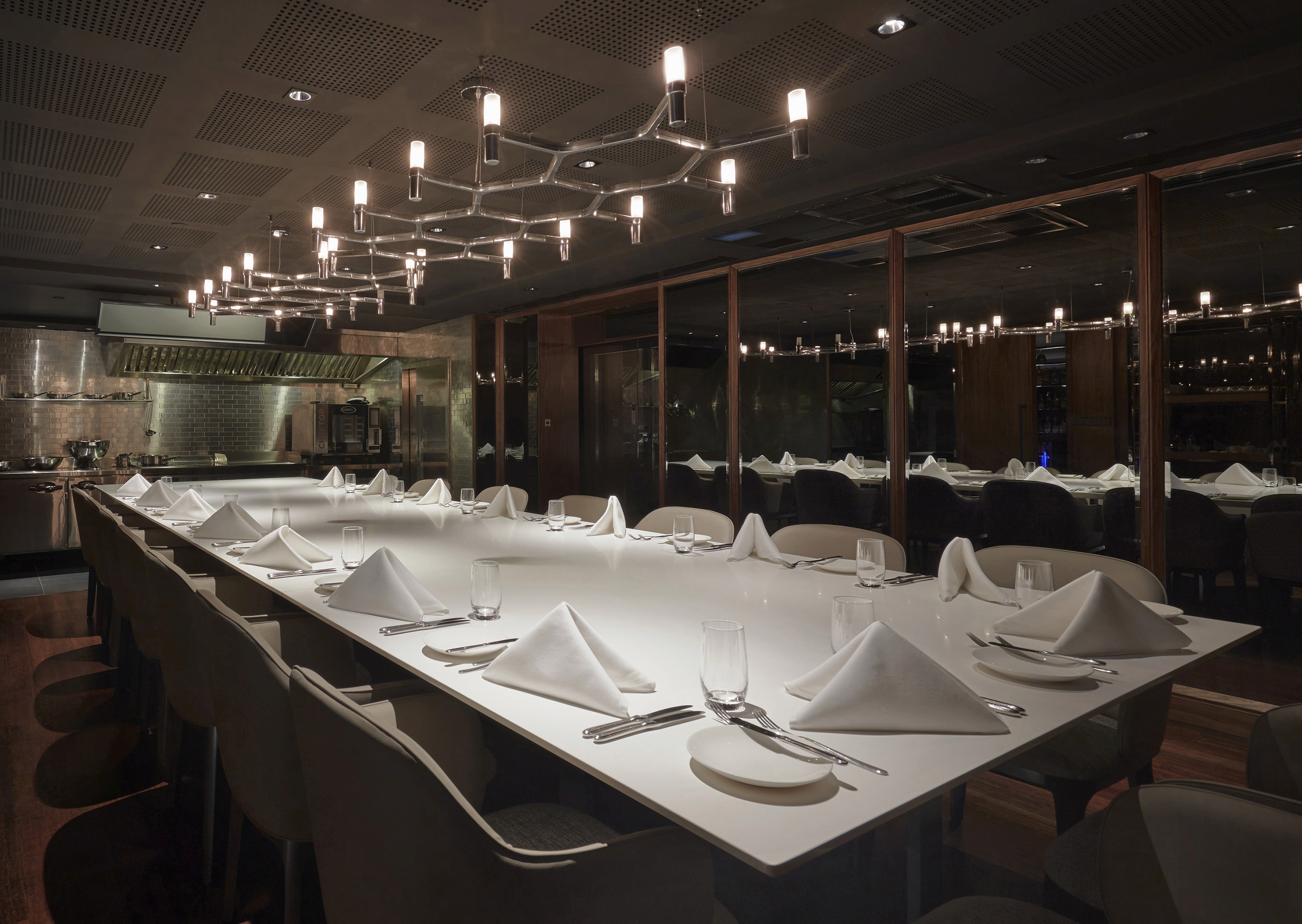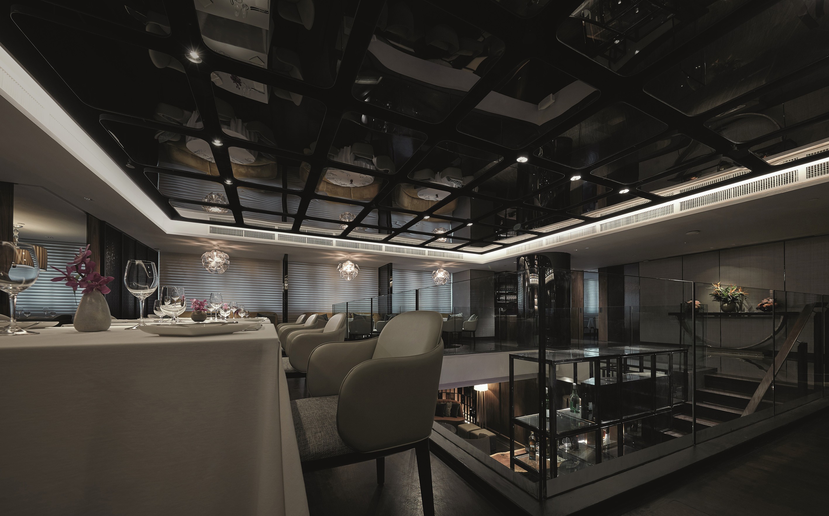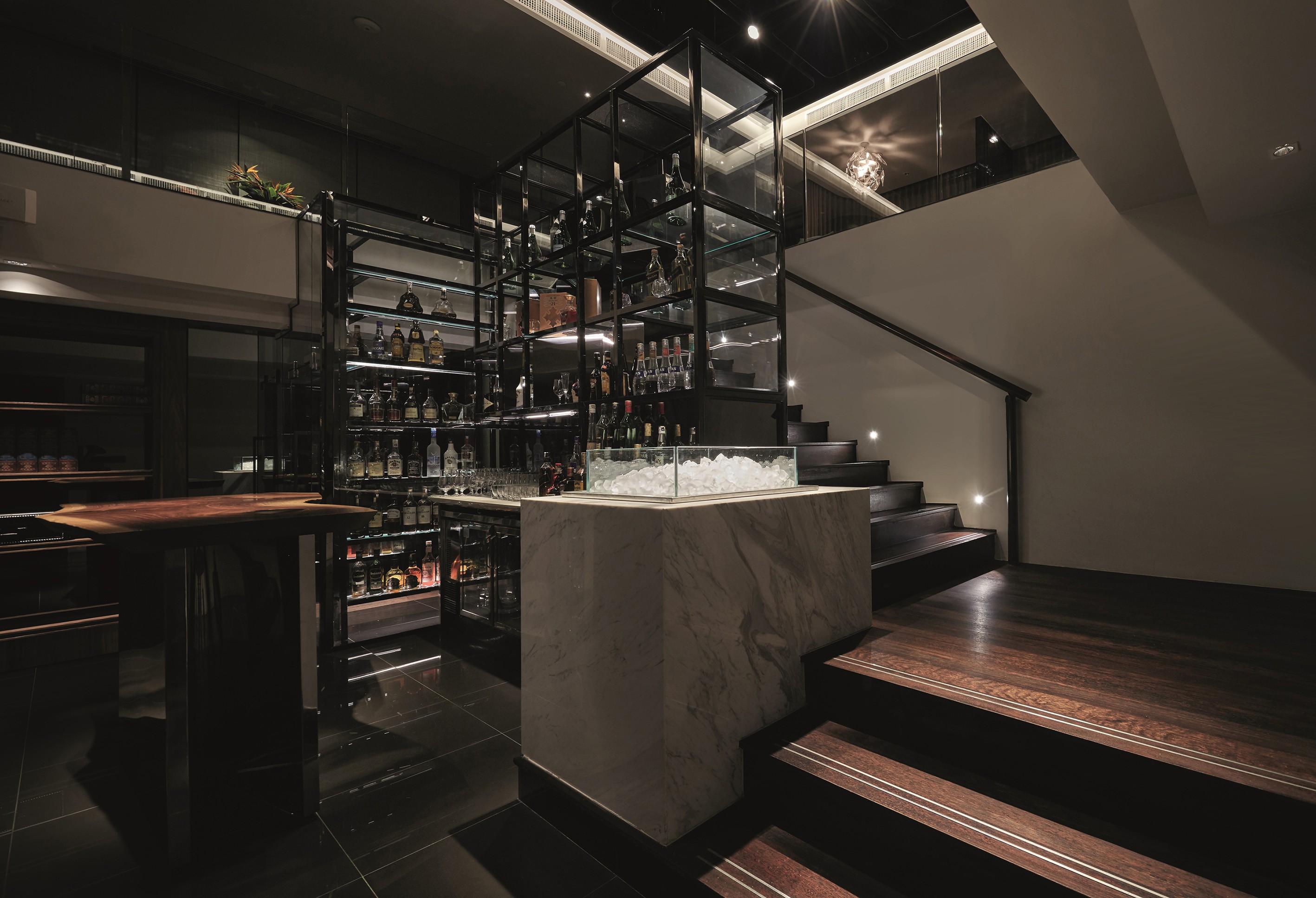 The restaurant consists of two levels – its upper floor serves as a venue for private dining, while the lower floor houses the bar lounge and the chef’s table. A stair-integrated wine display shelf sits at the center of the staircase void, making it a feature piece, and giving the restaurant its very own individuality. The chef’s table indulges its diners in a unique dining experience, where the chef prepares the meal at the end of a majestic five-meter-long quartz table. The bar lounge is situated across the chef’s table, where guests enjoy a session of drinking and mingling. Dark timber tones, burnt leather, and smoke greys veils the basement space to express a sophisticated and masculine atmosphere, imbued with dashes of neoclassical charm.