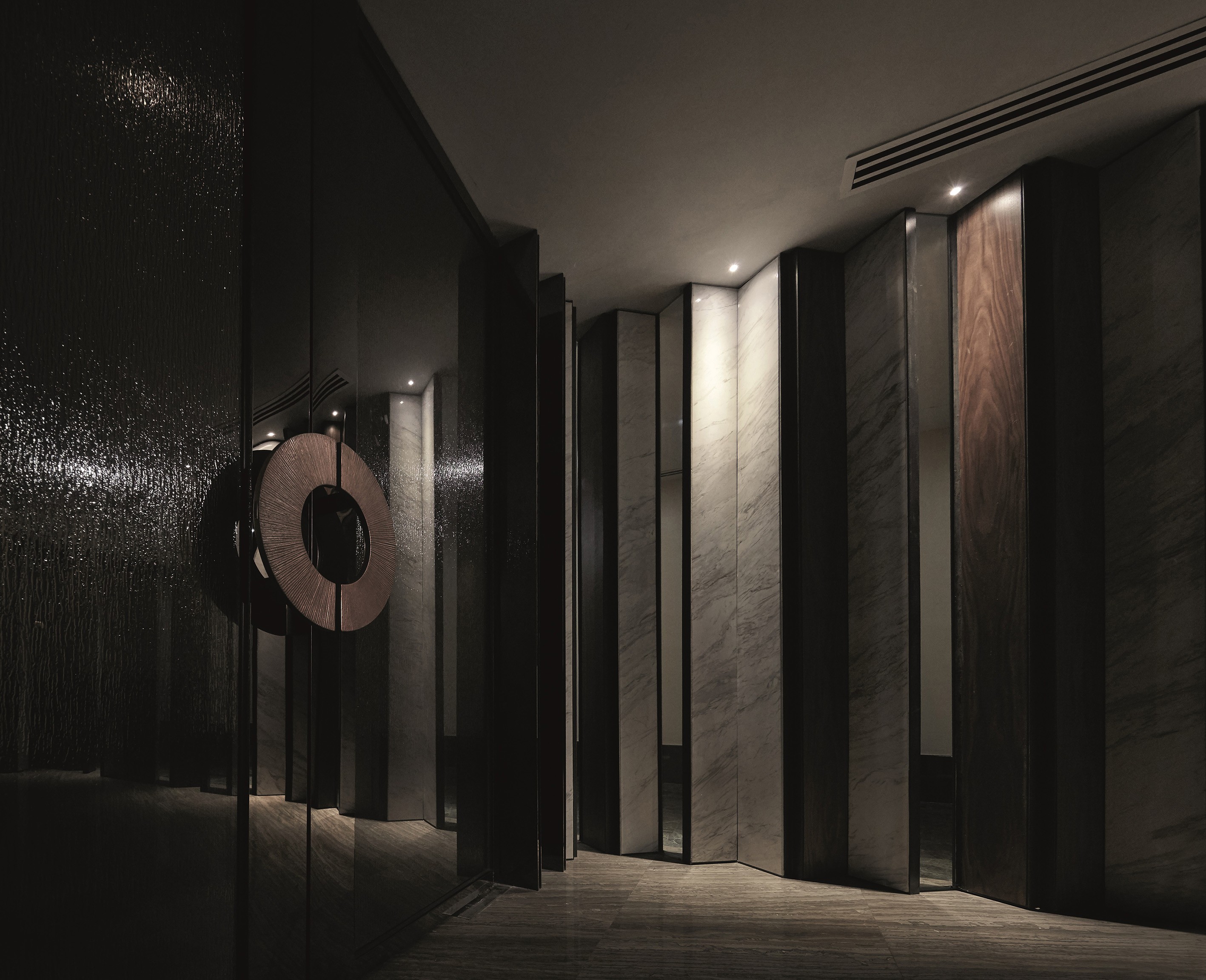 Entering Cilantro proves to be an enigmatic experience. Guests are greeted by a sleek entrance piece, which combines contrasting materials of walnut, marble, and glass, providing sheer privacy to diners while elevating curiosity of passers-by. Decorated by a pair of bespoke copper door handles, guests are later welcomed into the restaurant through a majestic textured glass door.