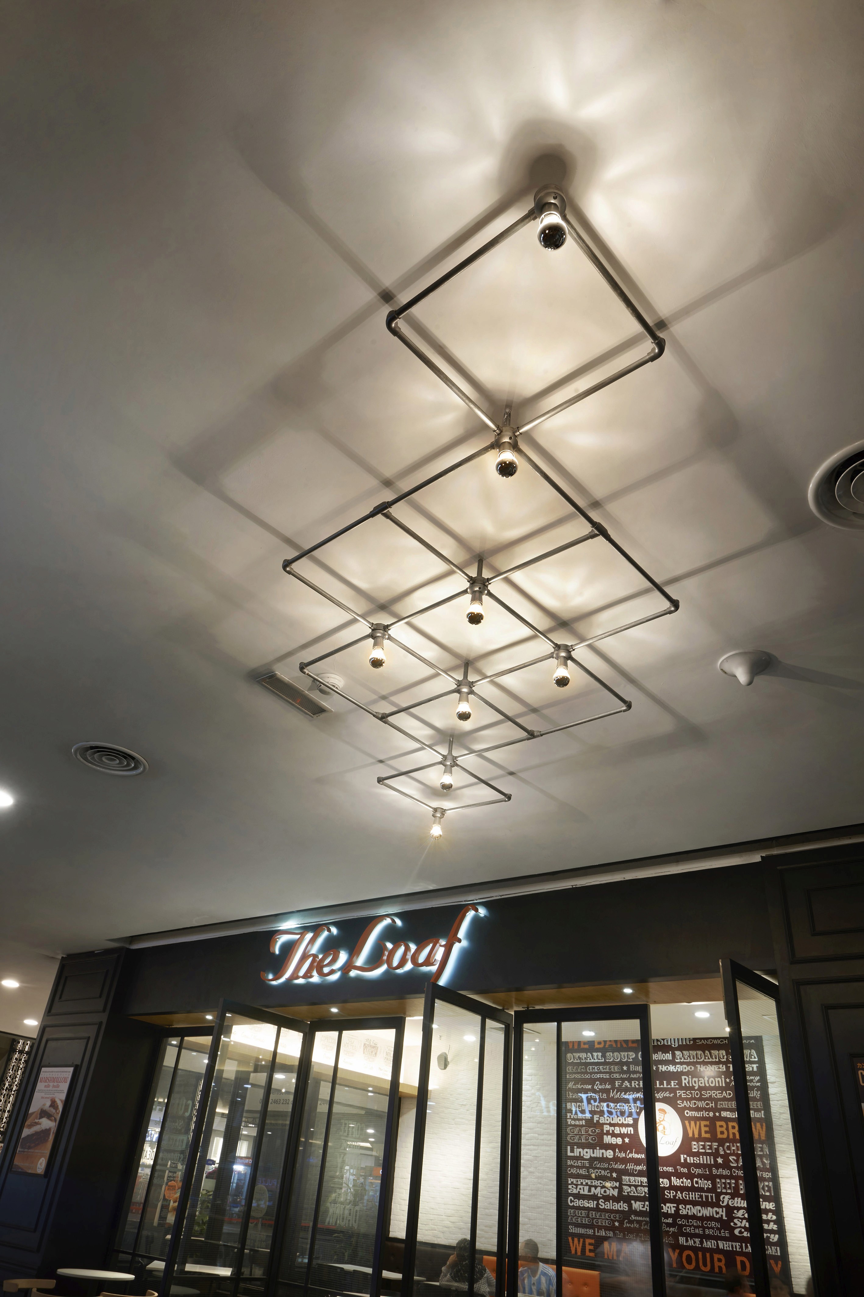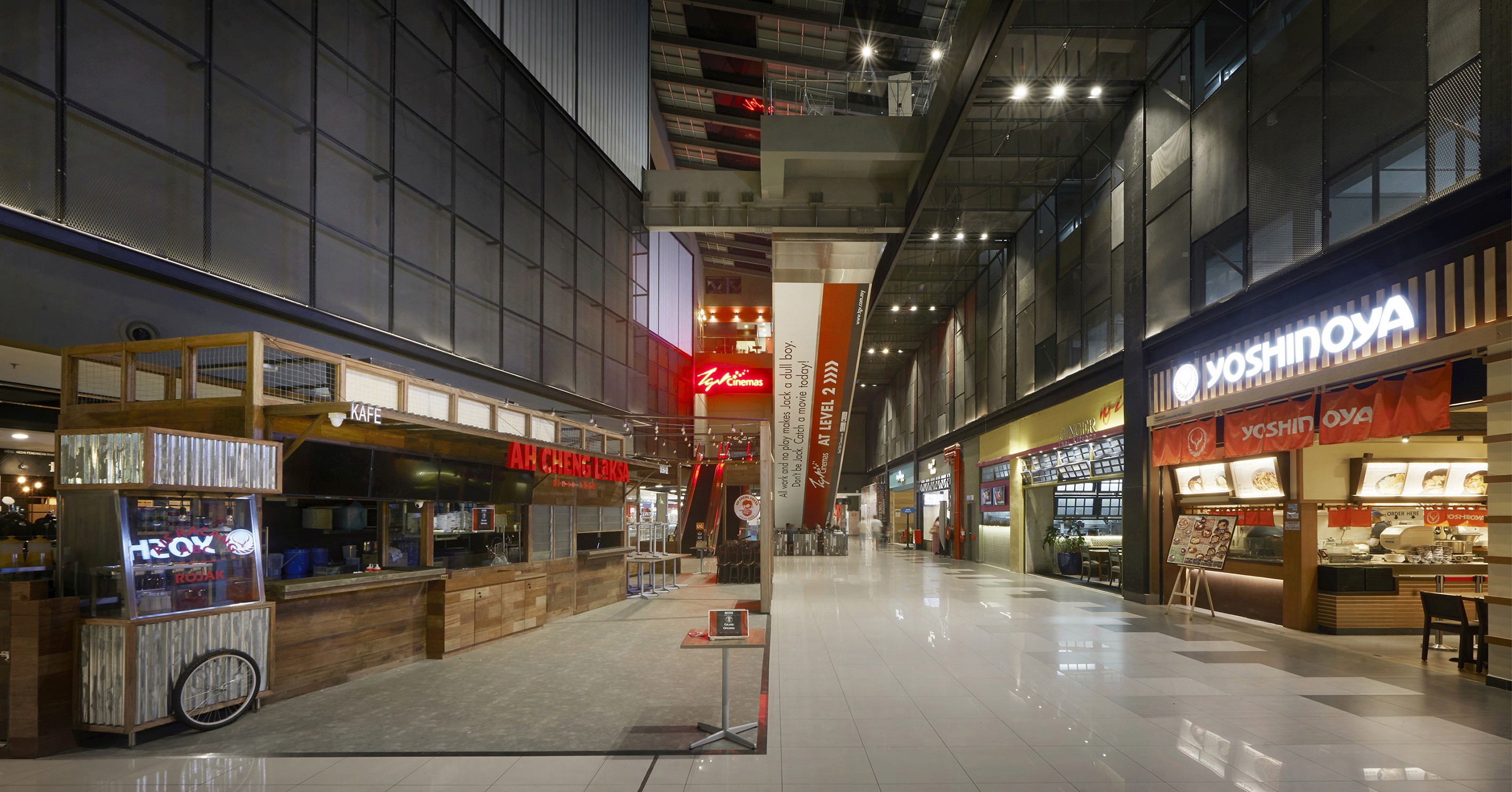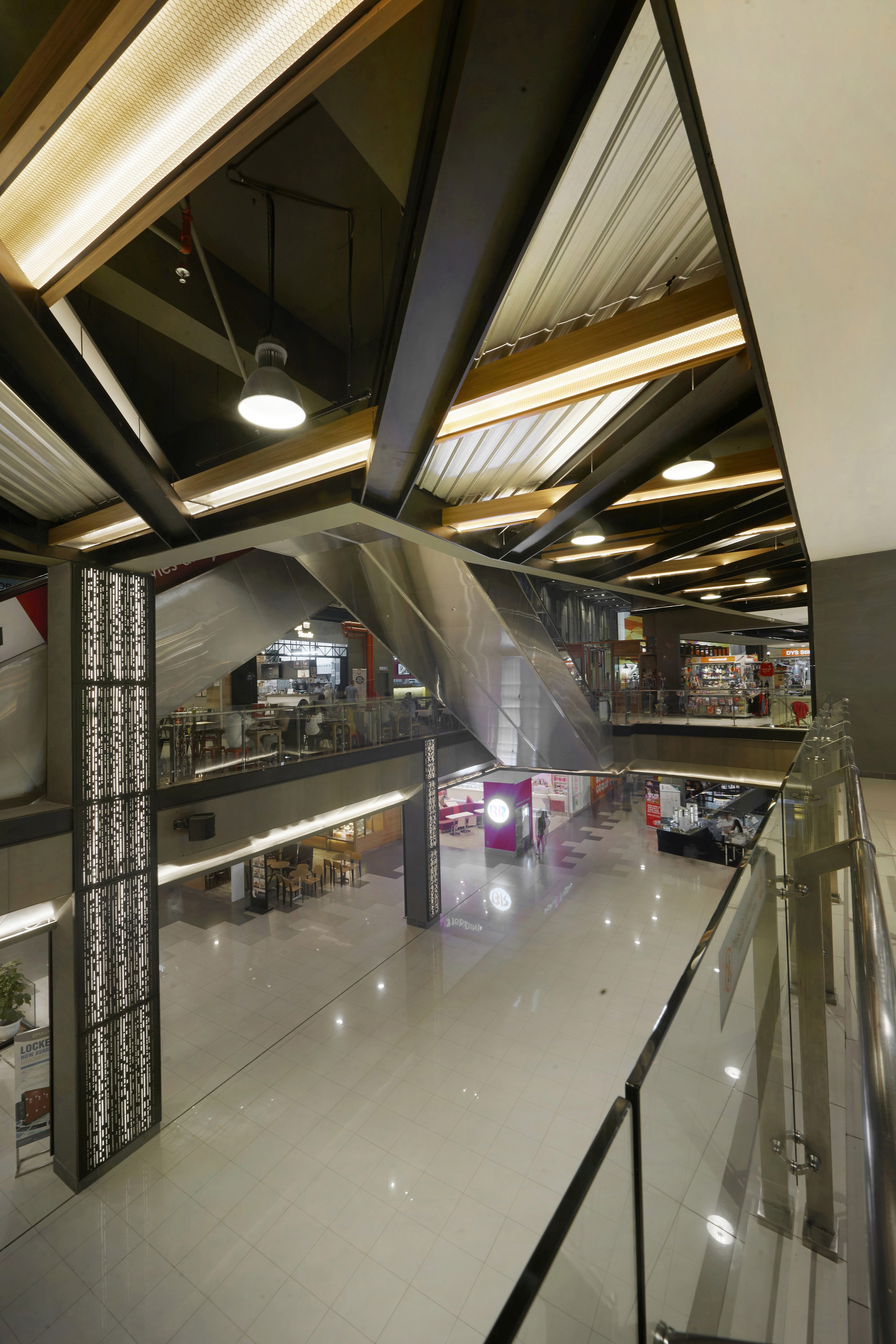 The concept of an industrial warehouse, a back-to-basics approach with rough surfaces, exposed elements and monochromatic tones is captured in the interior design of the Dpulze Shopping Centre. Diagonal lines created on the centre court ceiling coupled with expanded metal walls break away from the traditional industrial rigid form & shape. The industrial atmosphere throughout the mall is visually demonstrated by the application of exposed raw materials such as the corrugated ceiling with universal beam detail, cement board and perforated metal. One of the key statements of Dpulze is found on the diagonal line ceiling and custom perforated metal columns with concealed light creating the movement and accentuating centre court’s void. This approach ensures a dynamic experience within the mall.