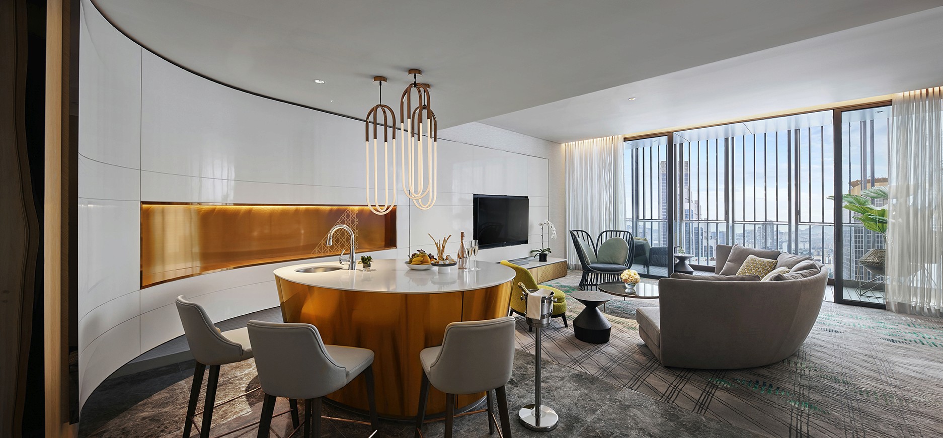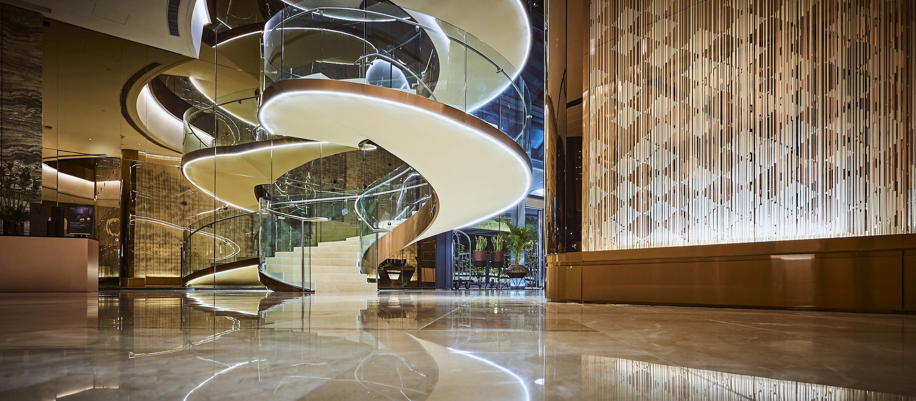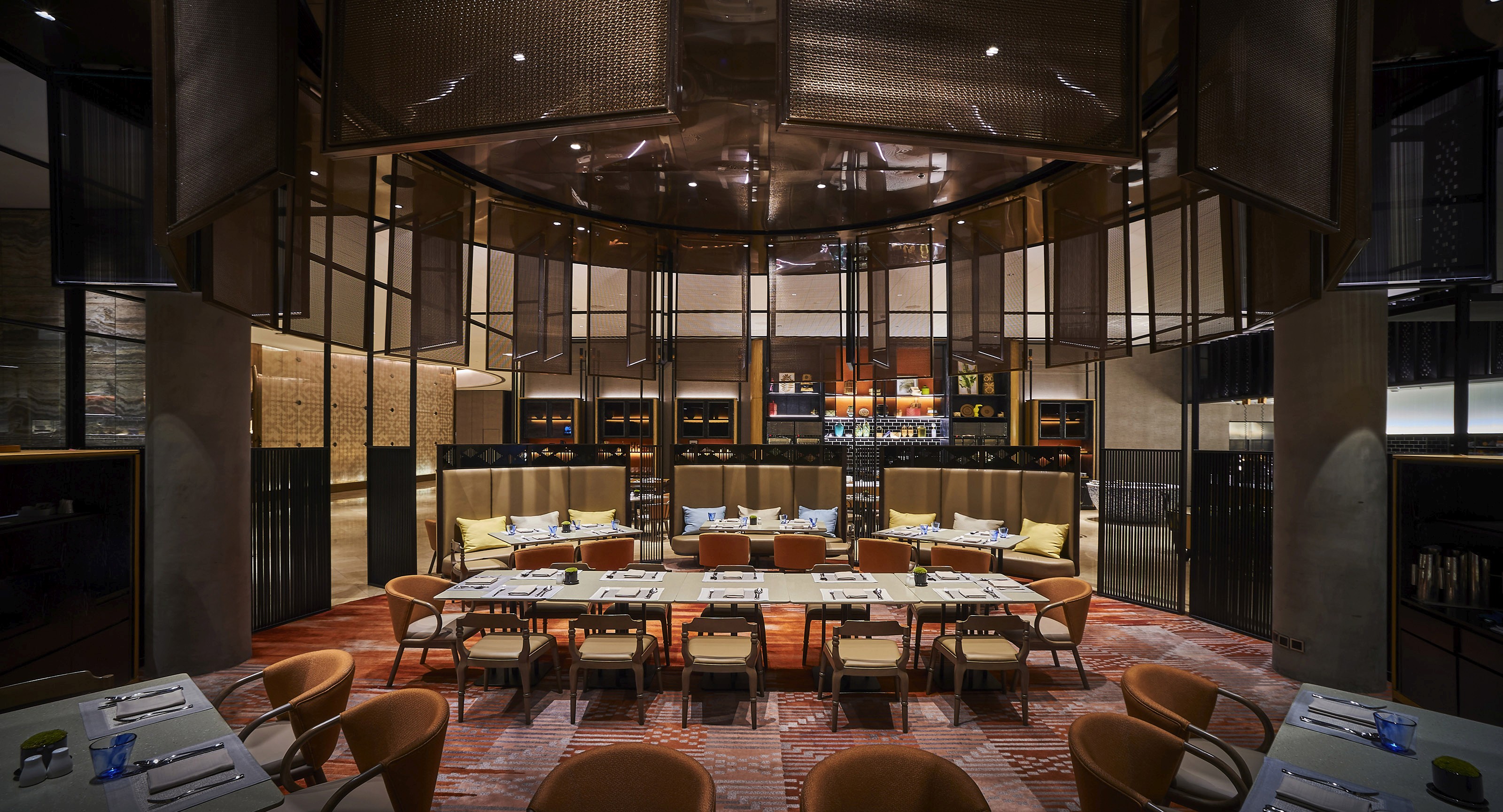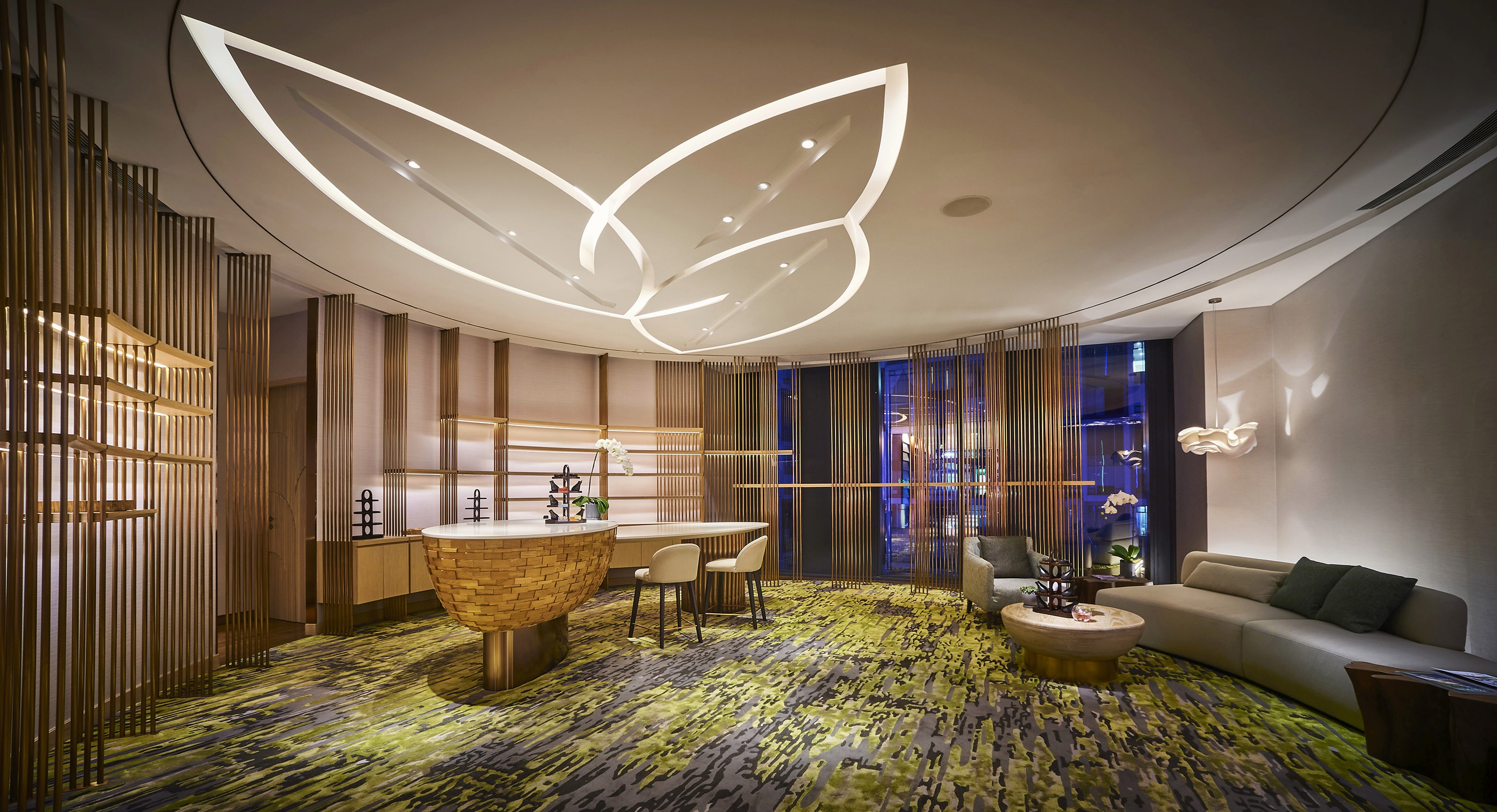 The EQ’s recent revamp boasts its iconic rectilinear 52-storey architecture with 440 guest rooms and suites enveloped in rich local identity. Reimagining a novel way to translate heritage into a space, cultural leitmotifs are refashioned to embody a sense of discovery within the walls in the property. Adopting the concept of ‘timeless chic heritage’, elements like songket, baskets and looms are reinterpreted in harmonious symphony. The common area is interlaced with beautiful woven textures inspired by traditional textiles and elements of nature. Its main feature lies in the grand lobby where a glistening polished rose gold spiralling staircase sparkles in dynamic fashion. A tower lantern complements with an interplay of opacity and luminosity — adding romance to the communal space. Its grandeur is paired with a neutral palette to translate a welcoming space informed by rich Malaysian hospitality.