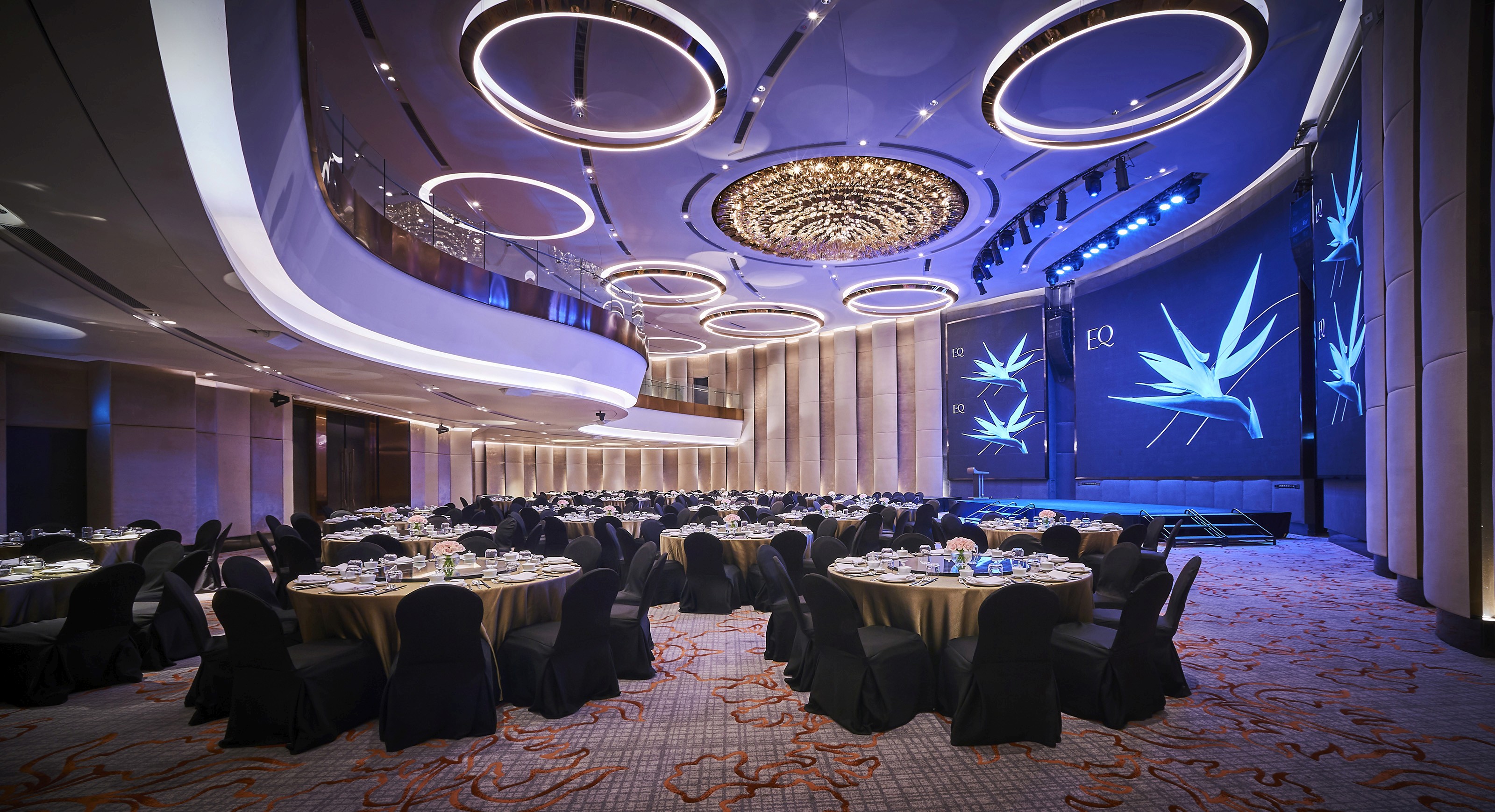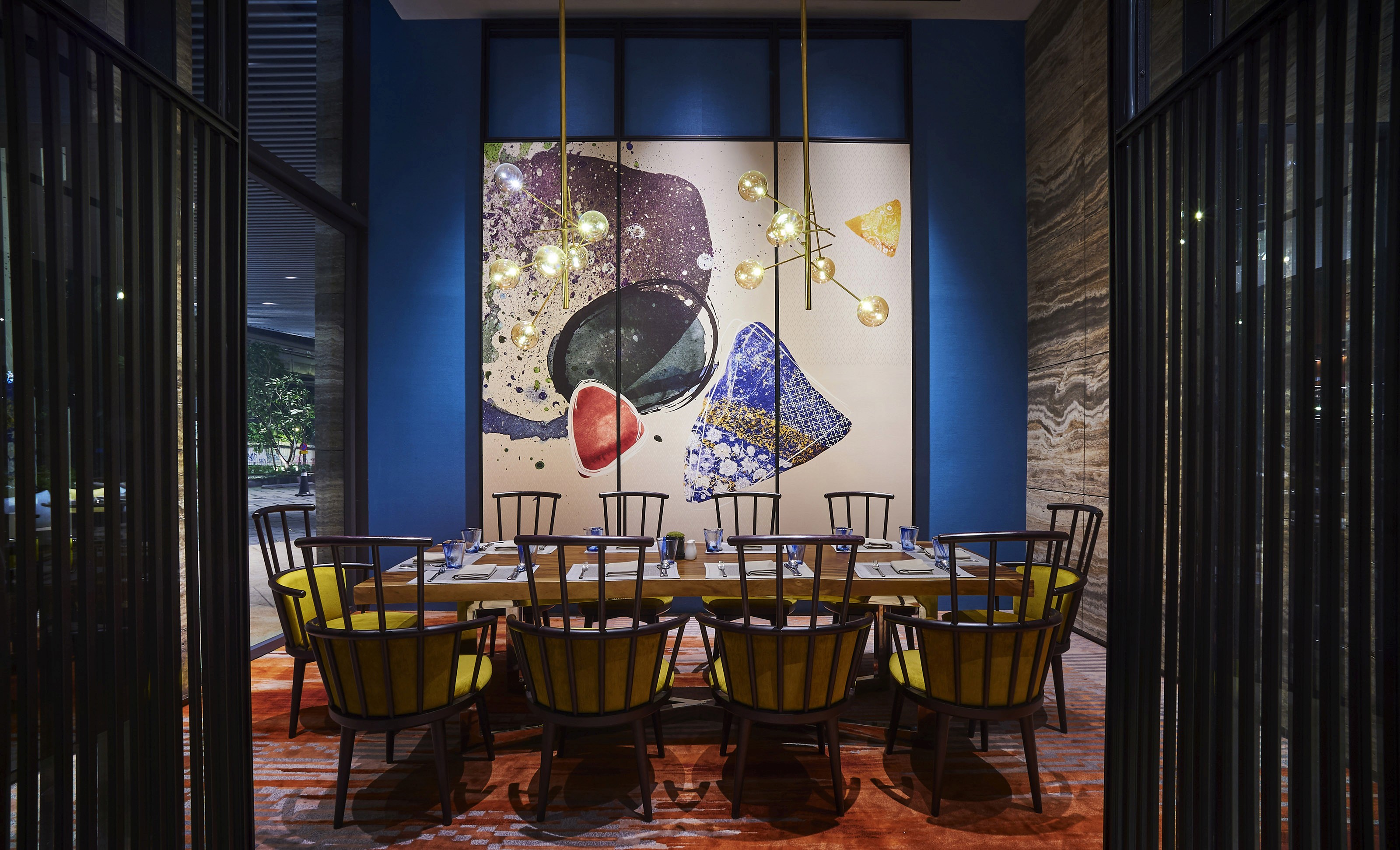 The EQ’s 440 guest rooms and suites are luxuriously decorated in intricate leitmotifs, each inspired by the rich heritage of Malaysia. Bold geometric patterns drawn from traditional Malay songket are translated into the carpets while feature walls derive from the art of henna. These artistic silhouettes are delicately used in a controlled and monolithic way to lend a sense of calmness and continuity to the space. The overall room is donned in splashes of dark tones, accentuated with sudden pop of ochre yellow and majestic gold. Natural nuances are added to provide balance with quasi-complex prints adding visual impact to the guest room. Bathrooms are decked in opulent marbles in dark shades while communal areas are donned with elements of local culture. Clean lines underscore the subtle elegance of the private chamber while drawing the eye to the unparalleled vista of the city skyline.