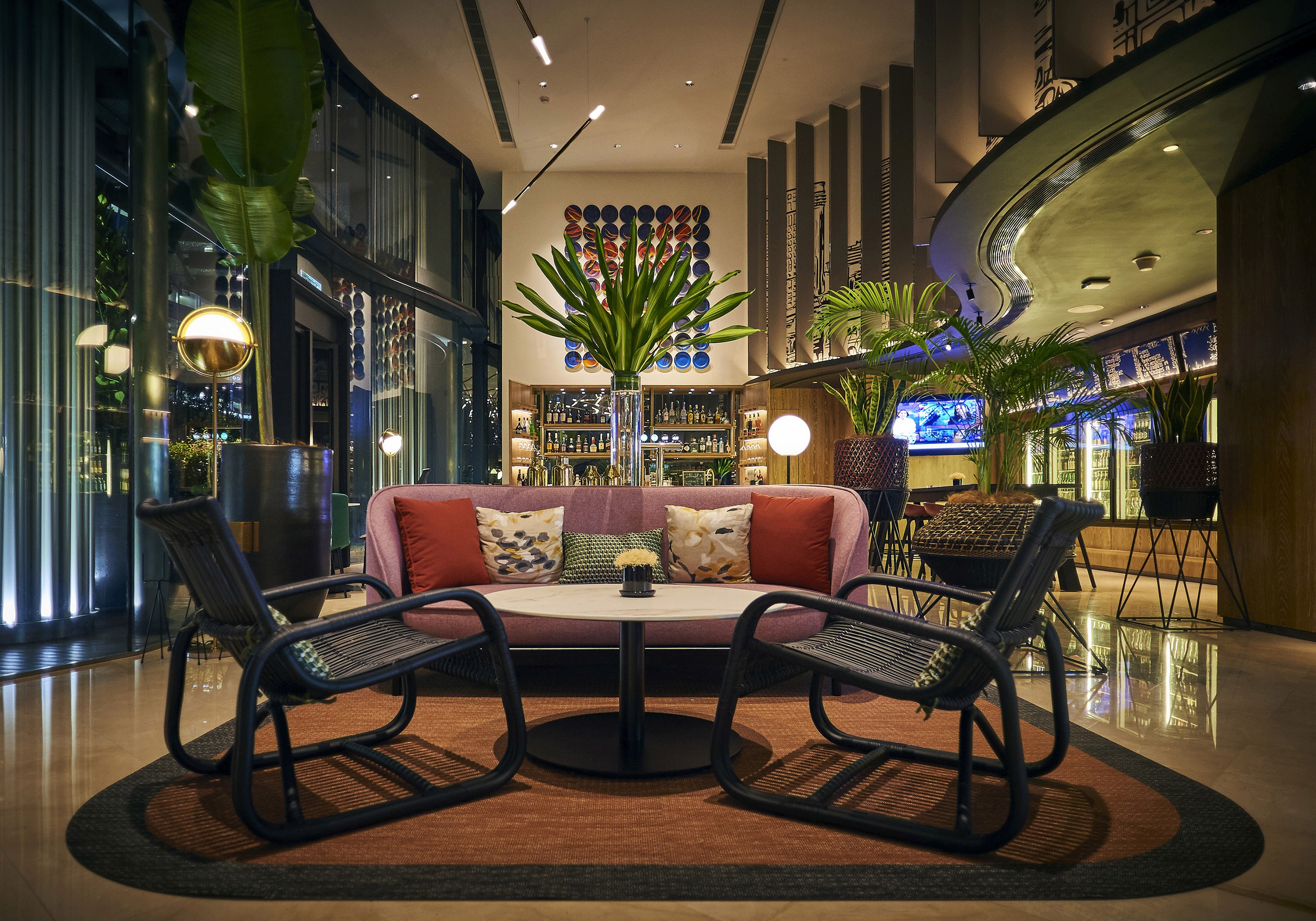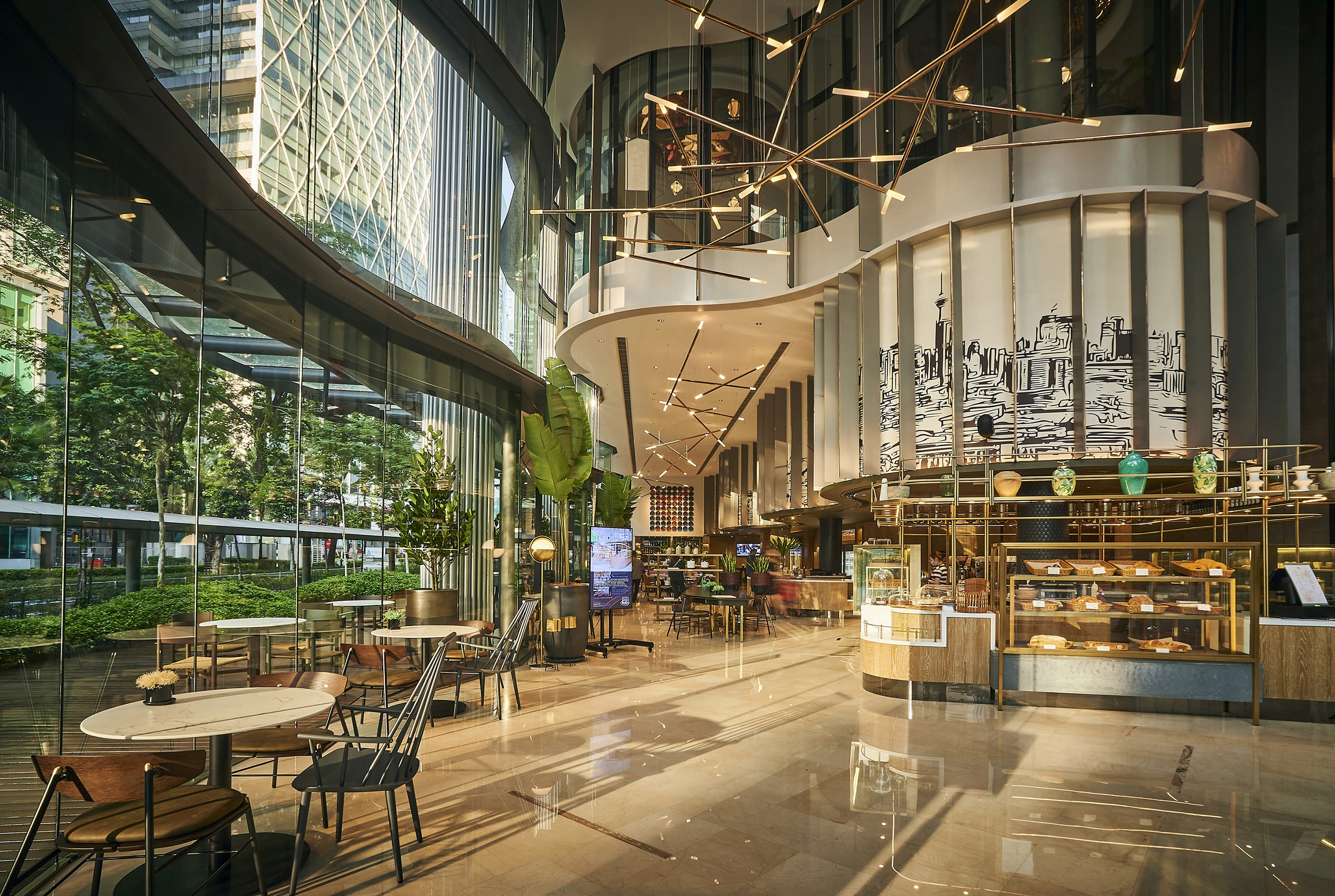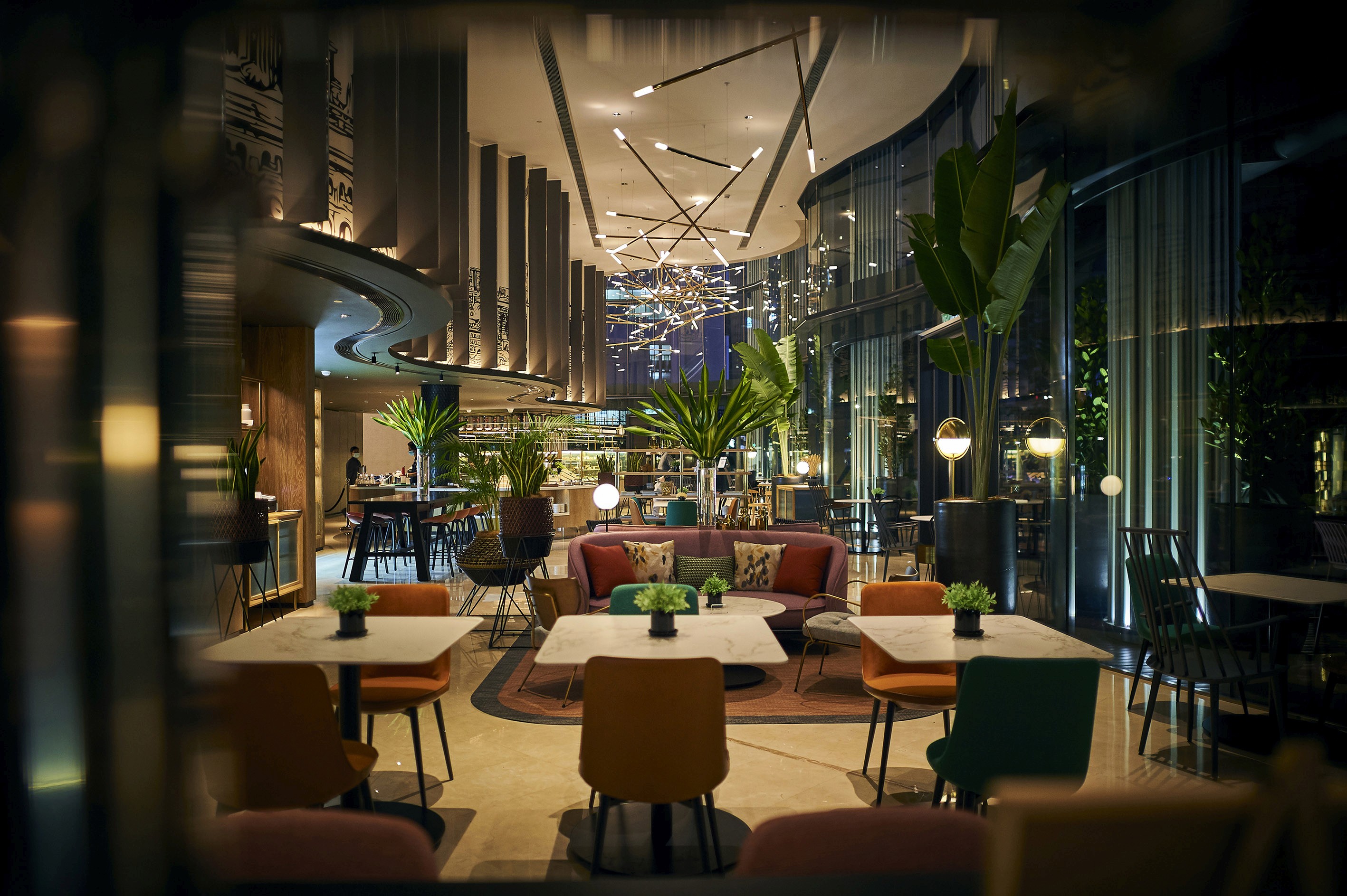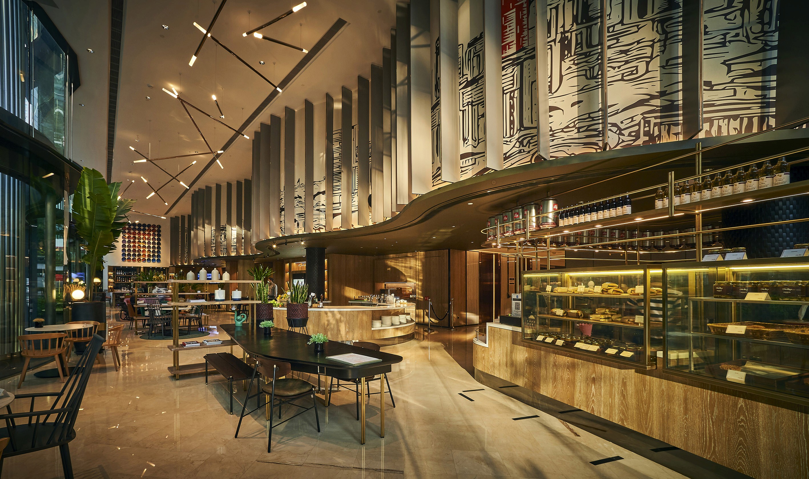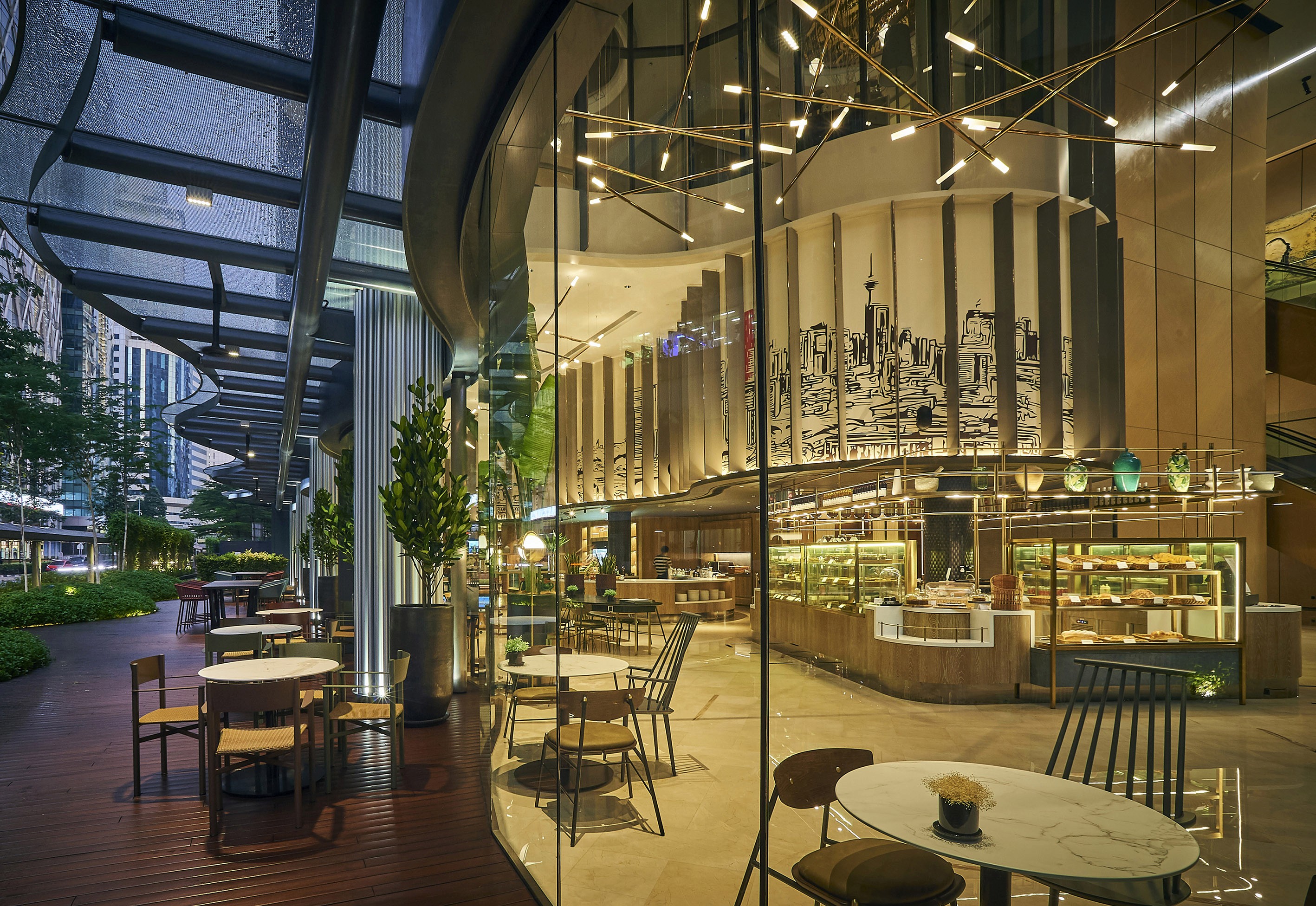 Like walking down a high street, Etoile invites you to be attracted, inspired and engaged with its latest spatial intervention on the ground floor of EQ. Combining voyeurism and magnetism, Etoile draws attention through its strategic location, with a unmistakable see-through double-volume space washed in warm rustic oak timber and hints of gold. The layout is spacious and interactive, with live stations overlooking an eclectic mix of kopitiam-style marble tables and communal islands, set within the lively and upbeat atmosphere that embodies the spirit of a vibrant market hall. Take a seat at the outdoor area for a relaxed vibe or stroll inside to marvel at past-and-present Kuala Lumpur depicted artistically across the food islands for a local touch. As sun sets, the open bar lights up as a conversational point backed by bespoke carpentry work inspired by old-school open cabinets — a nostalgic addition to Etoile. Modularity is also considered in its spatial intervention with a floor plan that’s flexible for all types of activities.