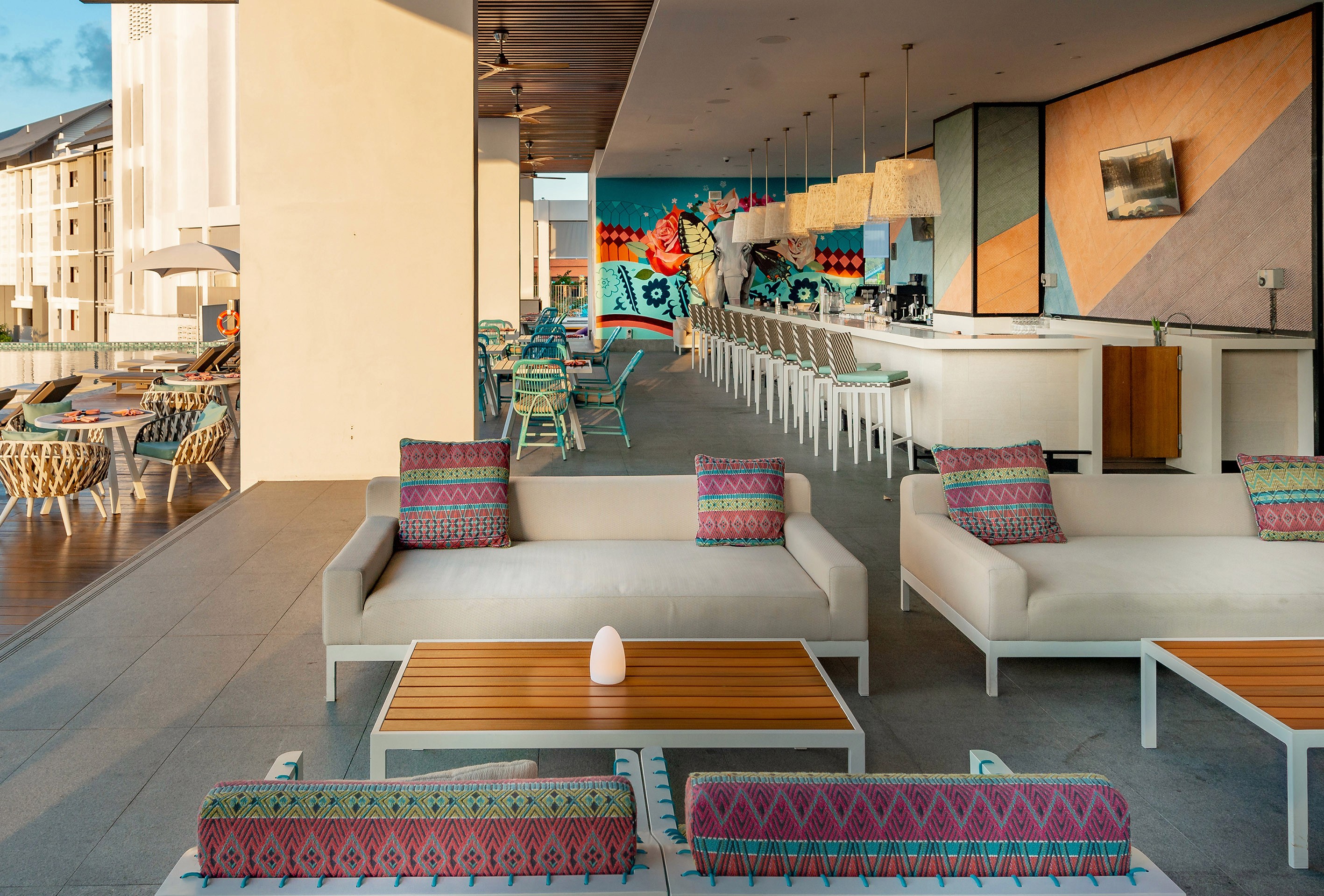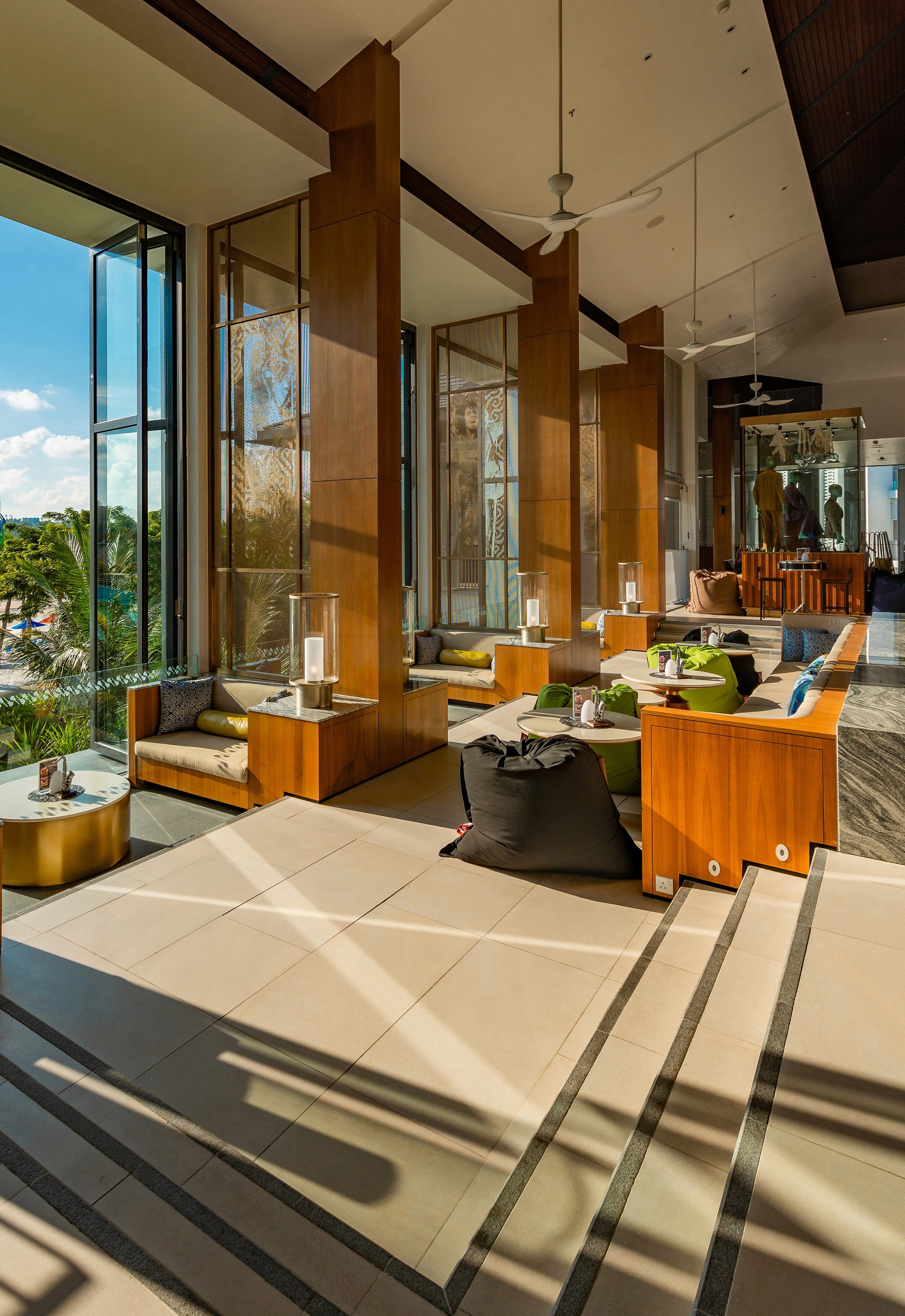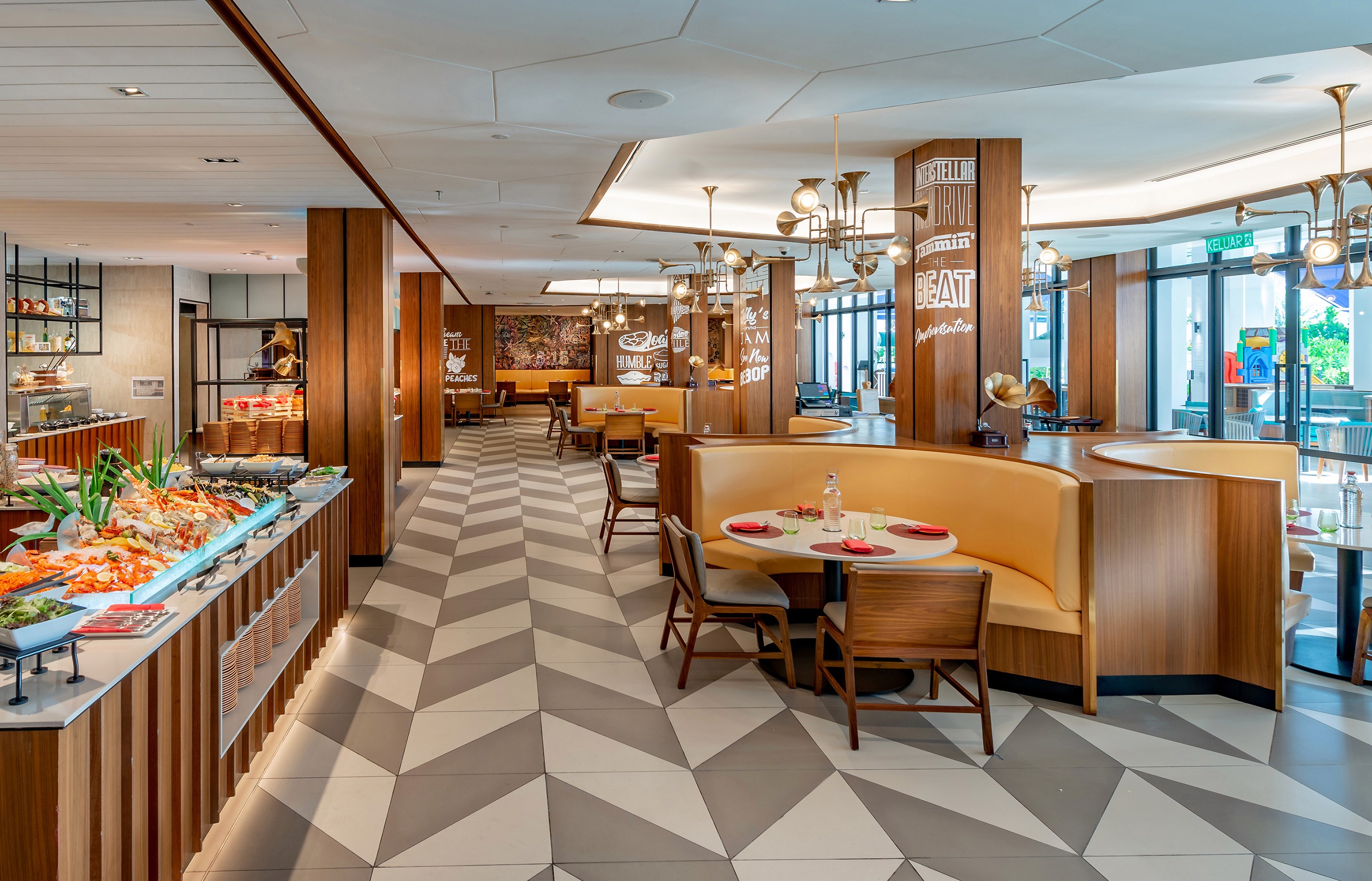 Echoing the vibrancy of the hotel’s architecture and overarching music theme, the communal spaces like the lounge and lobby reels in lively decors amidst a lofty space of walnut and bronze. Colourful furniture pieces and soft furnishing bounce energy against each other, creating a space that delights. An interplay of elevations using vertical design elements demarcate the public area beautifully. The all-day dining, Sessions, brings its own stunning display of memorabilia and instrument-inspired chandeliers. The guest rooms — spread across two wings — carry a palate of deep turquoise and yellow, accentuated by rich and elegant finishes for depth and texture. Cosy and home-like, each guest room offers a small piece of Old Malaya with art pieces featuring P. Ramlee’s and Saloma’s days of old.