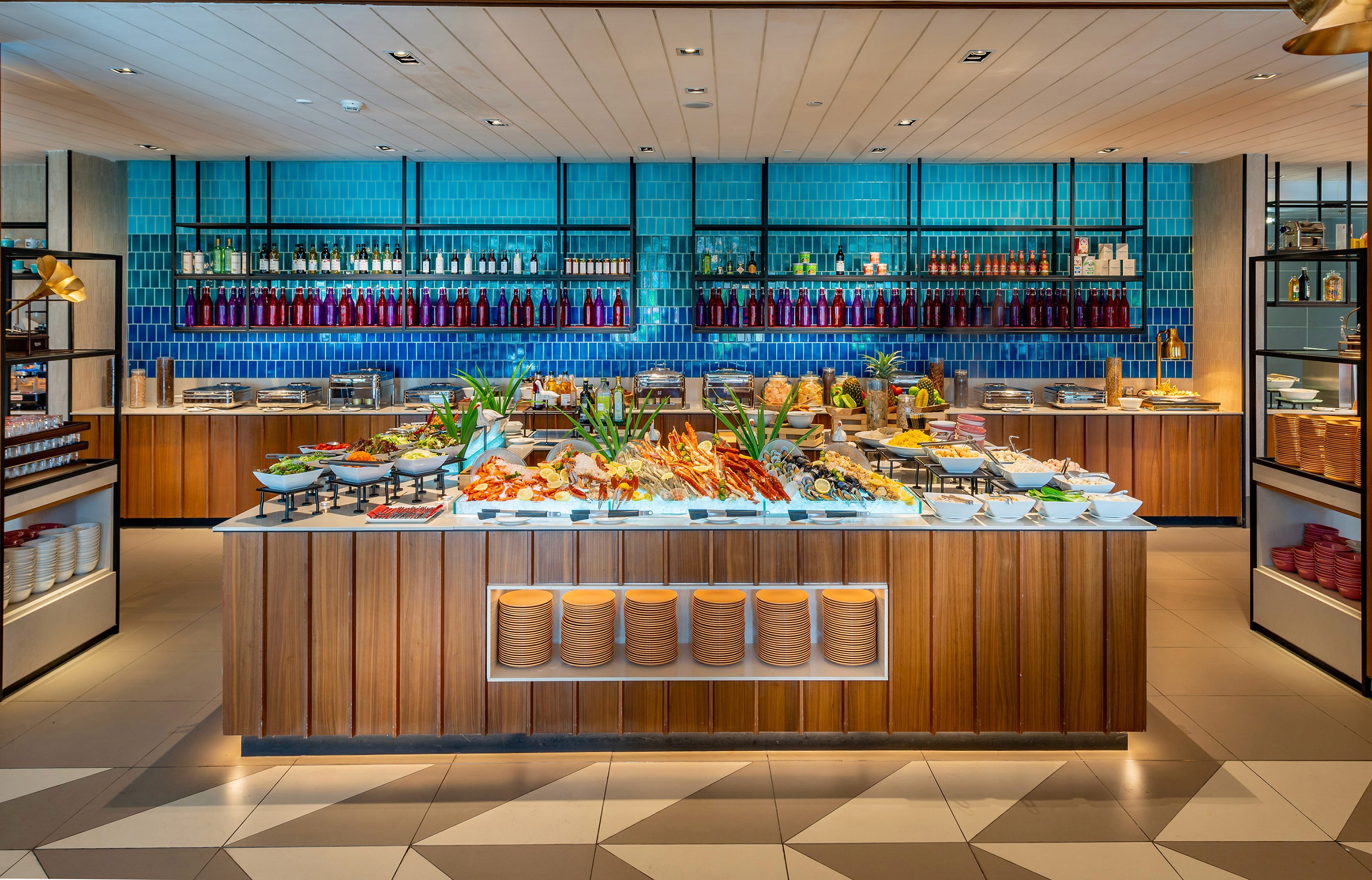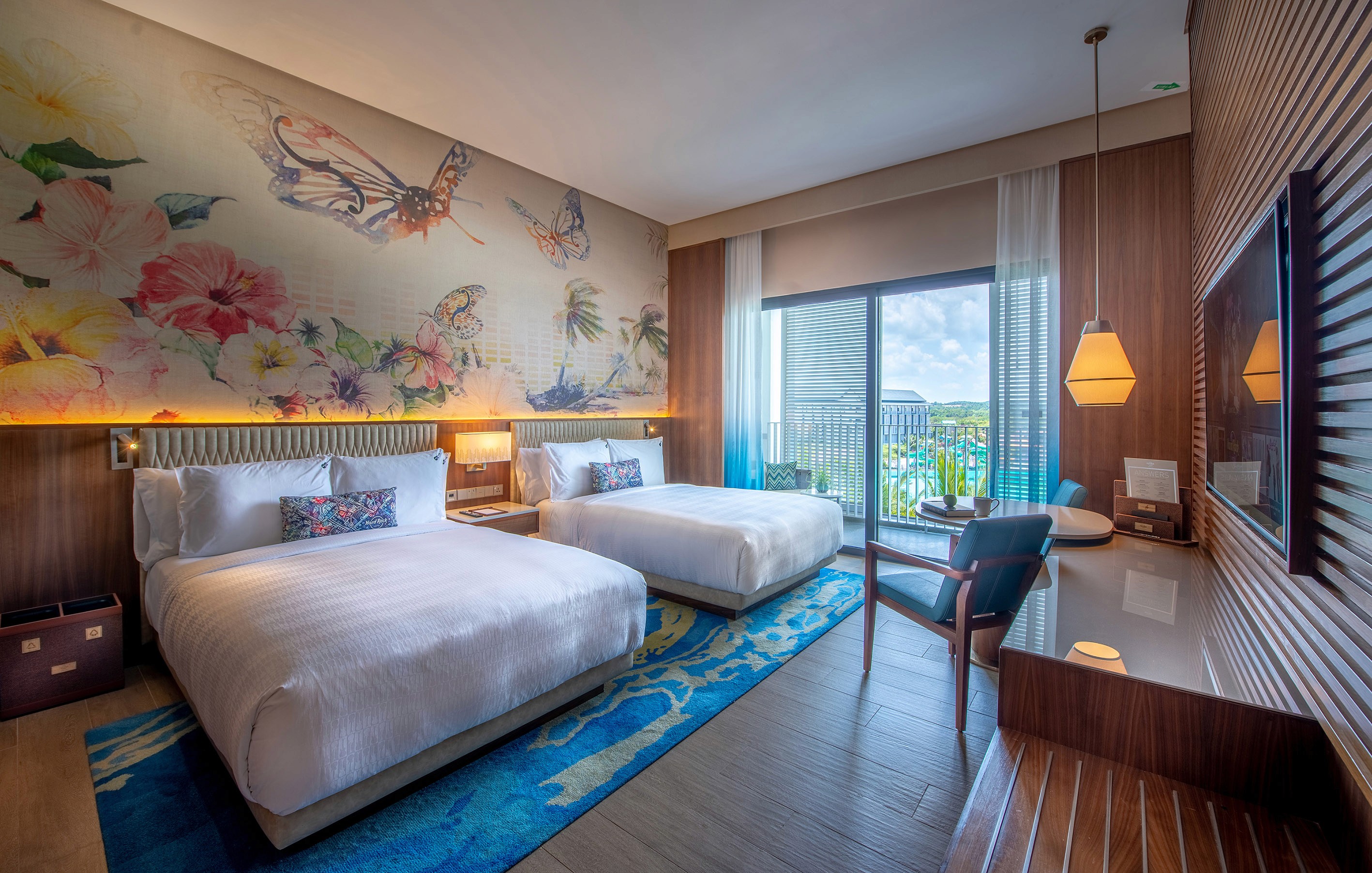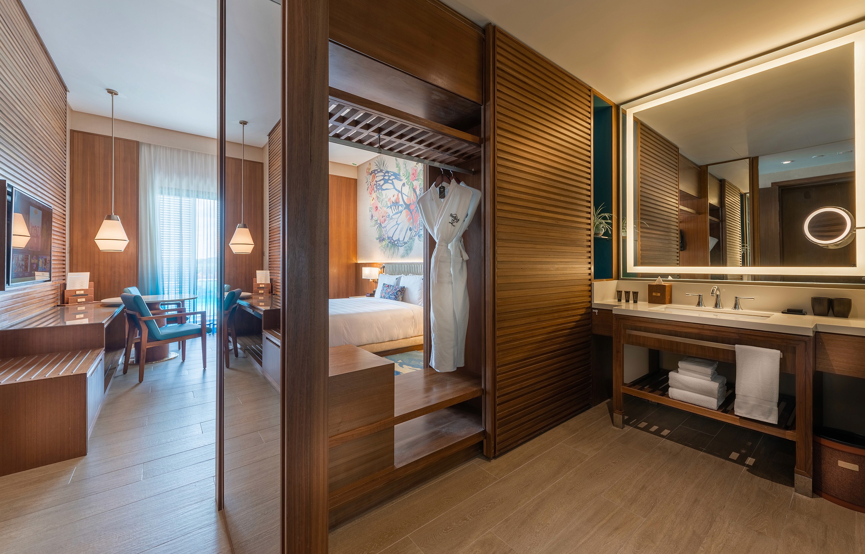 Echoing the vibrancy of the hotel’s architecture and overarching music theme, the communal spaces like the lounge and lobby reels in lively decors amidst a lofty space of walnut and bronze. Colourful furniture pieces and soft furnishing bounce energy against each other, creating a space that delights. An interplay of elevations using vertical design elements demarcate the public area beautifully. The all-day dining, Sessions, brings its own stunning display of memorabilia and instrument-inspired chandeliers. The guest rooms — spread across two wings — carry a palate of deep turquoise and yellow, accentuated by rich and elegant finishes for depth and texture. Cosy and home-like, each guest room offers a small piece of Old Malaya with art pieces featuring P. Ramlee’s and Saloma’s days of old.