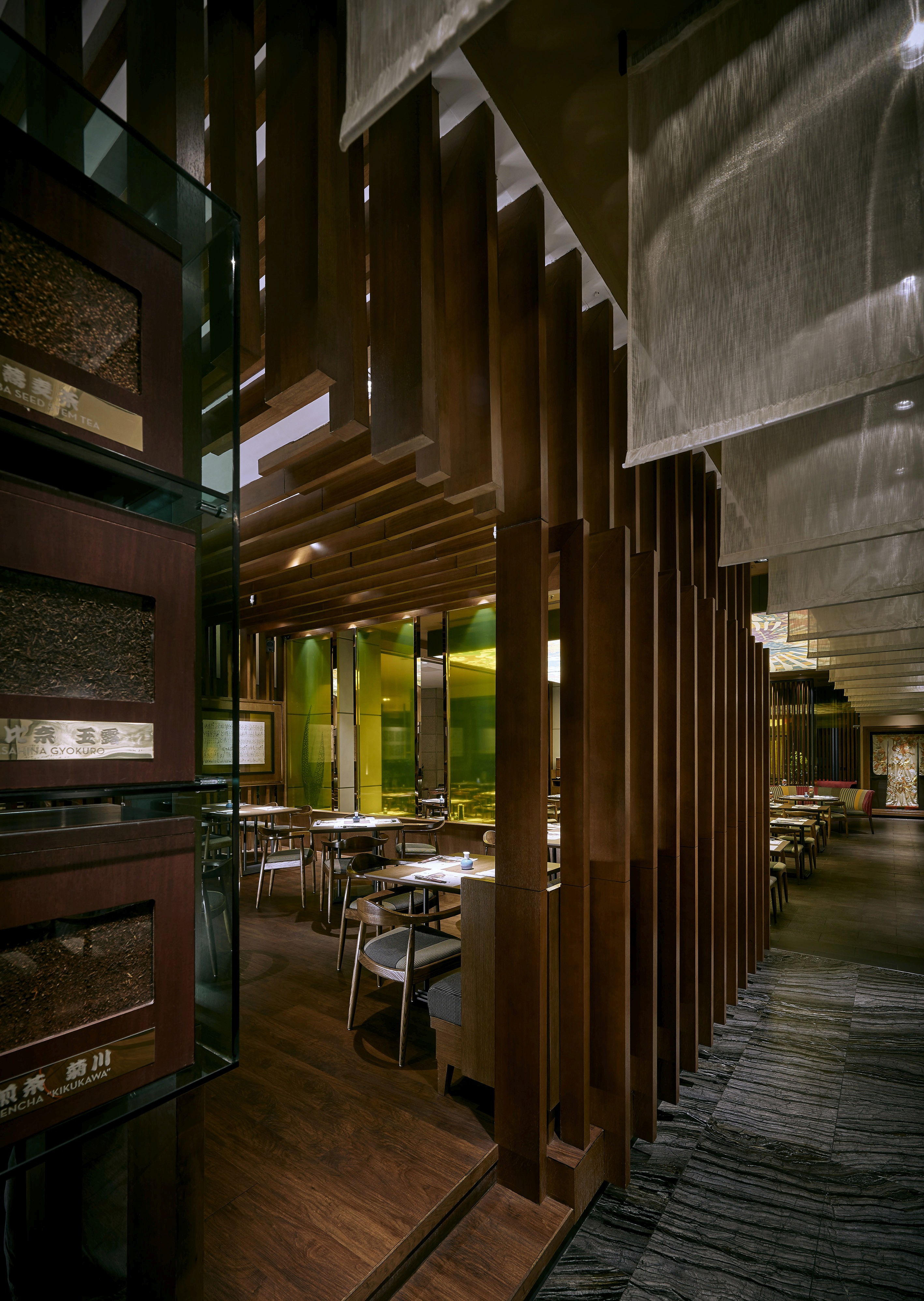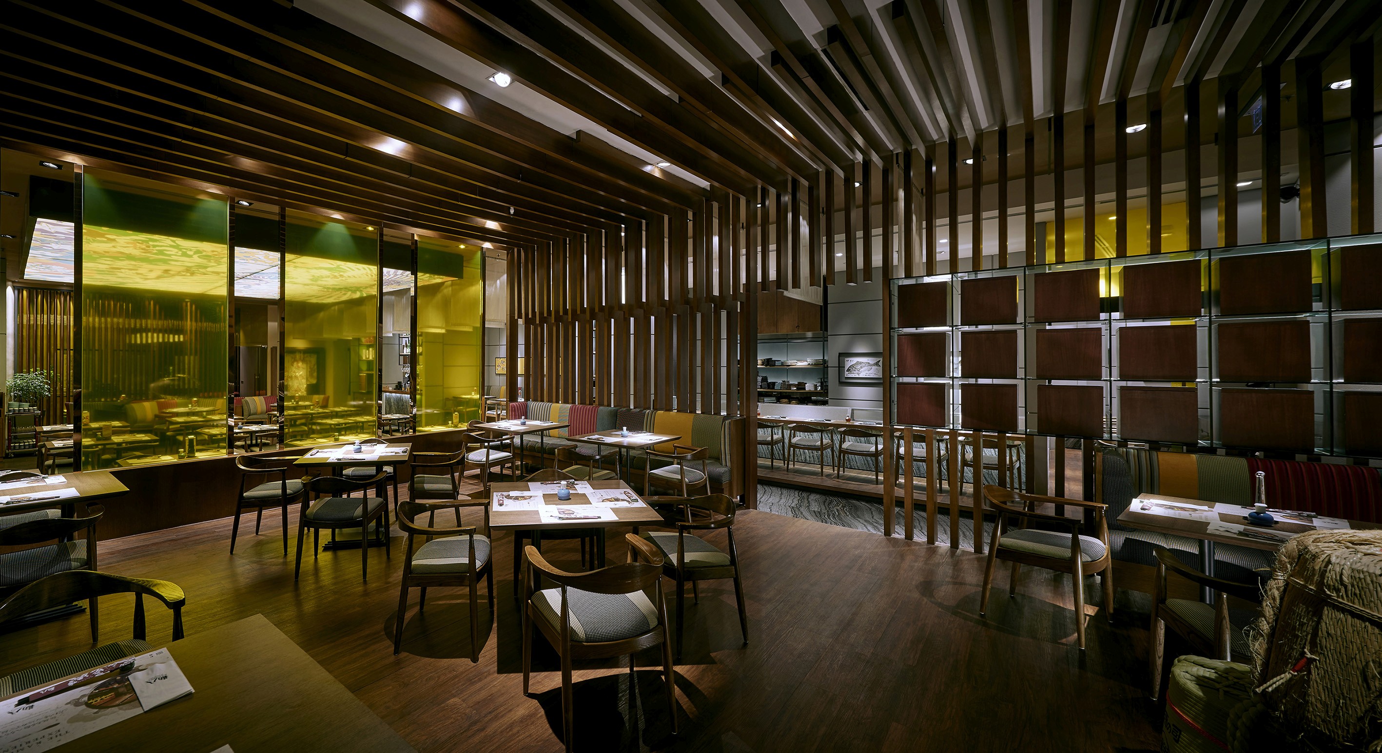 A nod to sustainability, we preserved the existing structure of the tea room and converted it into an elevated dining lounge. The timber louvers were given a darker stain and punchy yellow glass dividers were erected on either side of the lounge to welcome the illusion of sunlight.