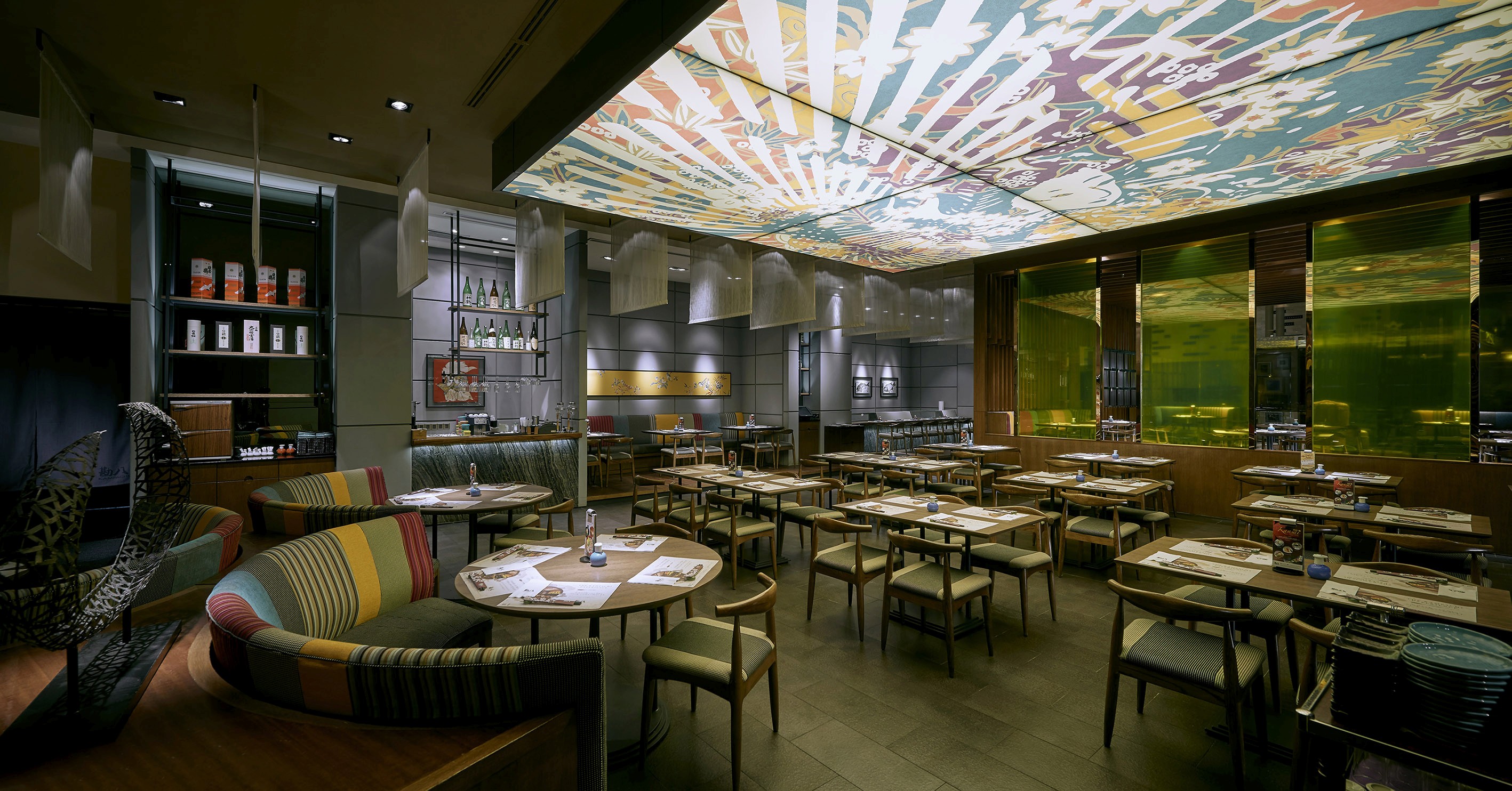 Styled as a hip and modern Kampachi, we spruced up the space with a myriad of bright and fun colours. Shapes and patterns which were derived from Japanese kimono silks and origami paper, were used to inspire the overall textiles applied in the restaurant’s seating upholstery, artwork and the pièce de résistance, an oversized graphic Barrisol ceiling with dimable mood lighting.