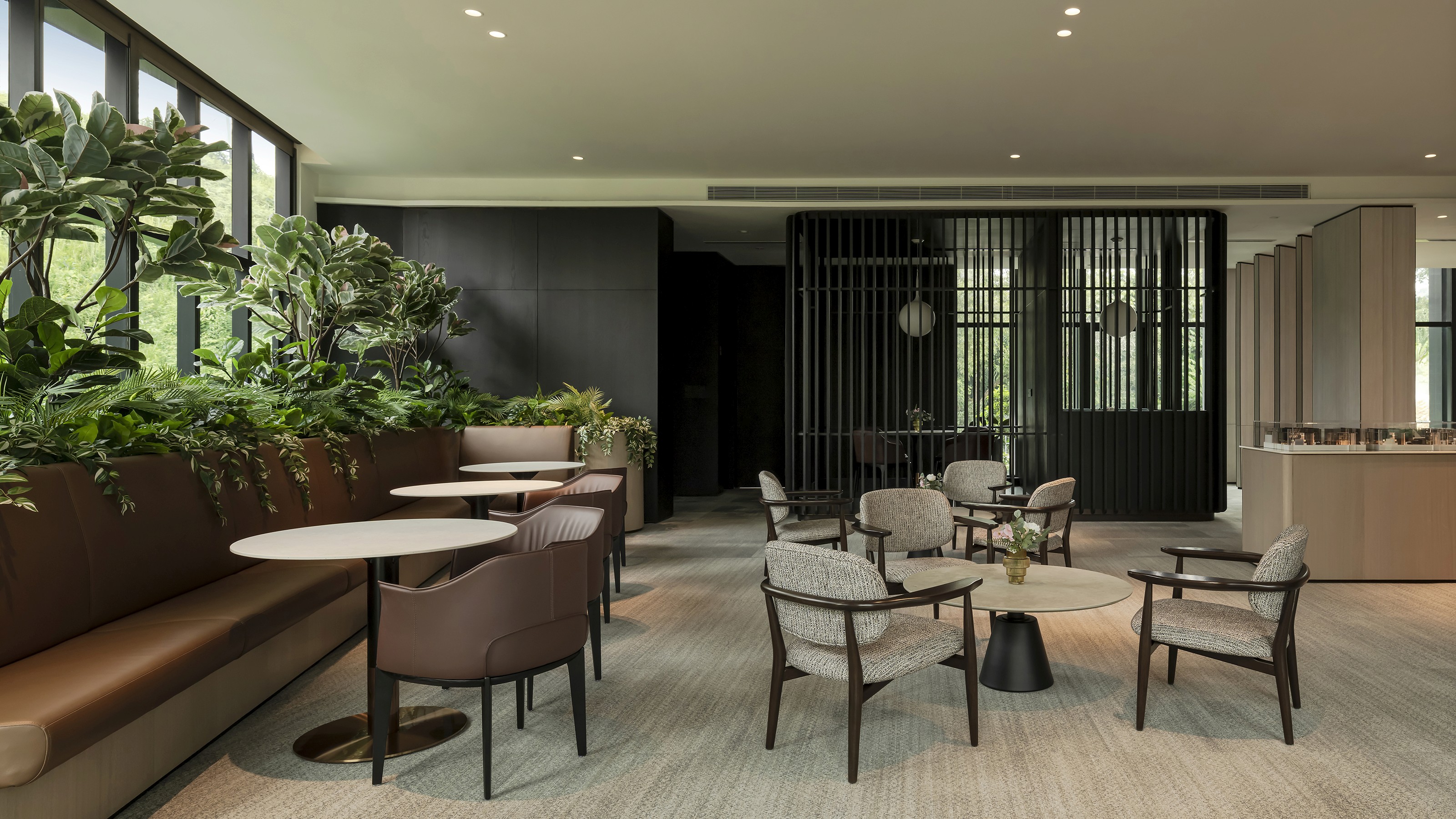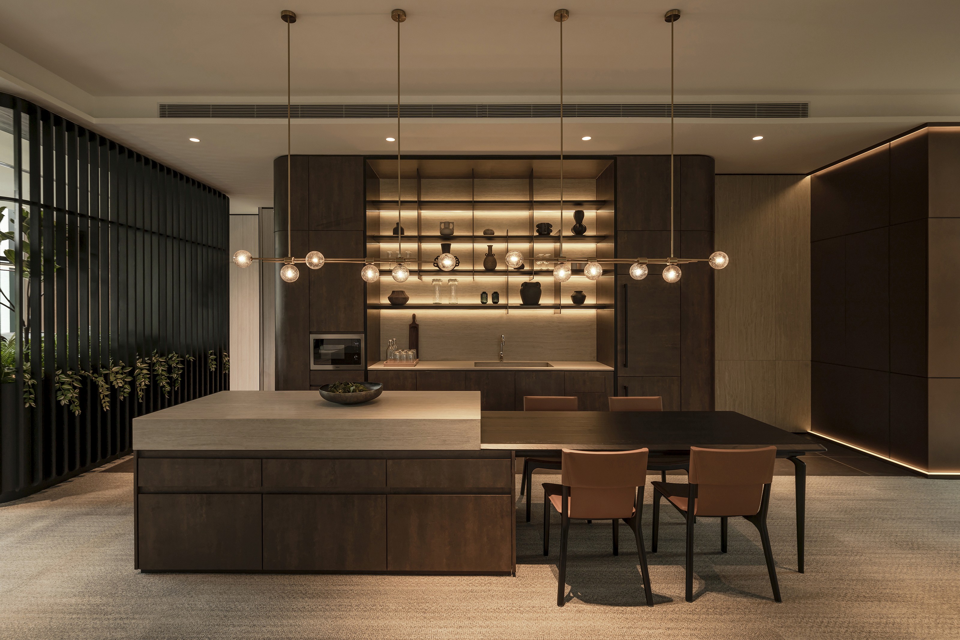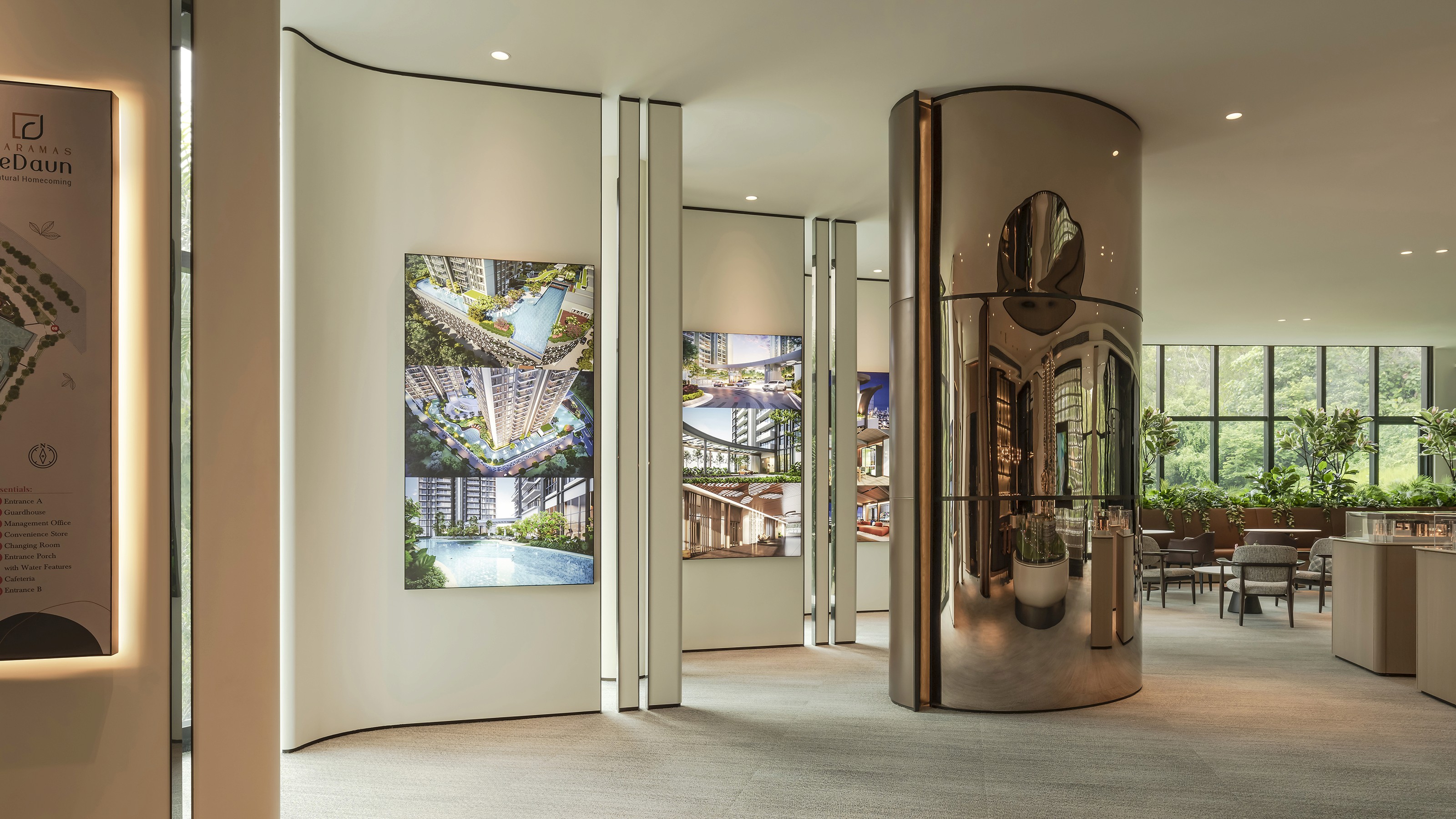 The newly unveiled Kiaramas Dedaun Sales Gallery offers a striking and inviting design narrative, crafted by Blu Water Studio. The entrance captivates with its dramatic interplay of light and dark, using a mix of high-gloss and tactile textures to engage the senses. This sophisticated introduction sets the tone for the rest of the space.