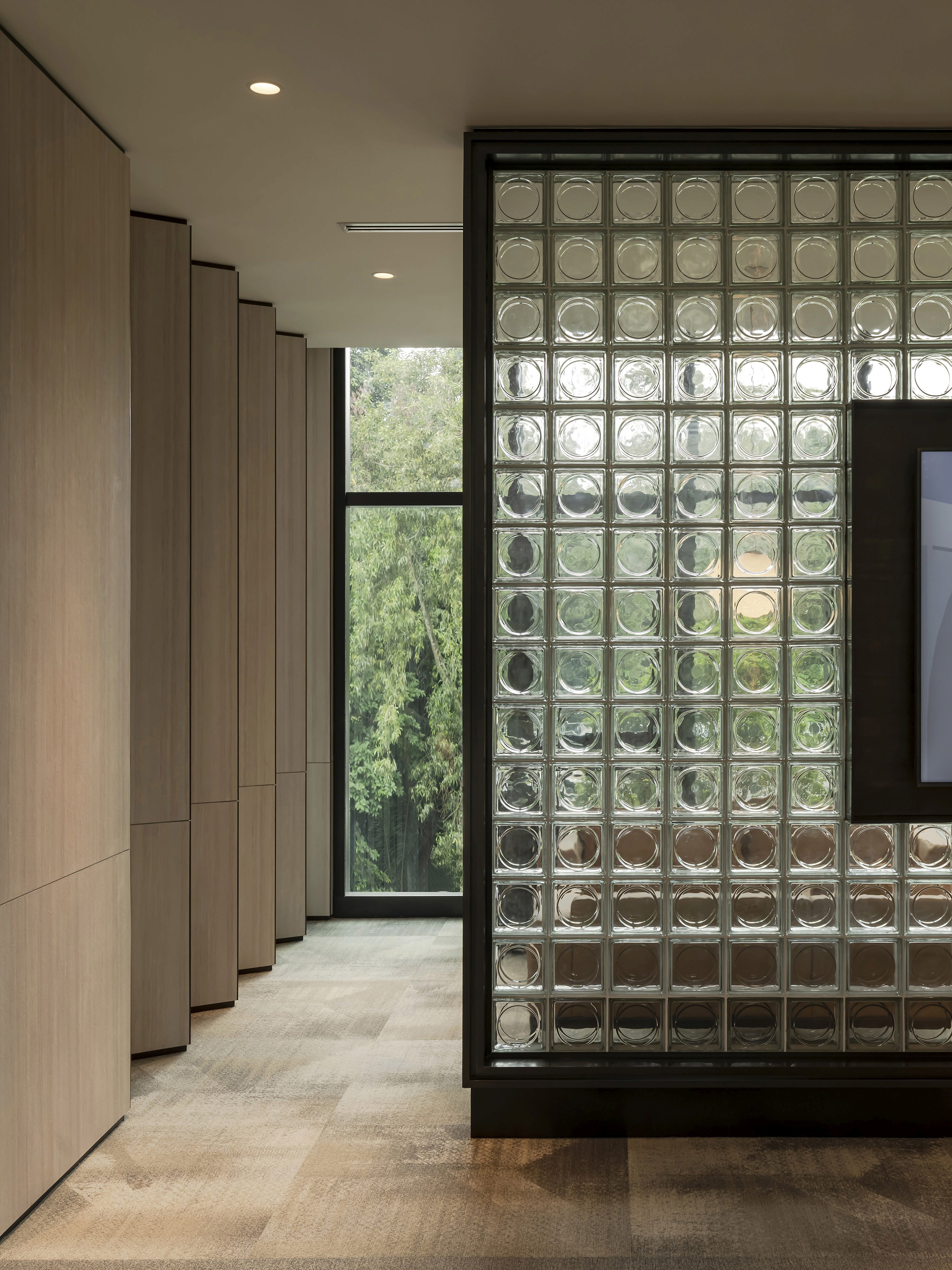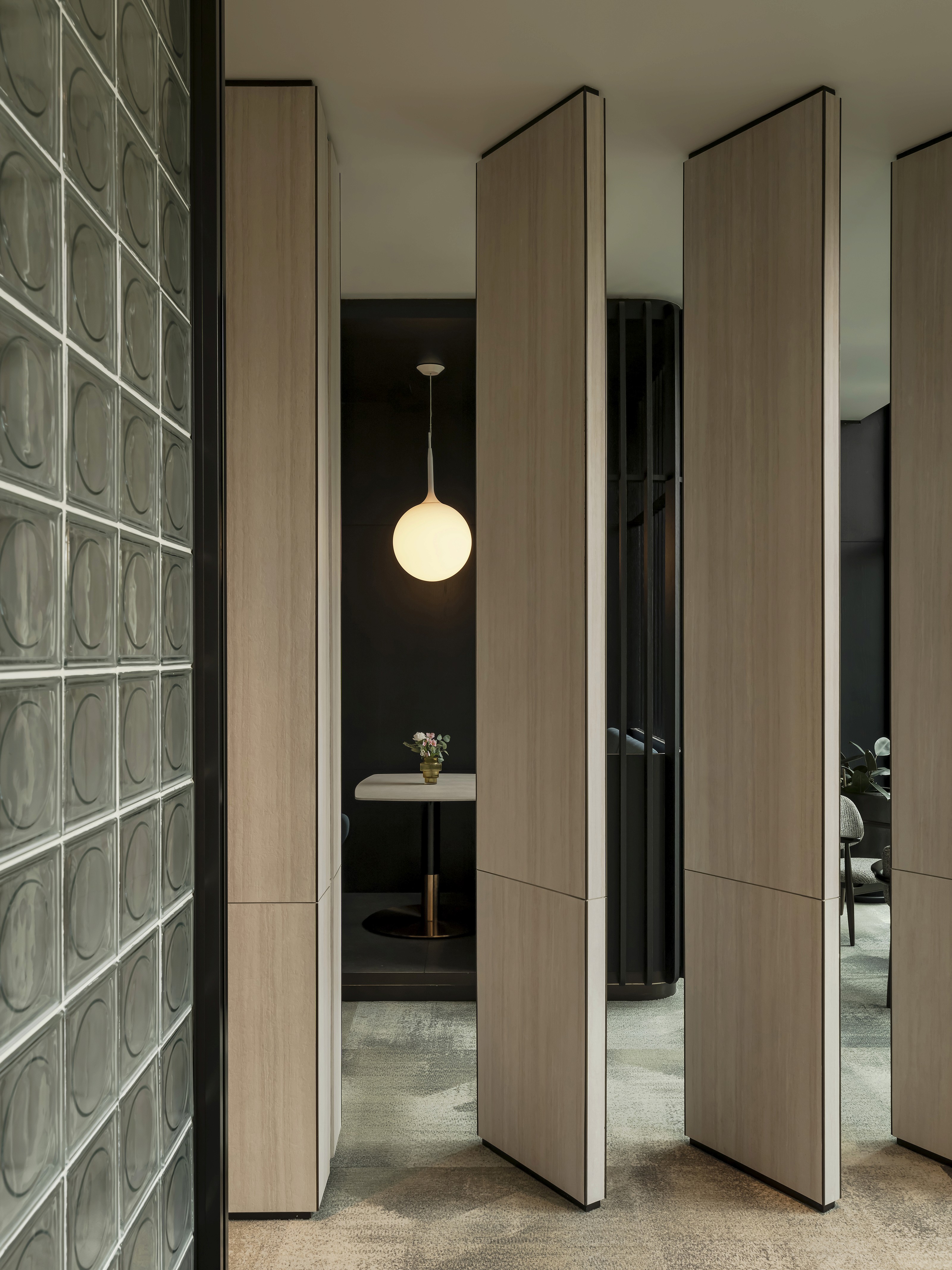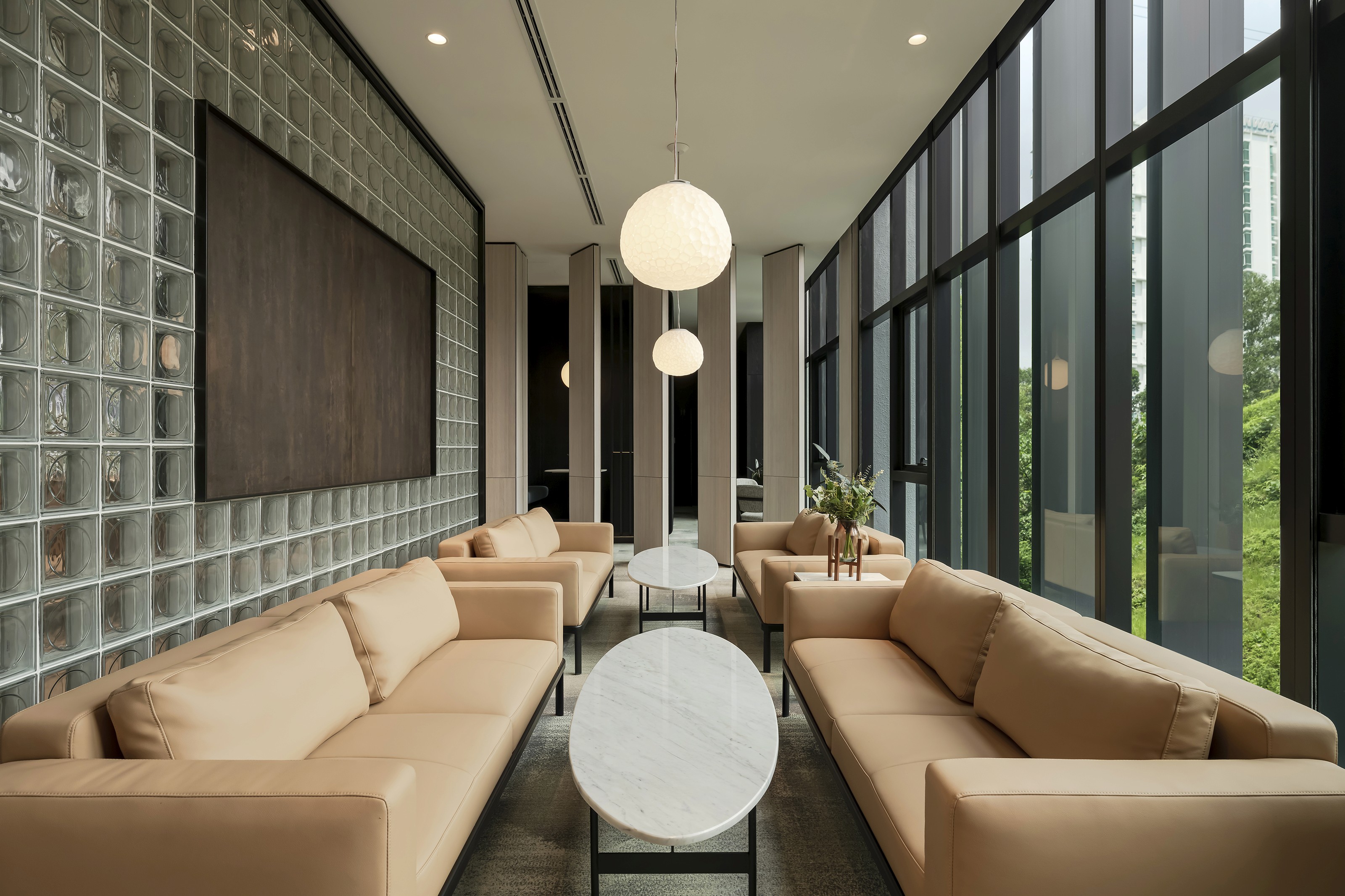 The newly unveiled Kiaramas Dedaun Sales Gallery offers a striking and inviting design narrative, crafted by Blu Water Studio. The entrance captivates with its dramatic interplay of light and dark, using a mix of high-gloss and tactile textures to engage the senses. This sophisticated introduction sets the tone for the rest of the space.