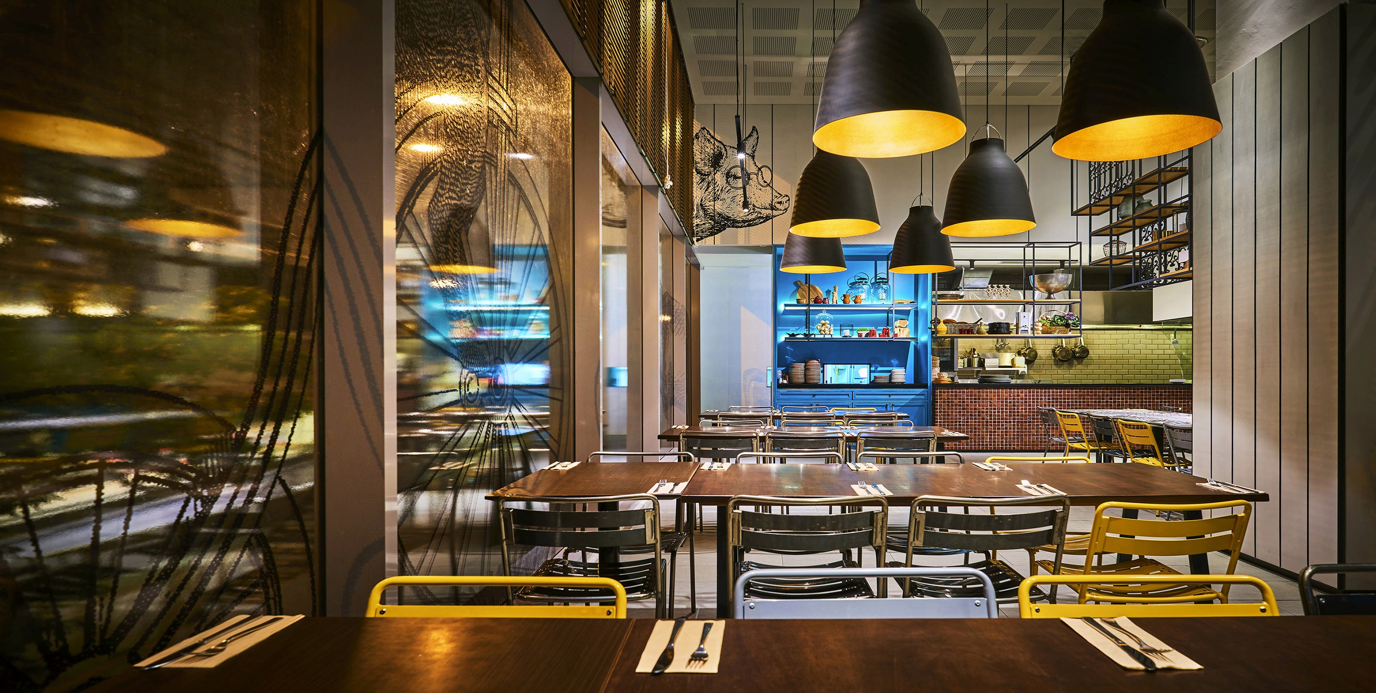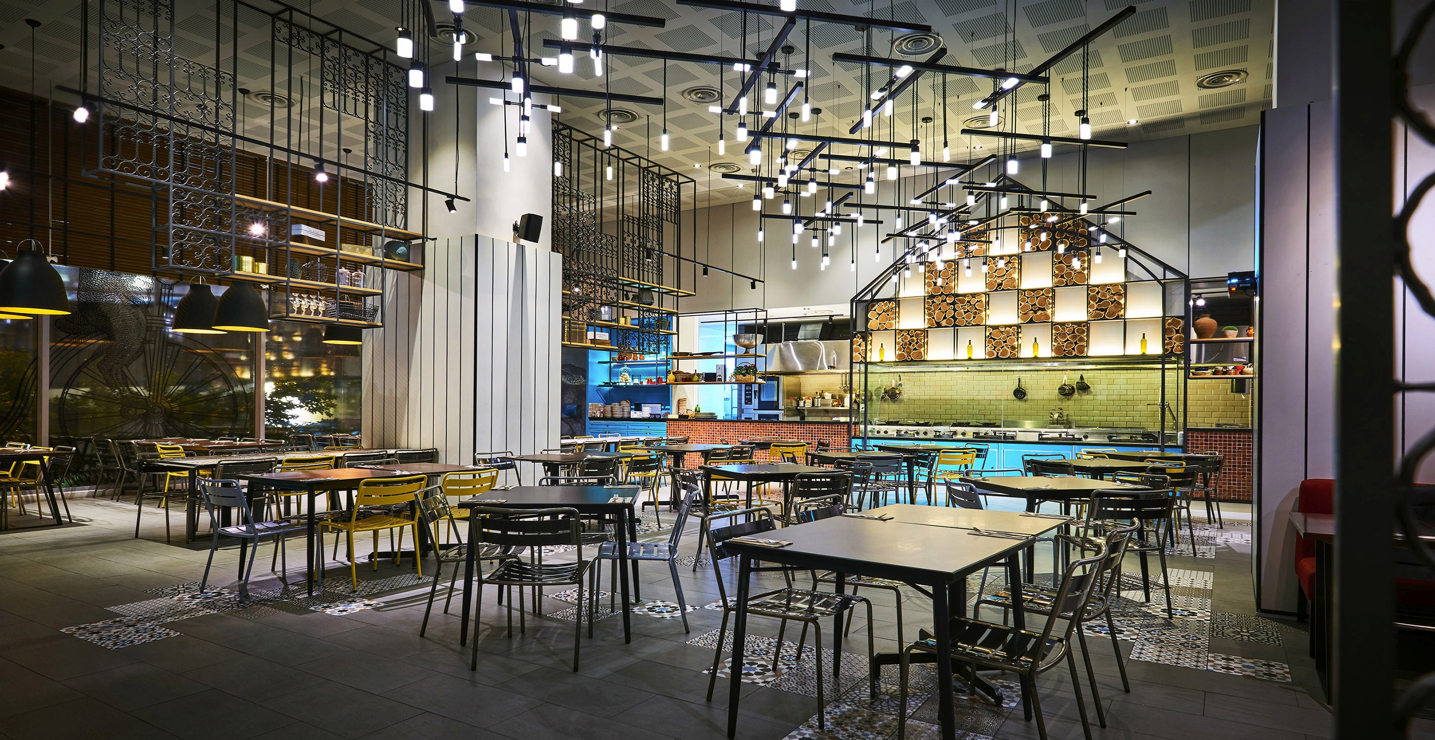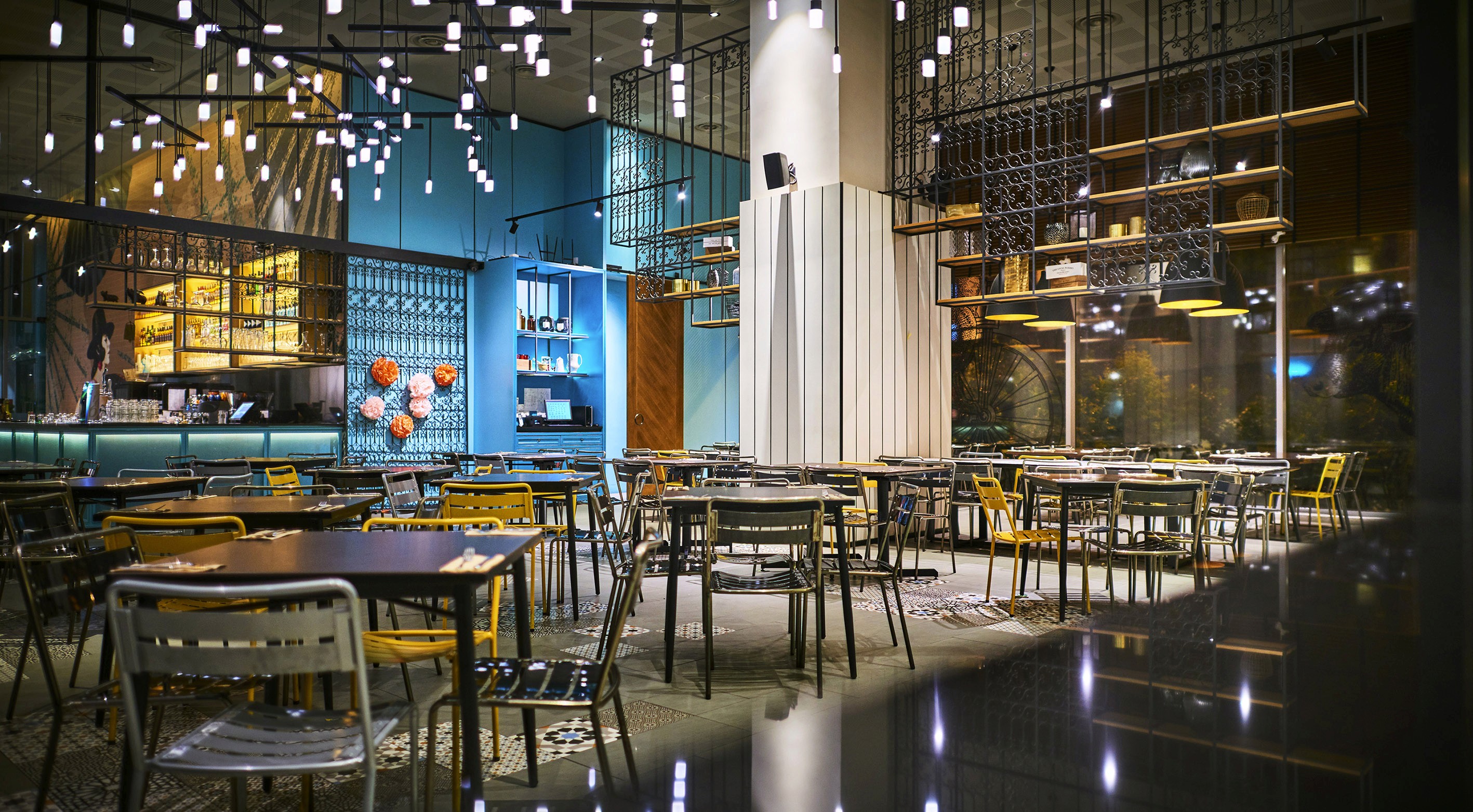 Imagine the basking streets of Spain in all its glitz and glamour, the crowd dancing and the aroma of fragrant paella wafting from the nearest bistro. Enter Marta’s Kitchen. Bringing all the vibrant flavours together, the interior space combines the vivacious notes of Spanish culture within a fun dining space. Upon entering the restaurant, witness the mural of a beautiful Spanish lady in bold colours – creating visual impact in an instance. In the dining area, the open kitchen – where the soul of Marta’s Kitchen lies – reveals the heart of the restaurant in full motion. Design elements bounce ubiquitous motifs of traditional Spanish homes from latticework, cabinetry and bright hues. Large windows also allow great amount of natural lighting during the day while reflecting the gleaming lights through its luminosity by night. Eccentric elements from oversize graphics to dynamic floor patterns reel in a fun and lively atmosphere for diners.