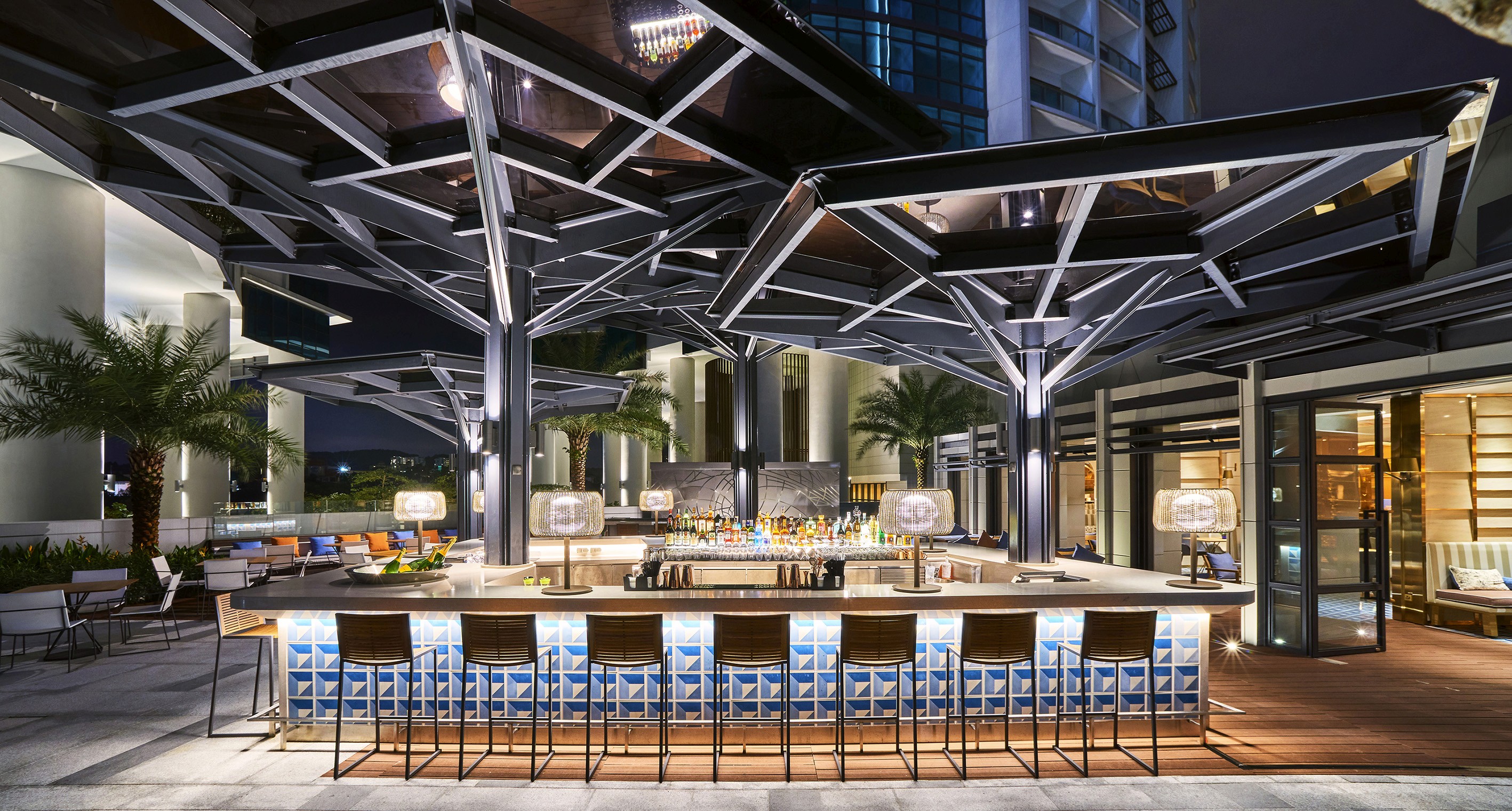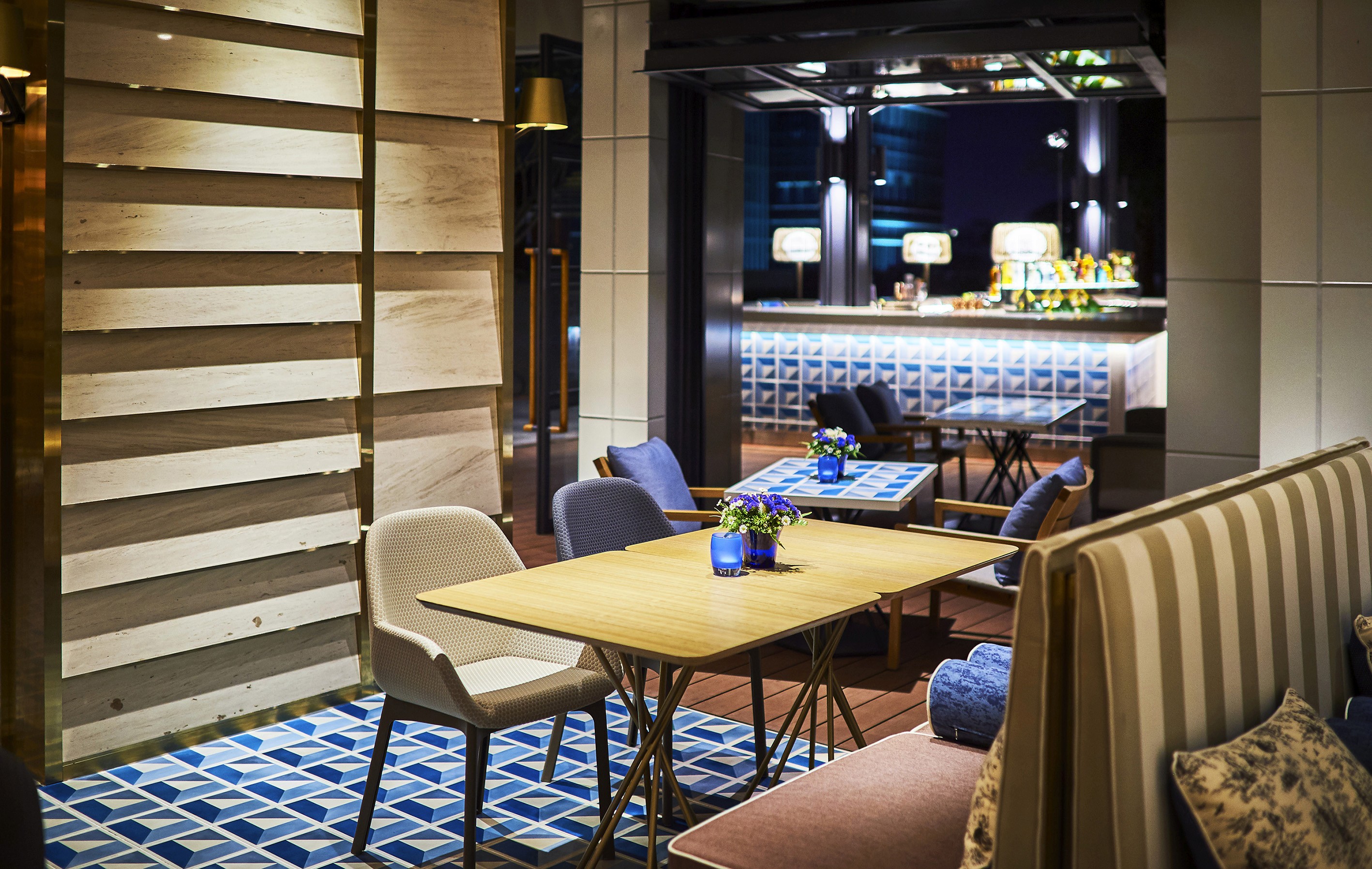 Nizza sat in a contemporary and casual-lifestyle setting, adopts an eminent palette of crisp whites, sunset-orange & hues of the coastline, meanwhile elaborates a bustling, stylish embellishment. Walking through the oversized pivot doors, patrons are immersed into the Riviera with lyrics & imageries of the place depicted in watercolor finishes across the ceiling. The design language is chic & effortless. As dusk comes forth, the French porte is lifted up to create a seamless flow thru a setting of cabanas and lounges to the open-air bar; accented with parasol-inspired canopies & shades of geometrical azure.