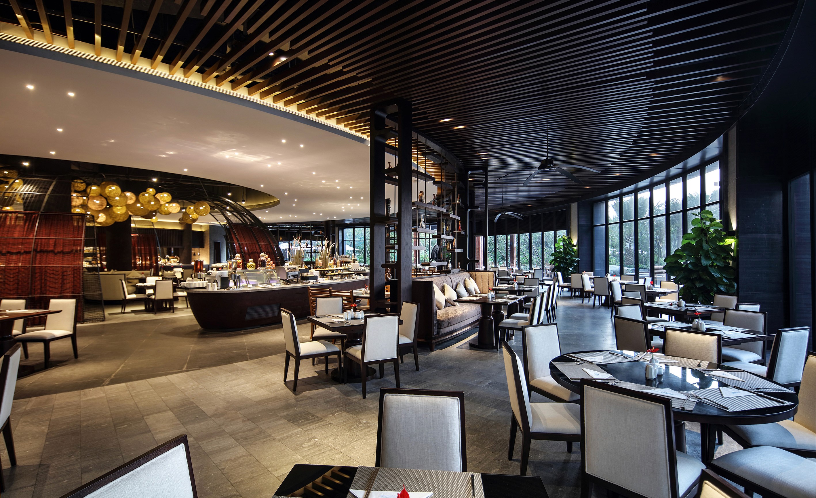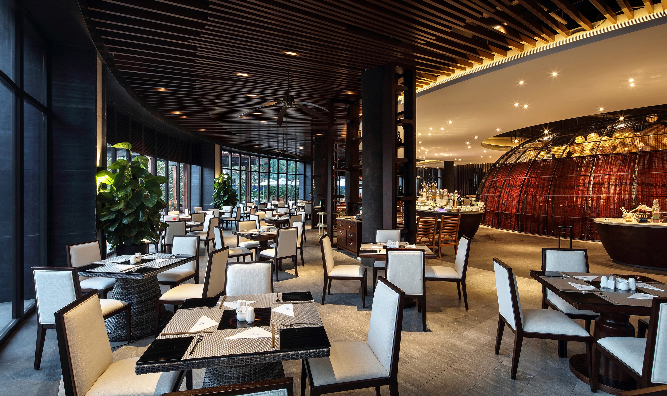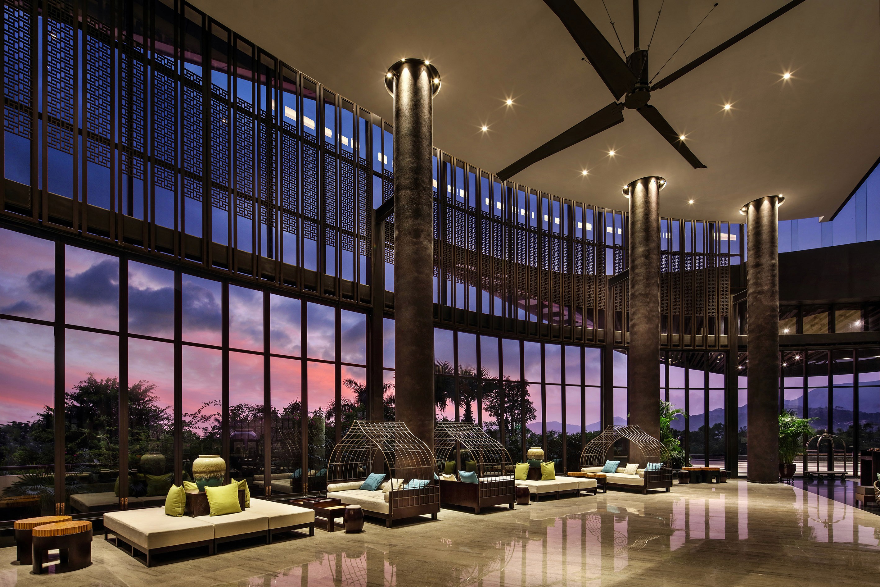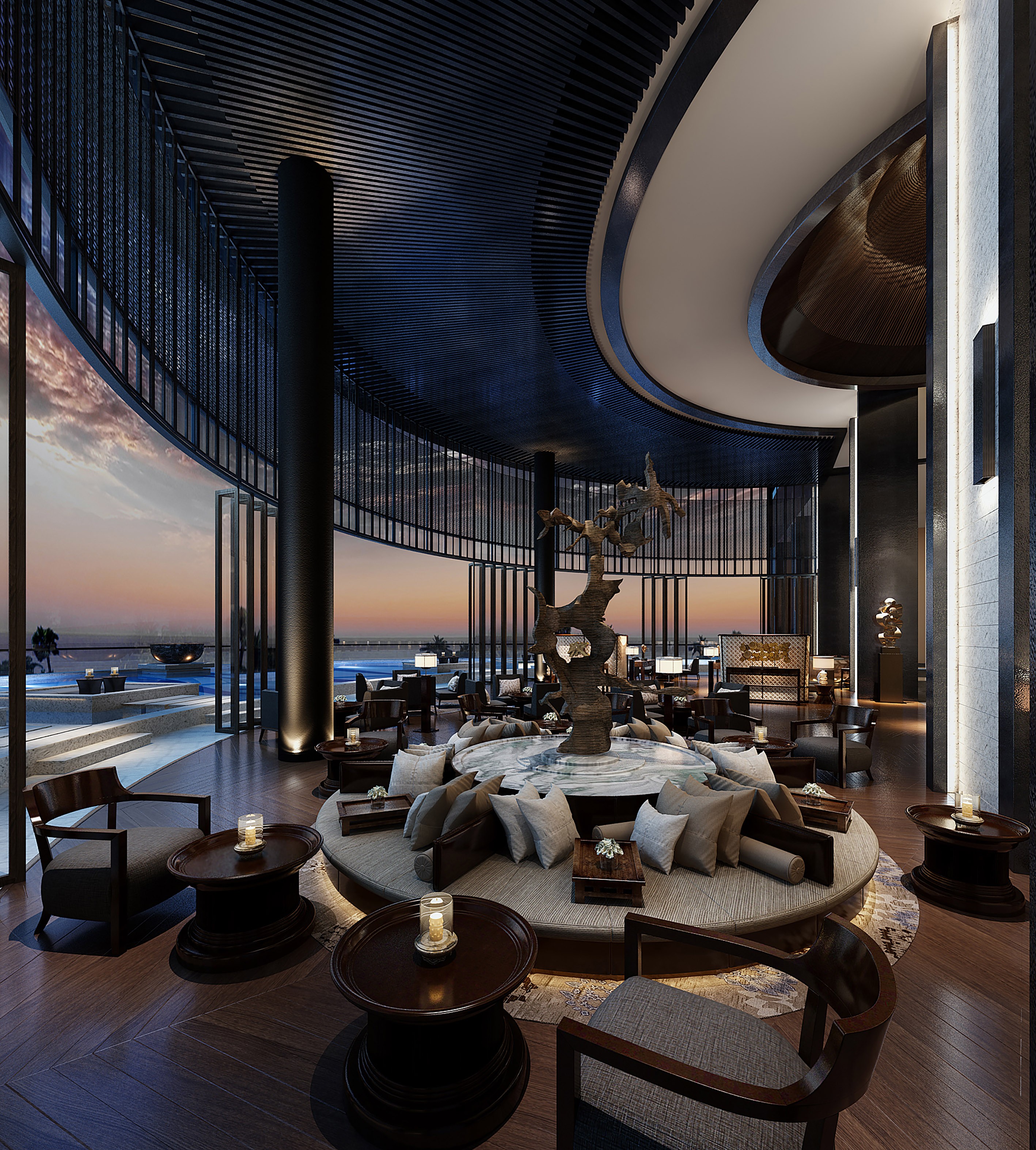 Surrounded by the beauty of mountain and sea, Sandalwood Resort Huizhou conjured a sense of tranquillity throughout the hotel. Stunning modern resort with a creative blend of modern and a touch of oriental elements, this resort becomes an oasis of luxury and serenity. A sensuous approach spacious lobby that celebrate nature and highlighted with designer piece that influence from modern tropical elements create stunning yet relaxing environment. The juxtaposition of rough yet richly textured and polished surfaces envelope the entire resort. Earthy tones unite with subtle hints of nature inspired colour compliment the overall ambiance.