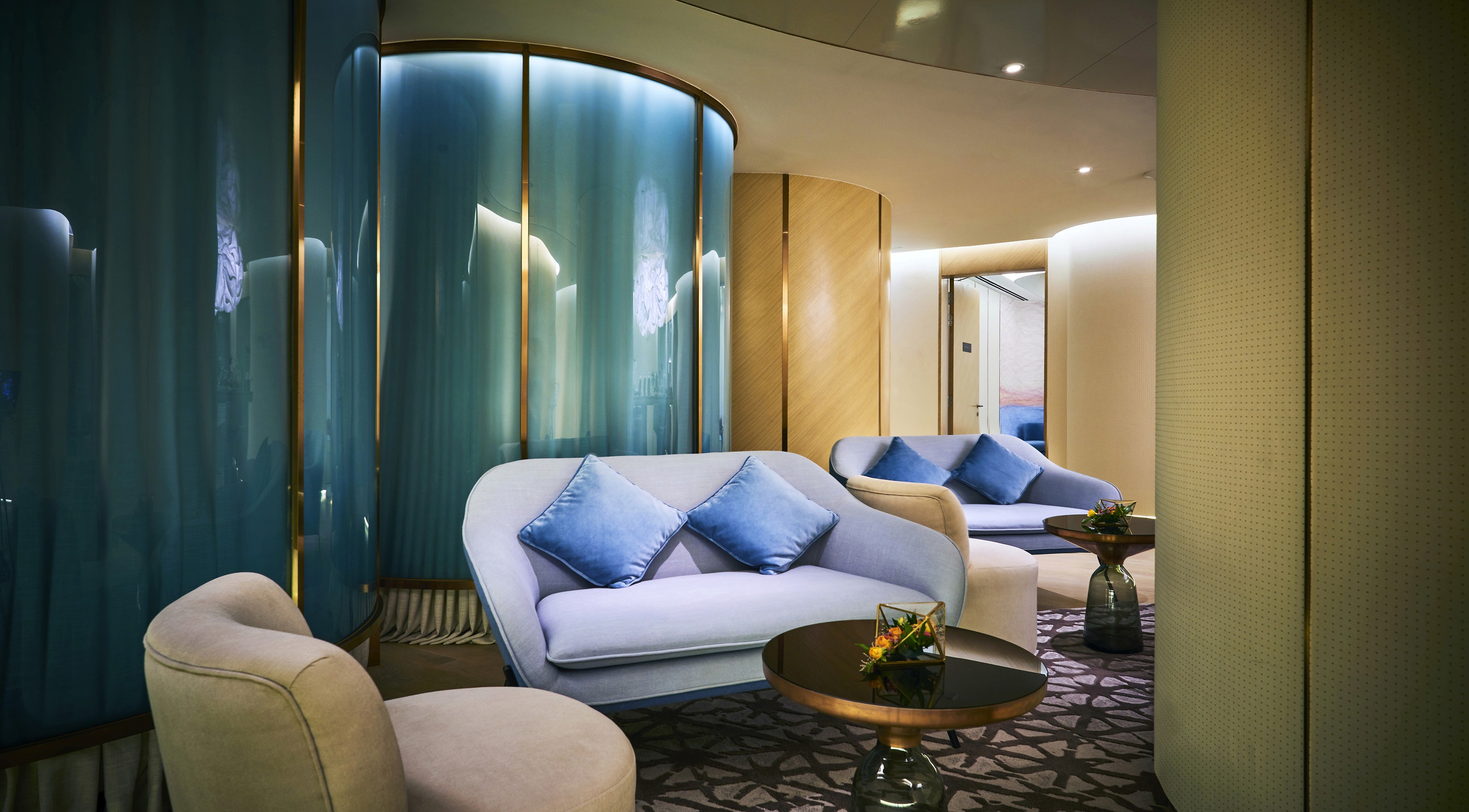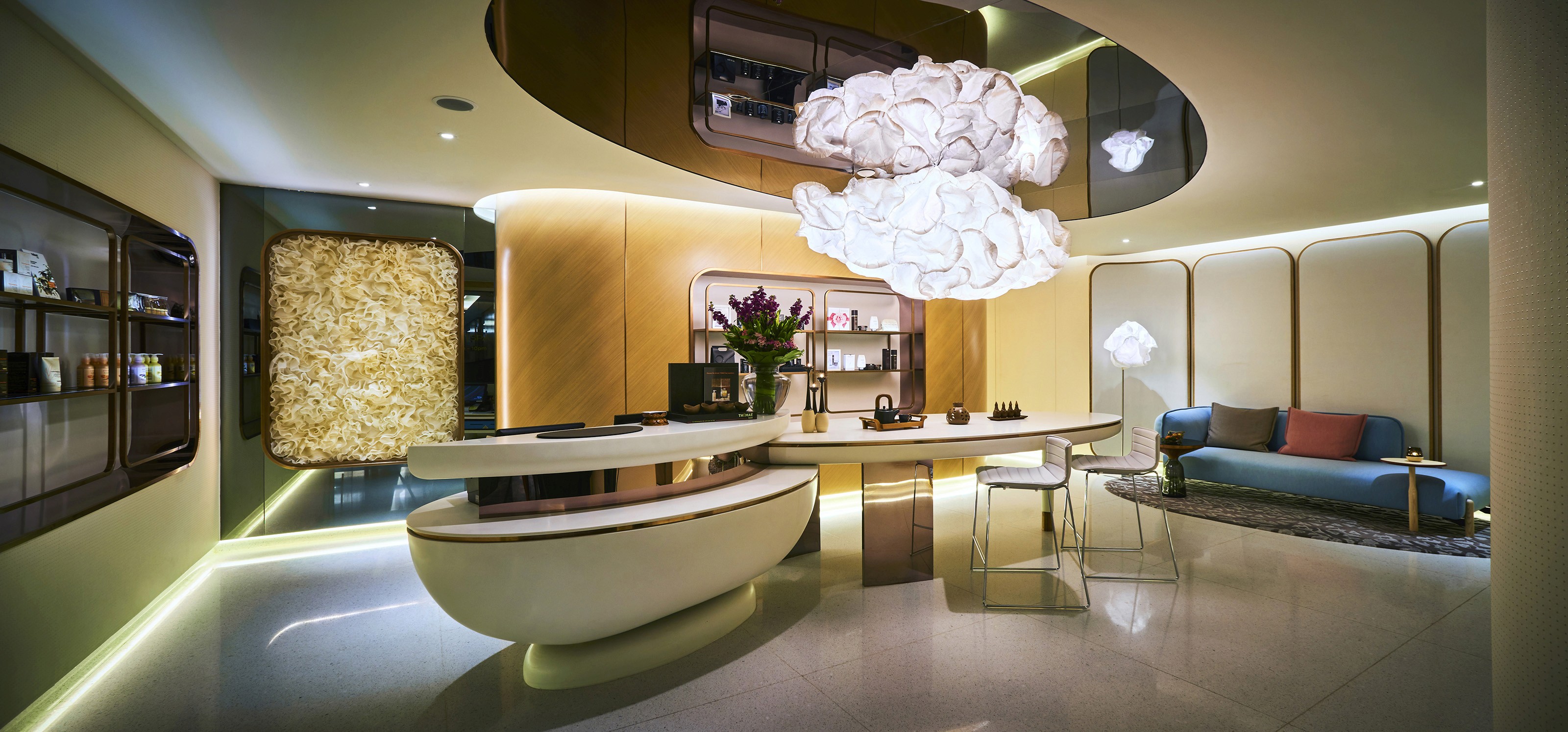 Like clouds, a seamless passage moves beautifully with the soft edges of curved glass, organic furniture and sculptural wall panels. Carefully selected furniture pieces and bespoke counters designed to curve elegantly within the internal layout romanticise the spatial experience. The design language is fluid and effortless.