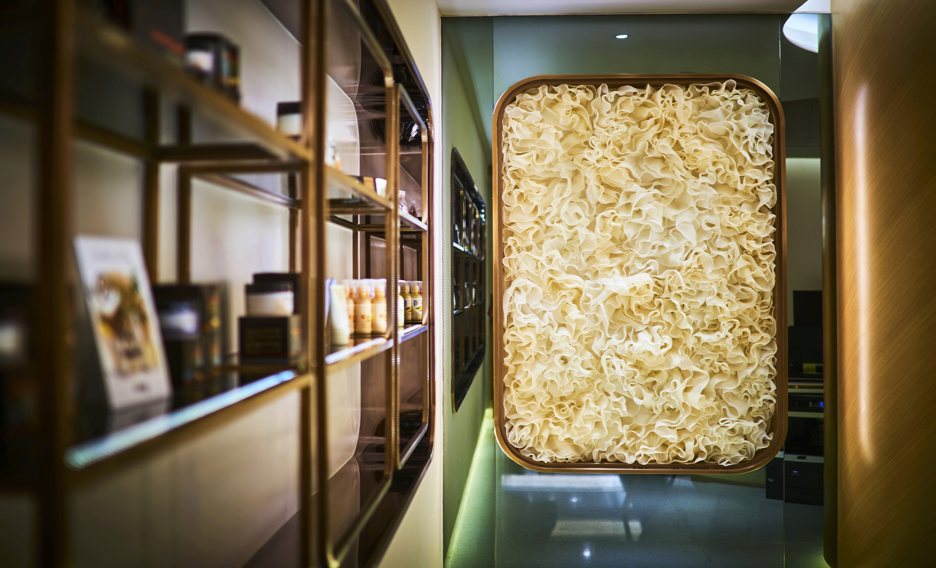 As a whole, the interior identifies with lightness, calming atmosphere and an ethereal sensation. Consumed by a graceful demeanour, the finishing touches are art pieces that are inspired by French Chinese couturier, Yiqing Yin’s free-formed sculptural designs. The sculptures are detailed with gentle folds and flows of sheer fabric in layers that ultimately depict the joy of being on cloud nine.