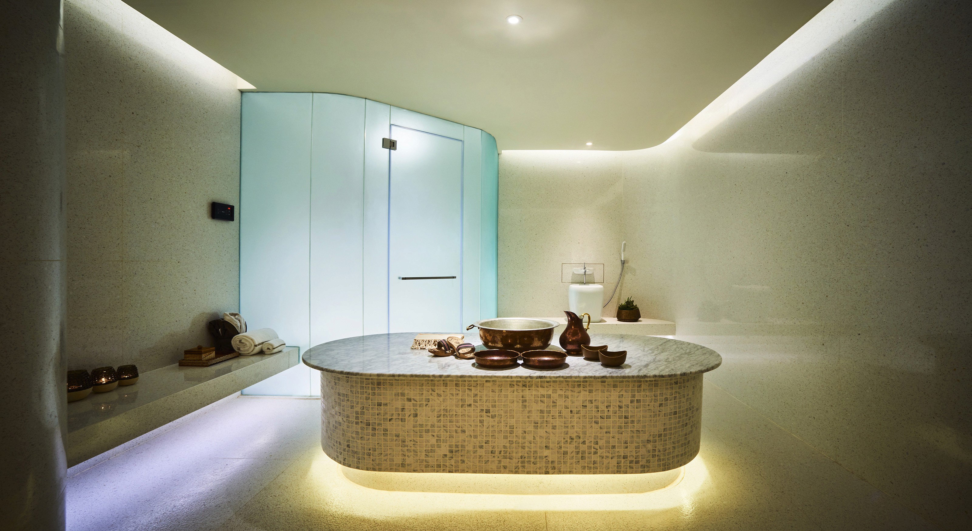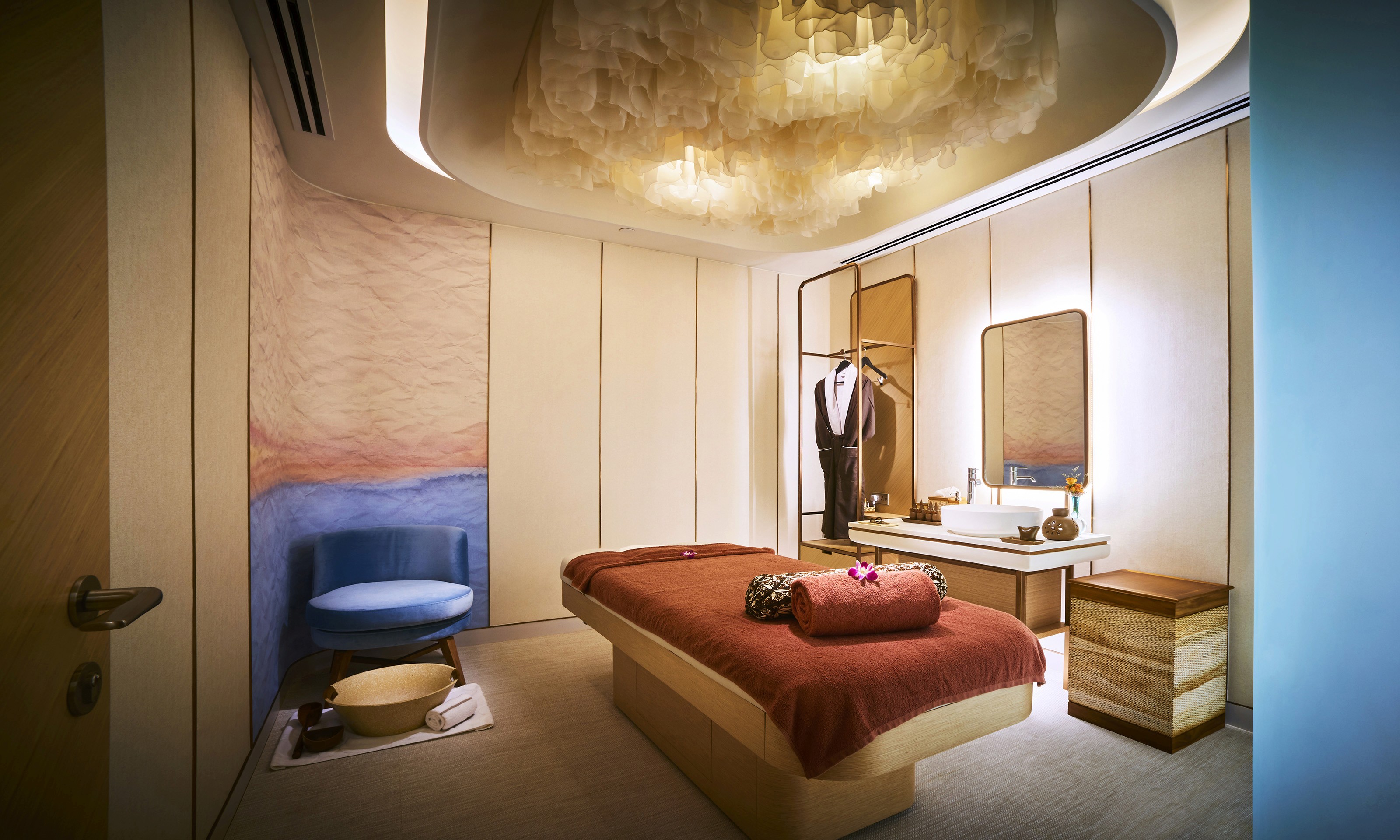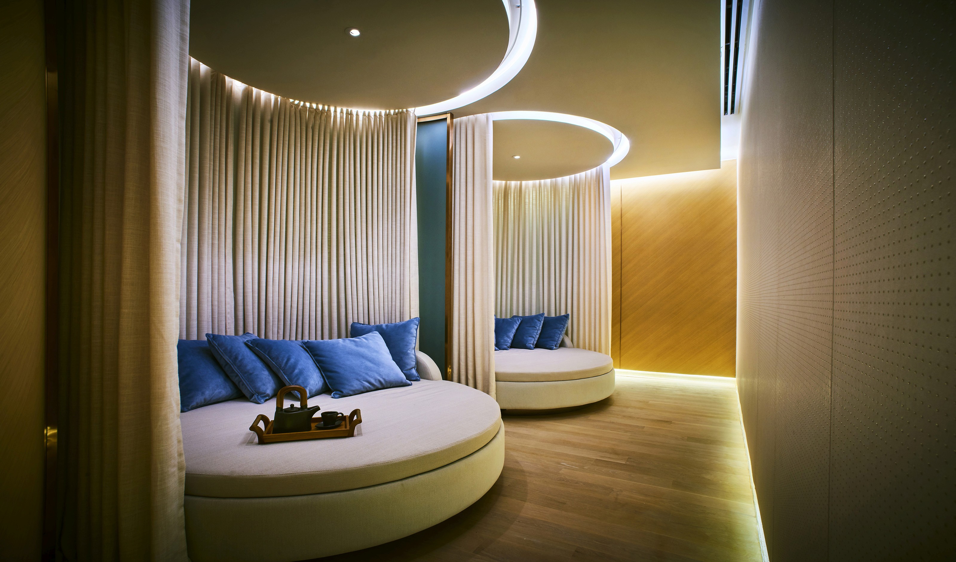 Located within the premise of Sofitel Kuala Lumpur, So Spa by Sofitel adopts an immaculate palette of rich creamy whites and hues of dusty blue. Enchanted by soft clouds, the interior space is elaborated with an alluring softness through imaginative use of textures, materials and lighting. The blend of neutrals and rose gold tones highlight the flicker of sunlight piercing through the voluminous fluffy clouds. Softened light that permeates subtly accentuates every curvature and shape within the internal spaces.