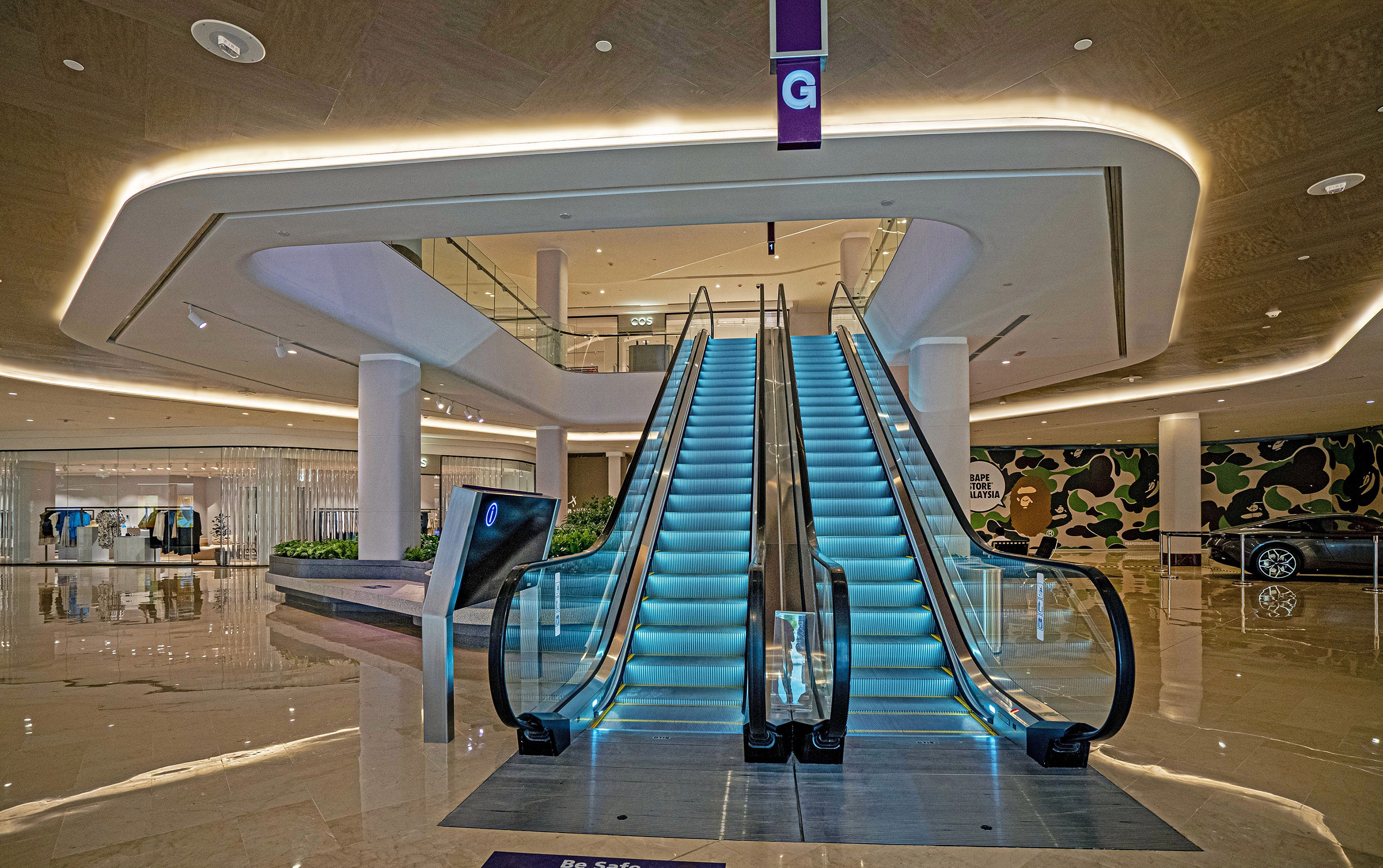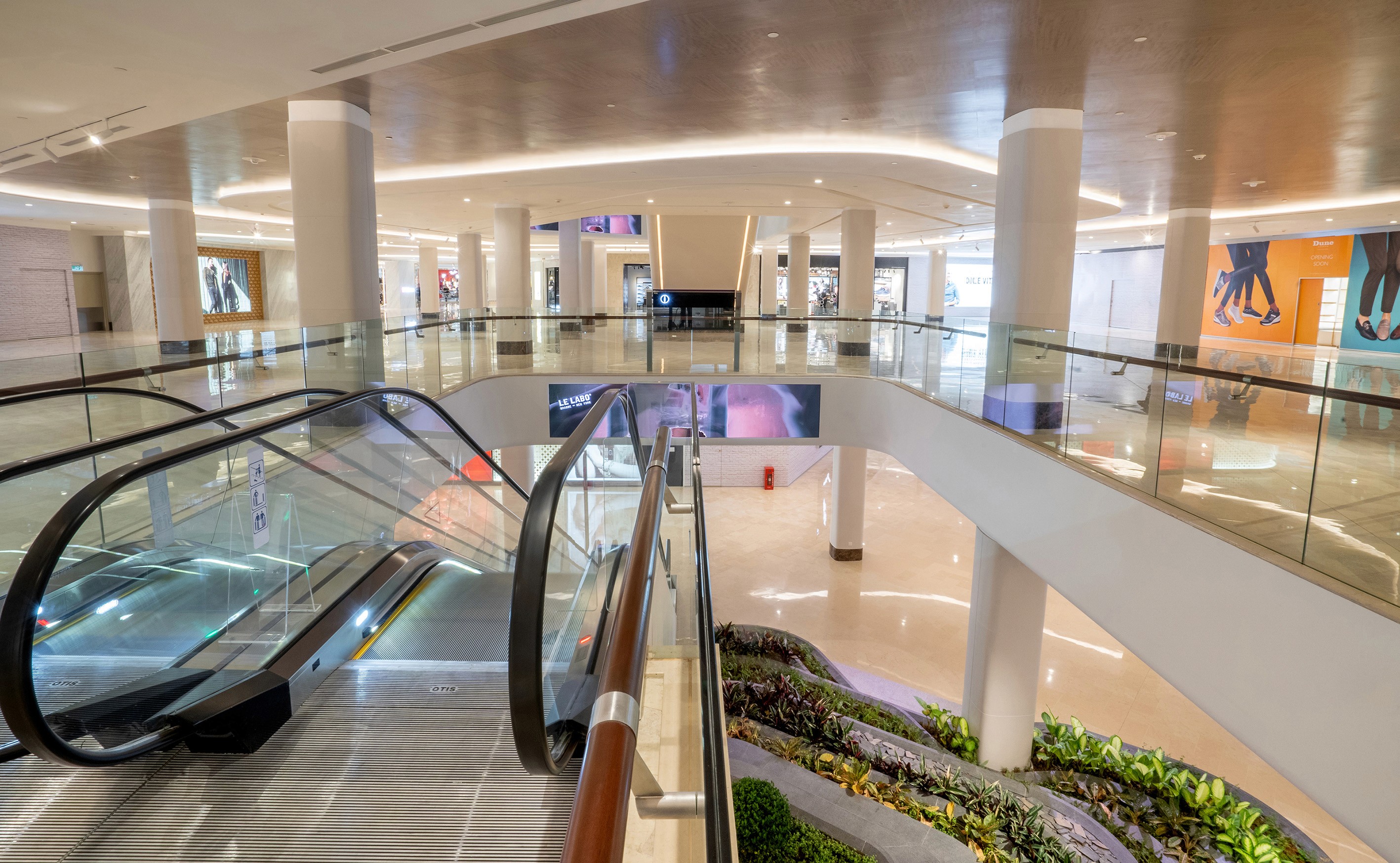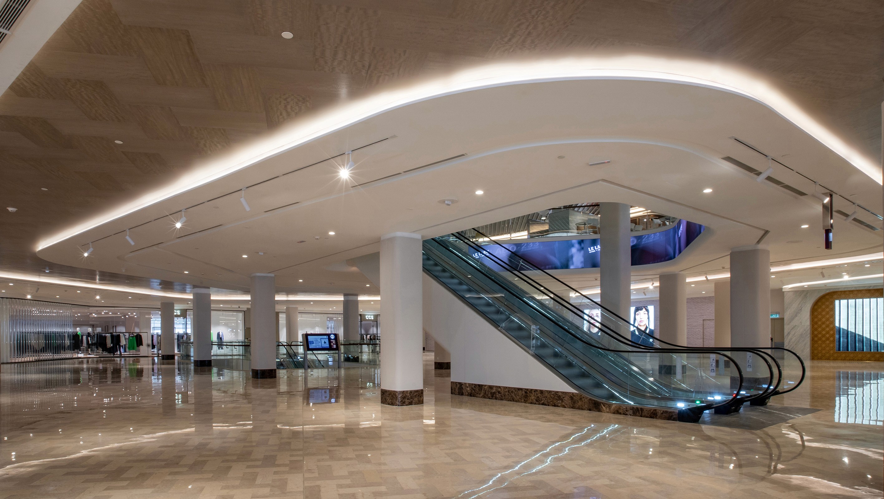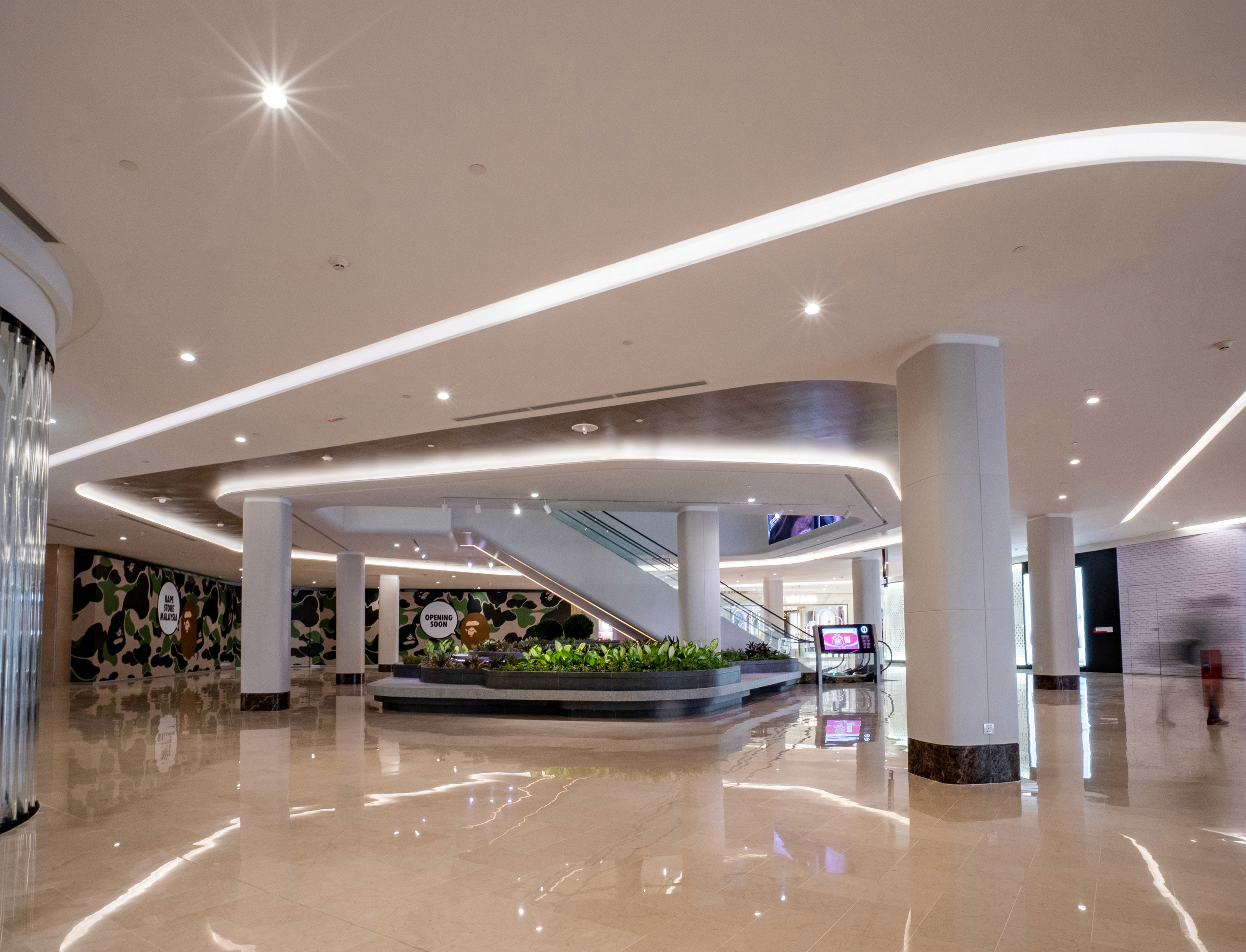 In the heart of Kuala Lumpur, a lush park and a renowned mall blend seamlessly through recent renovations. The mall, established in 1997, features timeless beige marble floors with deep red borders and brass shopfront details that gleam under skylight. The renovation aimed to integrate the park's natural beauty with the mall's luxury, subtly updating the space without overwhelming the existing design. The former anchor tenant space was transformed with beige marble in a herringbone pattern, omitting the red border. An undulating ceiling with soft cove lighting mimics the flow of water, guiding visitors to the new section. A small garden with granite benches, inspired by park fungi, invites relaxation. The renovation used similar materials and curved organic forms to create a cohesive flow, merging the interior with the exterior park seamlessly.