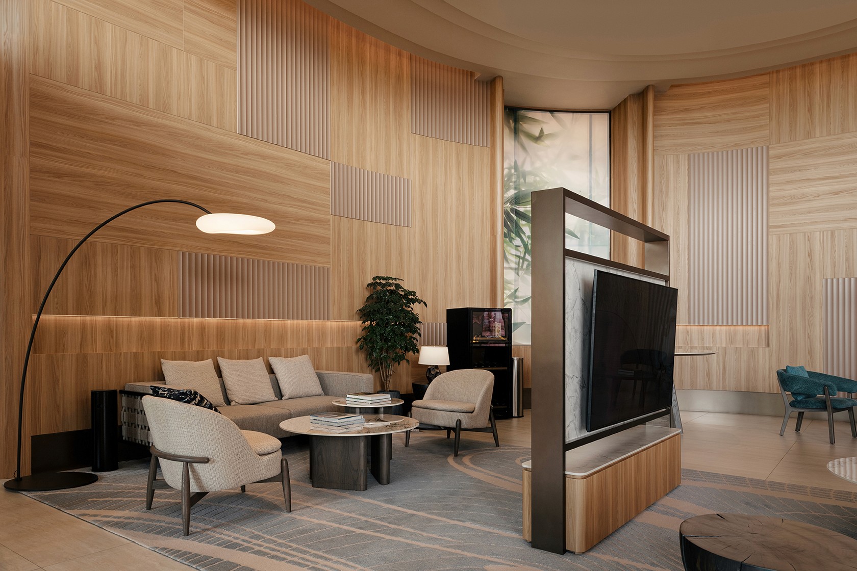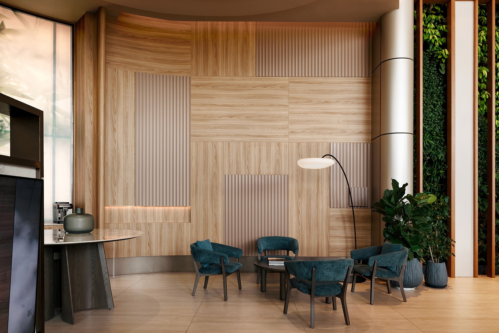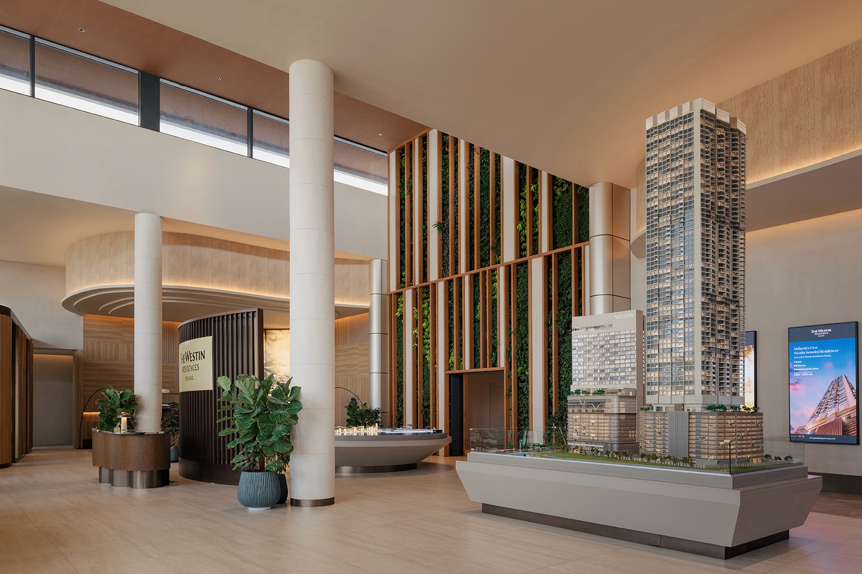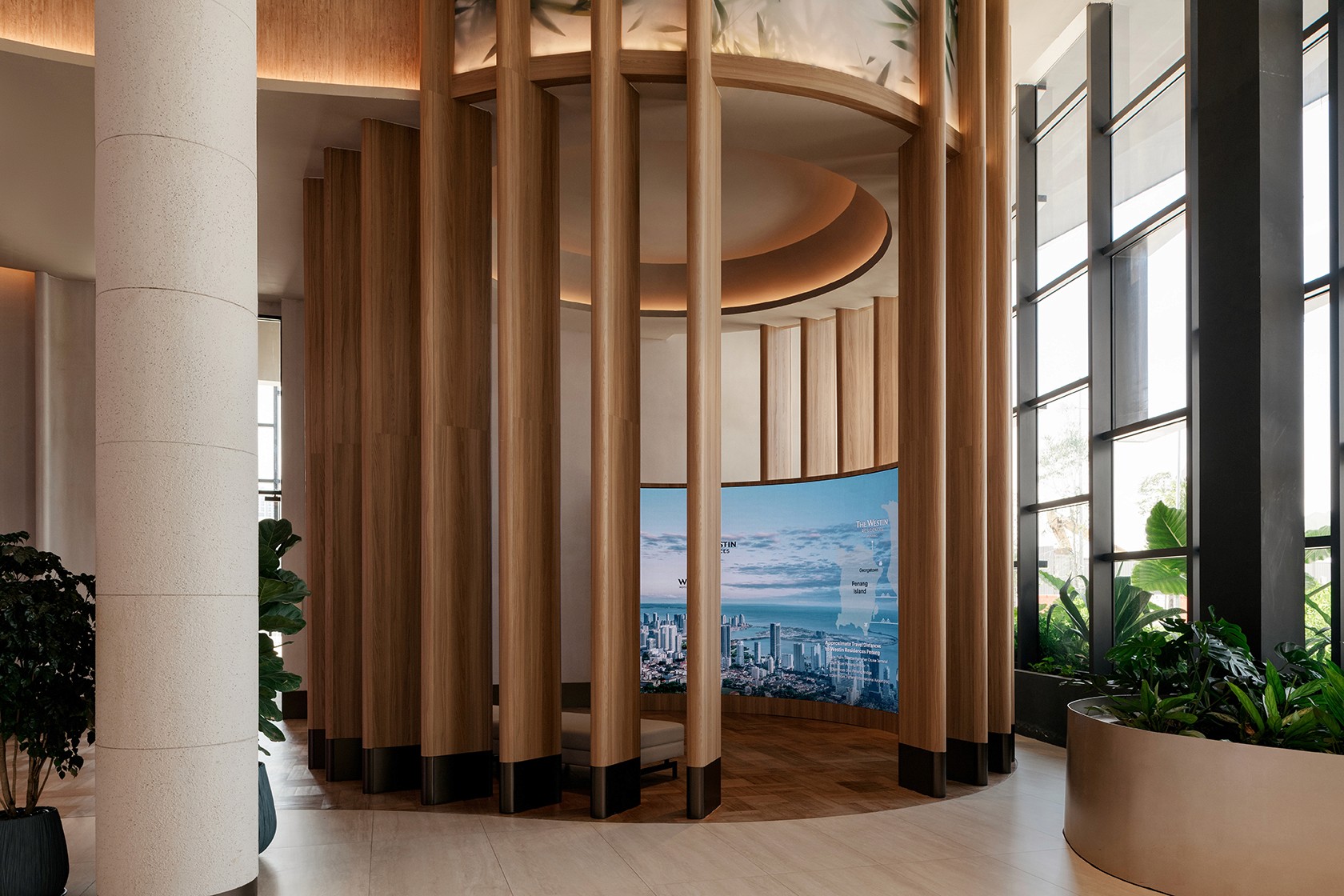The Westin Residences Penang Sales Gallery draws inspiration from oceanic fluidity and Penang’s Botanical Gardens to create a biophilic, sensory experience. A fluid spatial journey takes visitors from arrival and reception through site and project models, immersive digital showcases, and finally to intimate lounge and meeting spaces. The design embodies a soft, warm, and light mood, accented by fresh ocean hues. Natural textures — timber, stone, fluid fabrics — and greenery foster a sense of well-being, while diffused lighting enhances calmness. More than a showcase, the gallery sets the tone for the residences: living in harmony with nature, fluid, restorative, and refined.